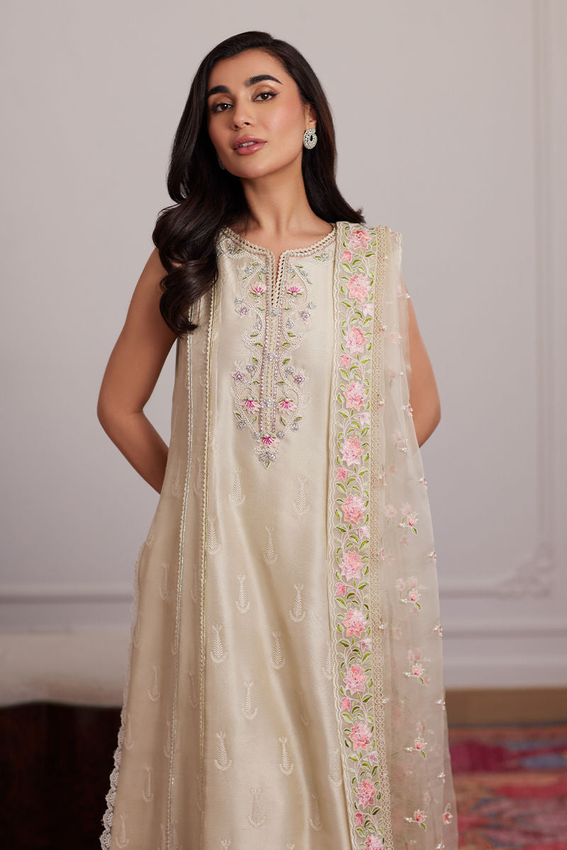 Experience the art of effortless elegance with this stunning pearl beige ensemble. The five-paneled long kalidaar creates beautiful volume, offering a modern yet timeless silhouette. The delicately flattering neckline, embellished with pearls, adds a touch of understated glamour. The hem is finished with contrasting floral borders, enhancing the romantic aesthetic of the entire outfit. Paired with pure raw silk pants, the look is completed with an exquisite organza dupatta, adorned with floral blooms and subtle pearl accents throughout, alongside a delicate floral border around the edges. This ensemble exudes grace and sophistication, making it a beloved and essential addition to any wardrobe.