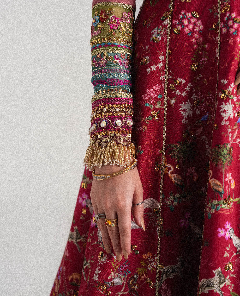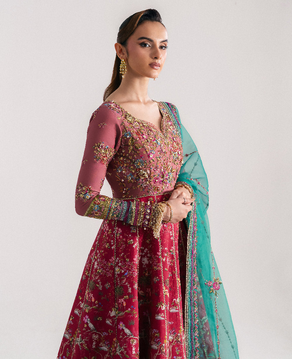 This 12-paneled printed pishwas in hot pink raw silk has a soft lace touch on the hem, between the panels gives a bold yet graceful look. The shikargah-inspired blouse is decorated with rosewood-colored florals and golden sequins that shine with movement. The sleeves have contrast pattis with tassels. A teal dupatta completes the outfit with vertical floral vines and lace for an elegant finish.