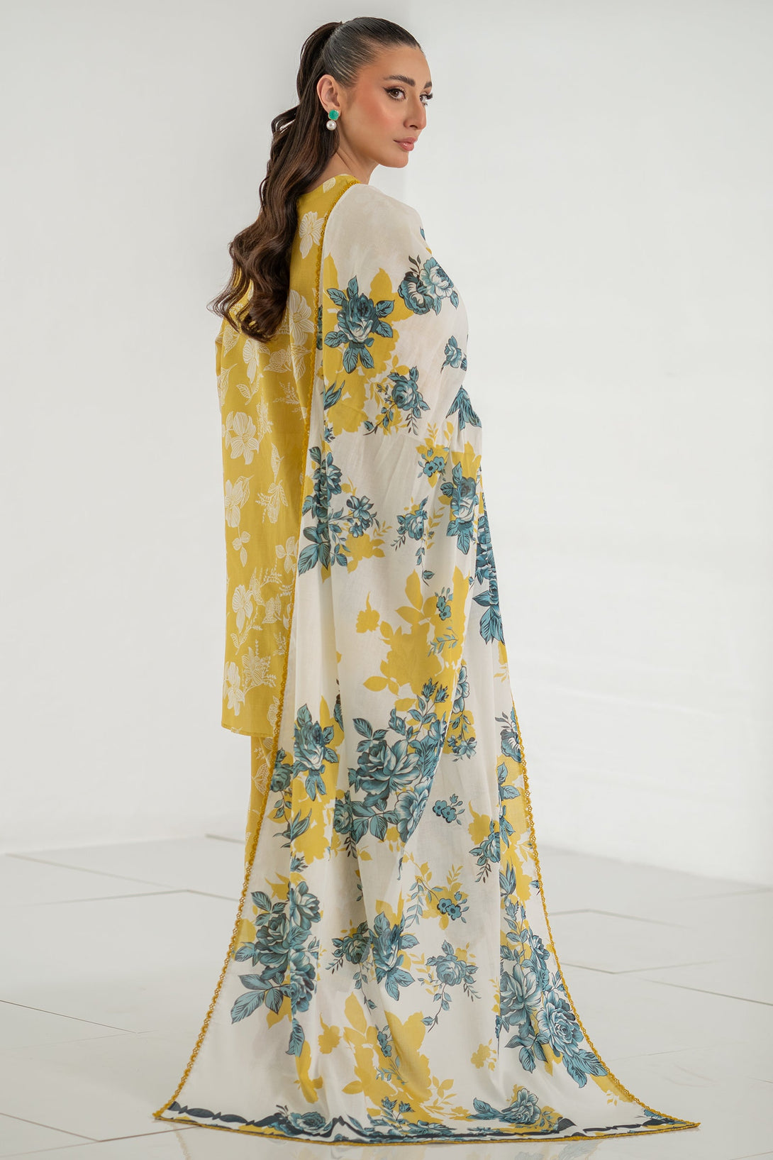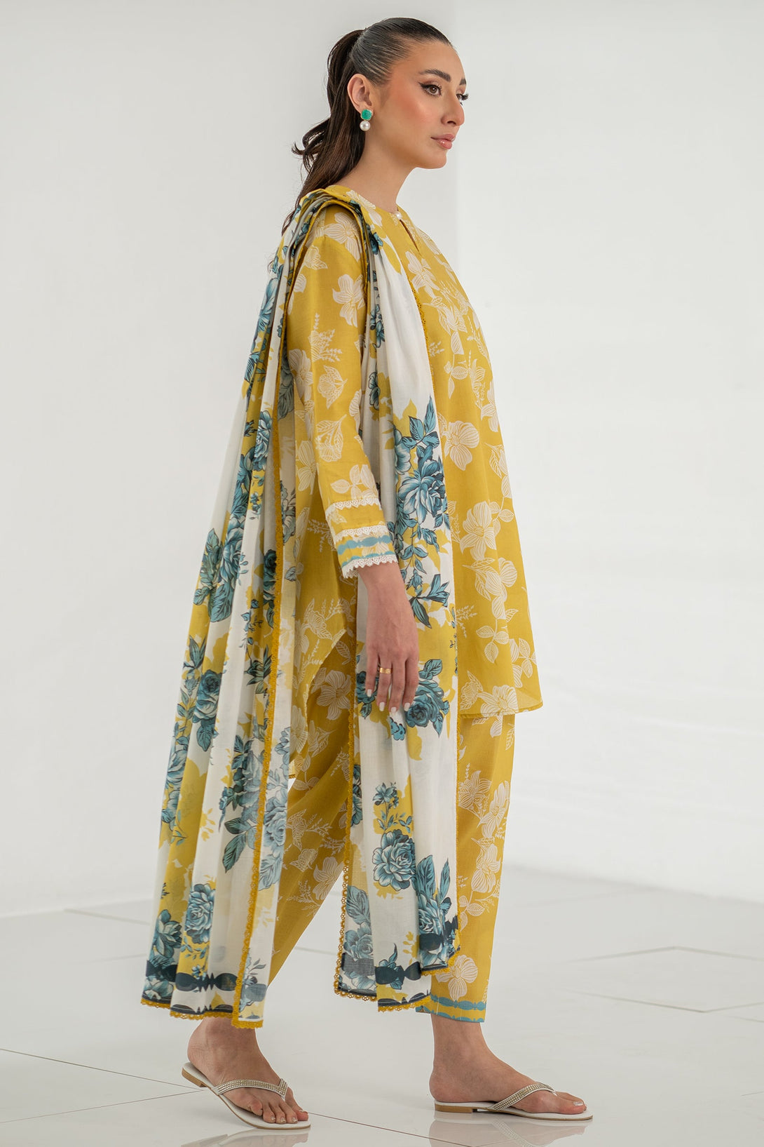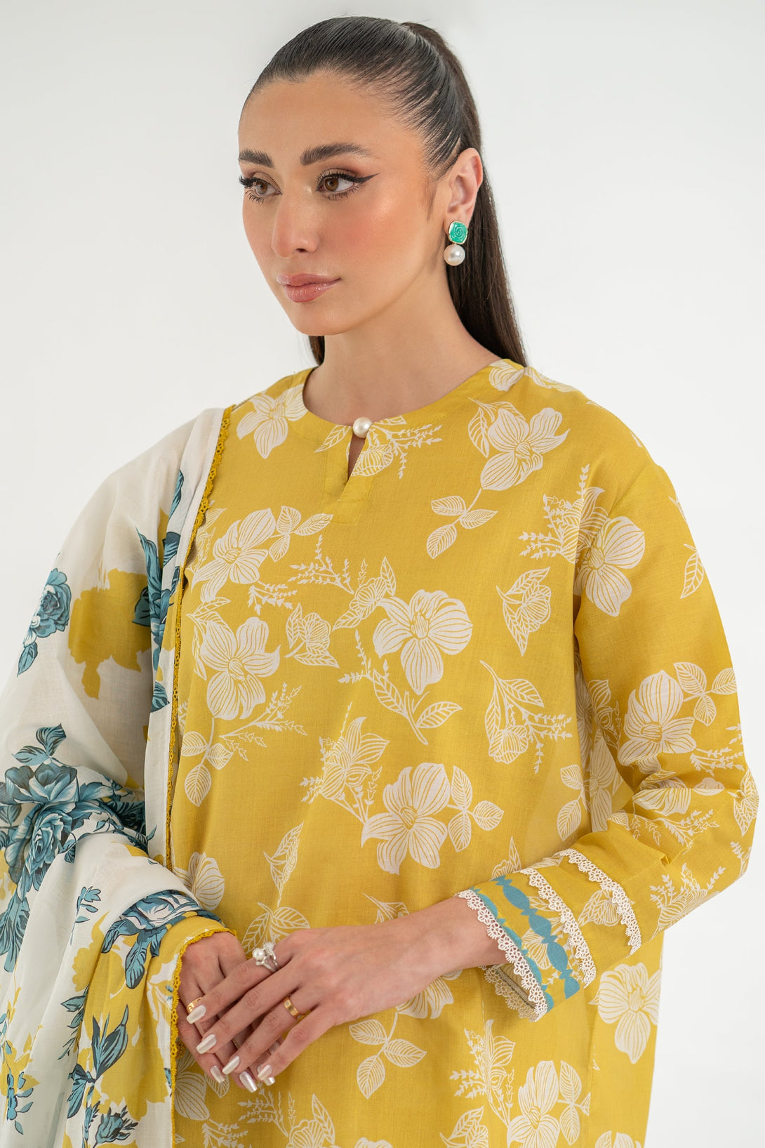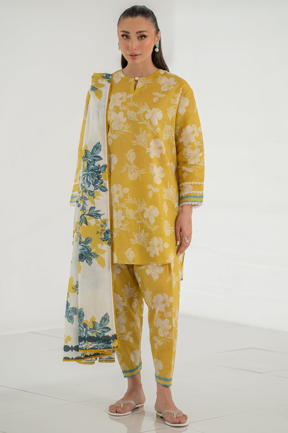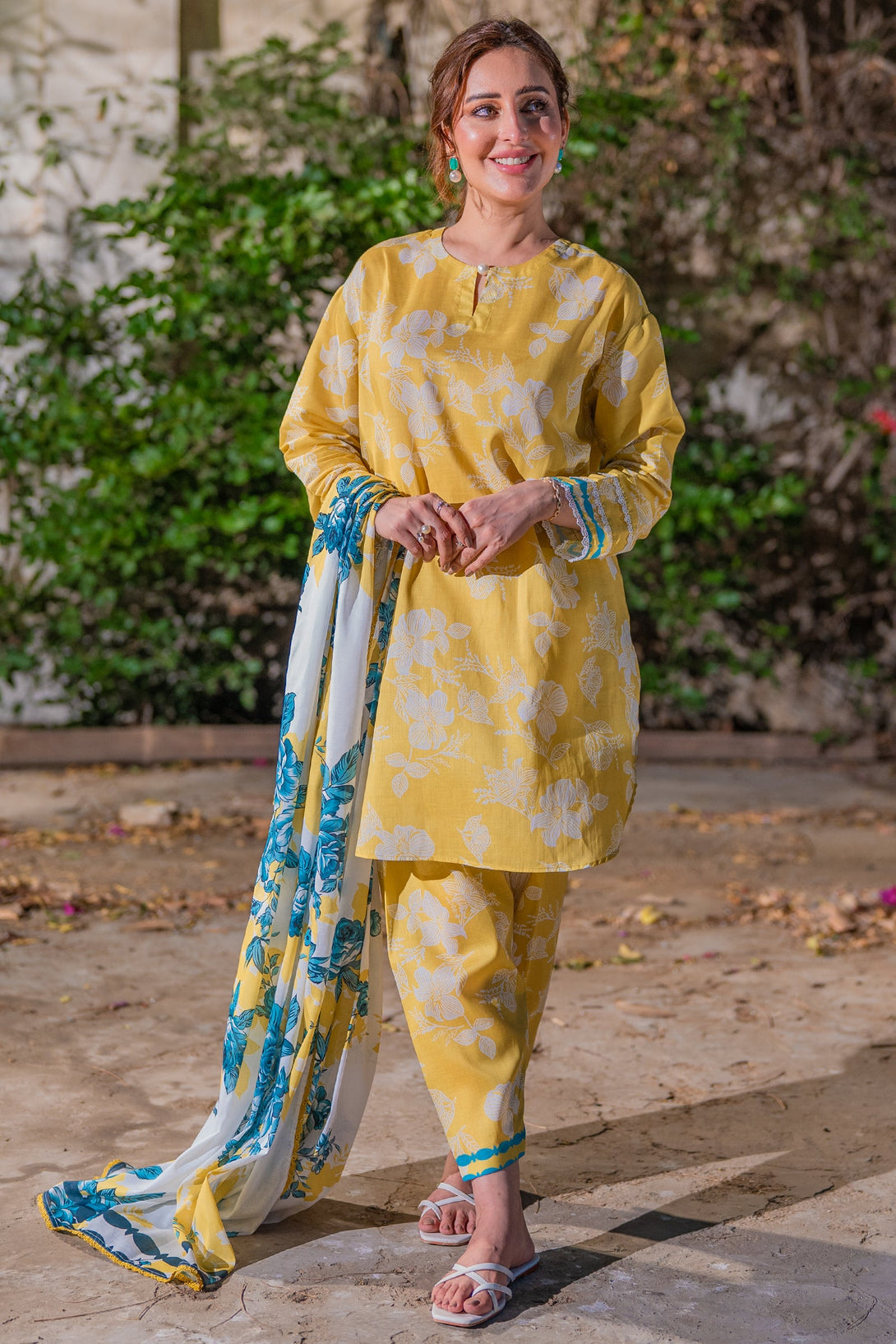 Refresh your wardrobe with this yellow colored digital print three-piece unstitched