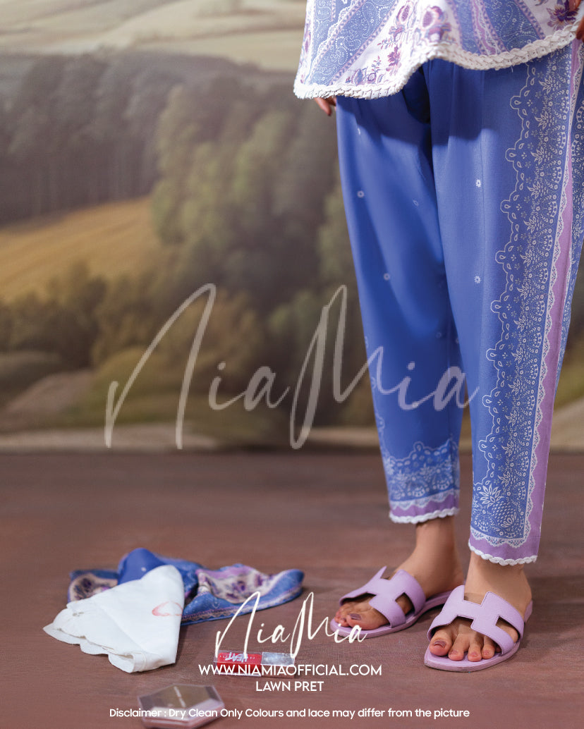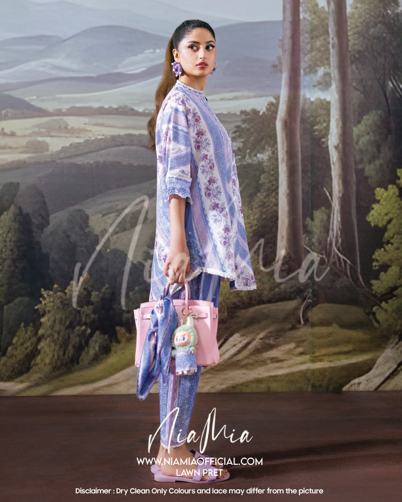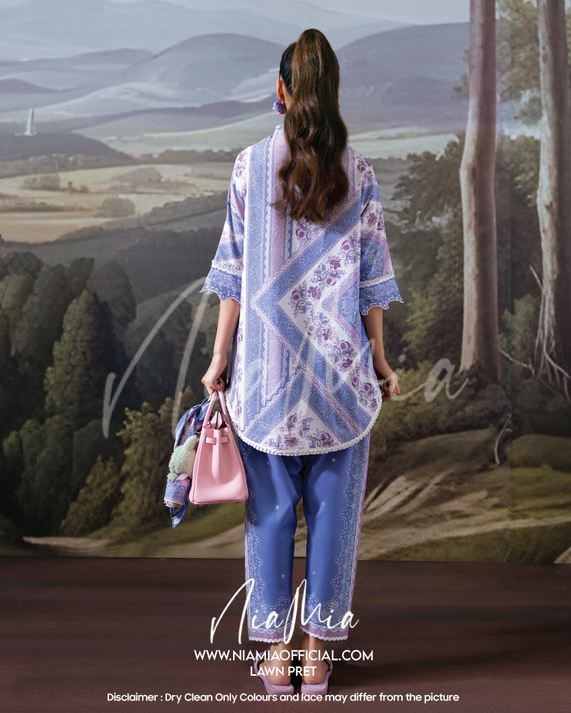 A two-piece printed set in rich purple, patterned with a mix of geometric designs and soft florals. The neckline is adorned with a fine lace trim, while delicate cutwork adds texture to the sleeves. Paired with a printed shalwar for a statement yet wearable summer look.