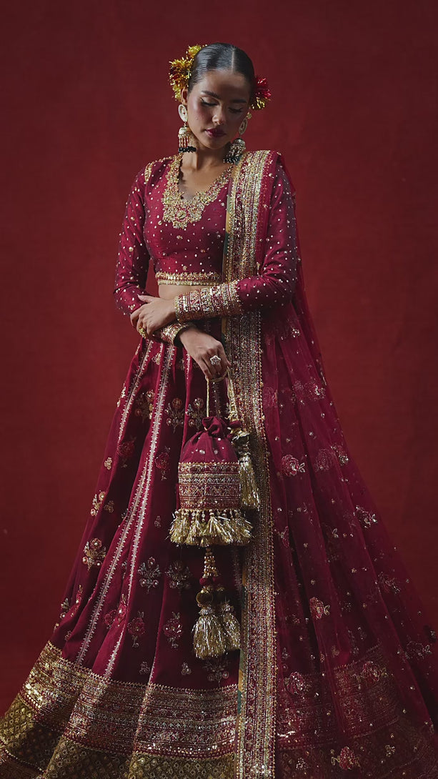 A stunning maroon lehenga choli adorned with rich tilla and badla embroidery, elevated by delicate adda work. Paired with a modern-cut choli, this ensemble blends regal craftsmanship with contemporary design for a truly refined look.