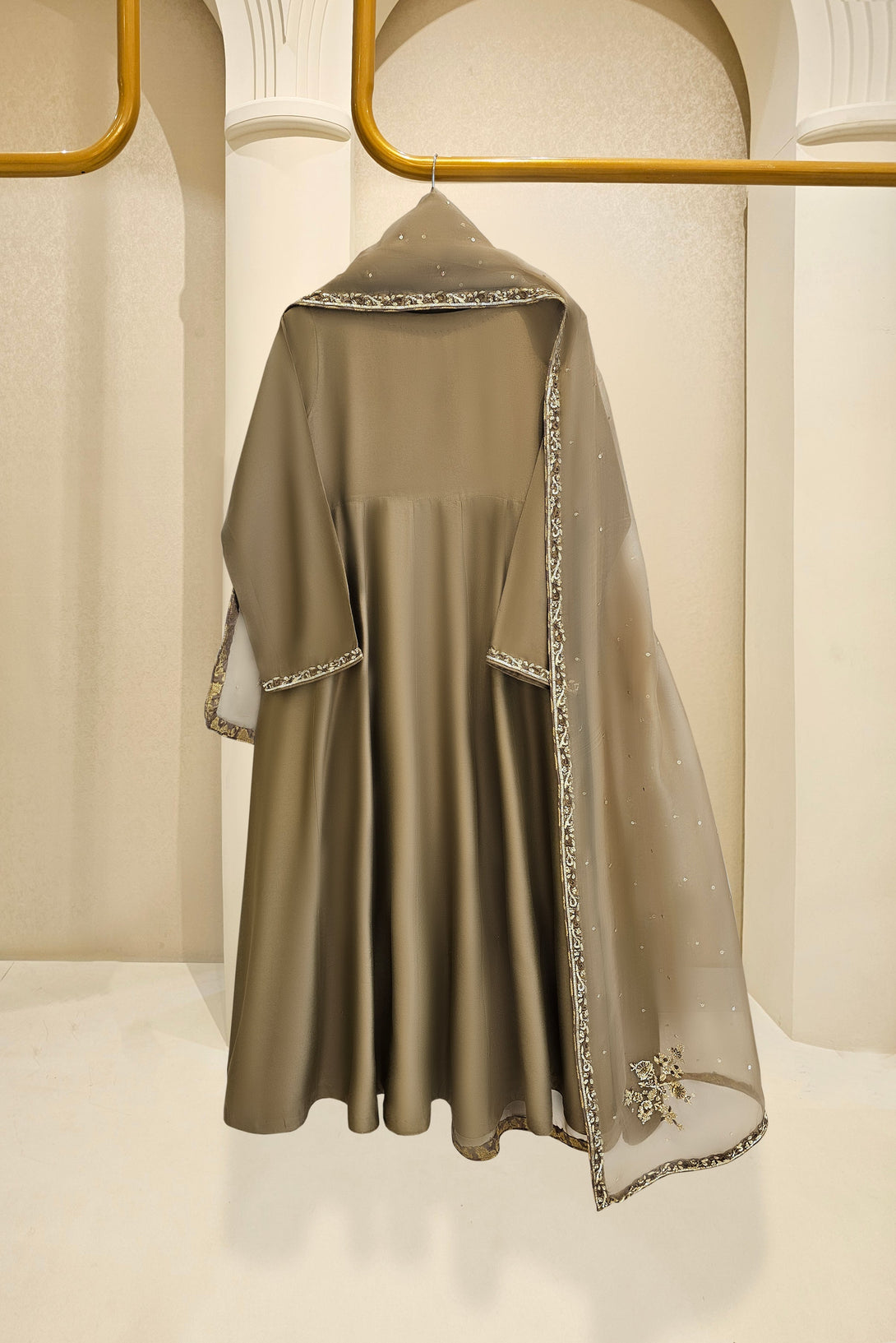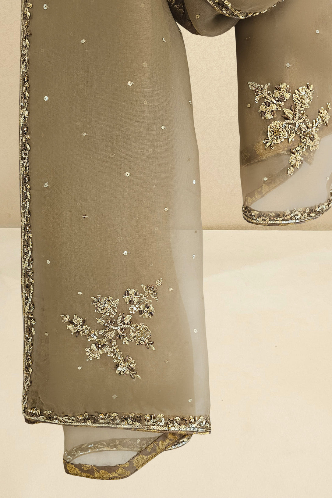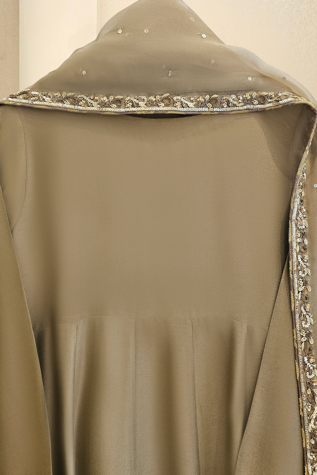 Canvassed on korean silk in a striking golden brown shade, heavily embellished with handwork/ada details in gold dabka, naqshi, sequins and nug stones on sleeves and pure soft tissue organza dupatta alongside an Izaar as seen. The alluring Heena Kalidaar is a beautiful addition to your wedding wardrobe.
