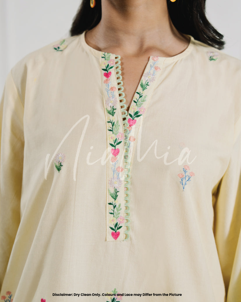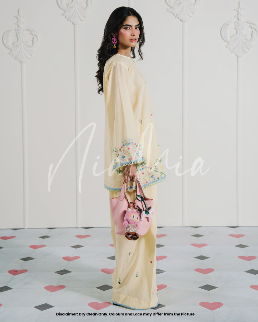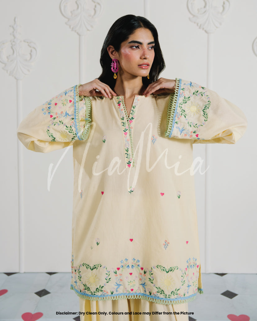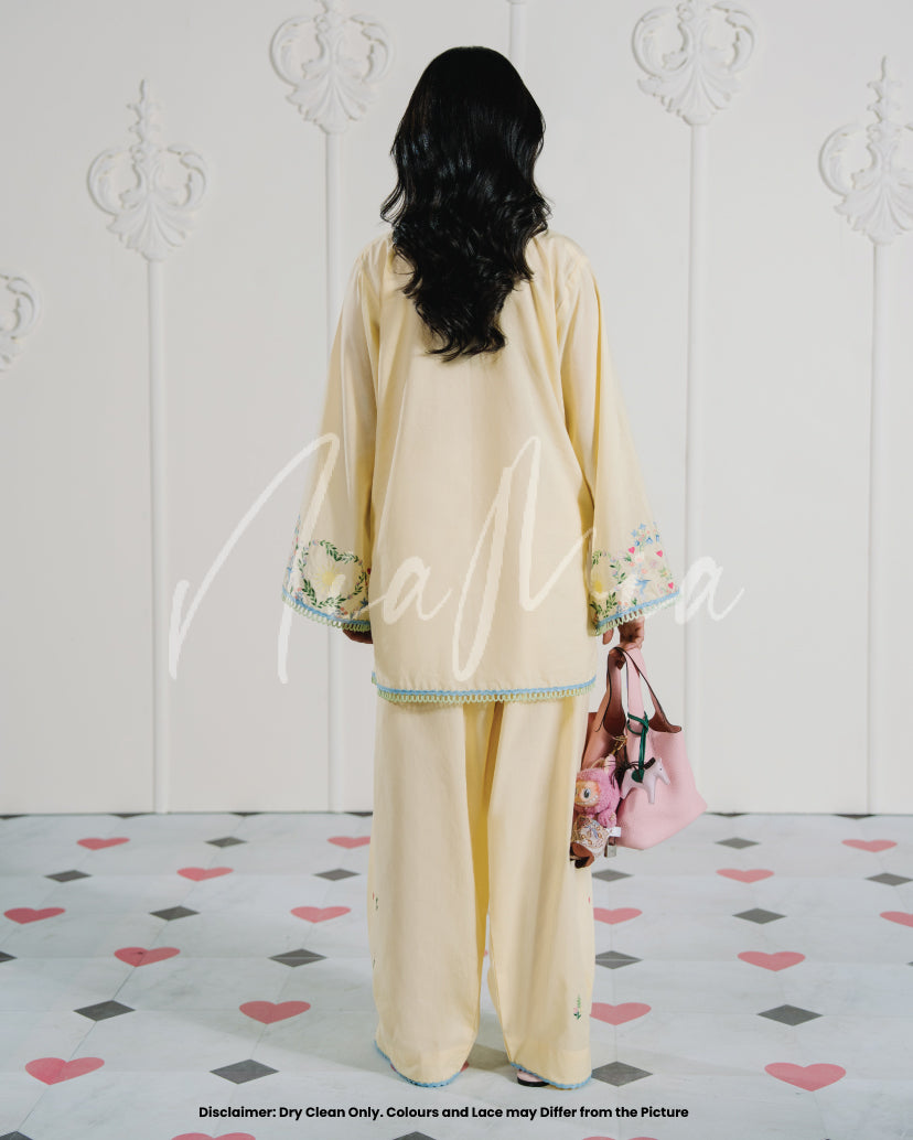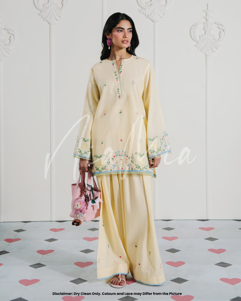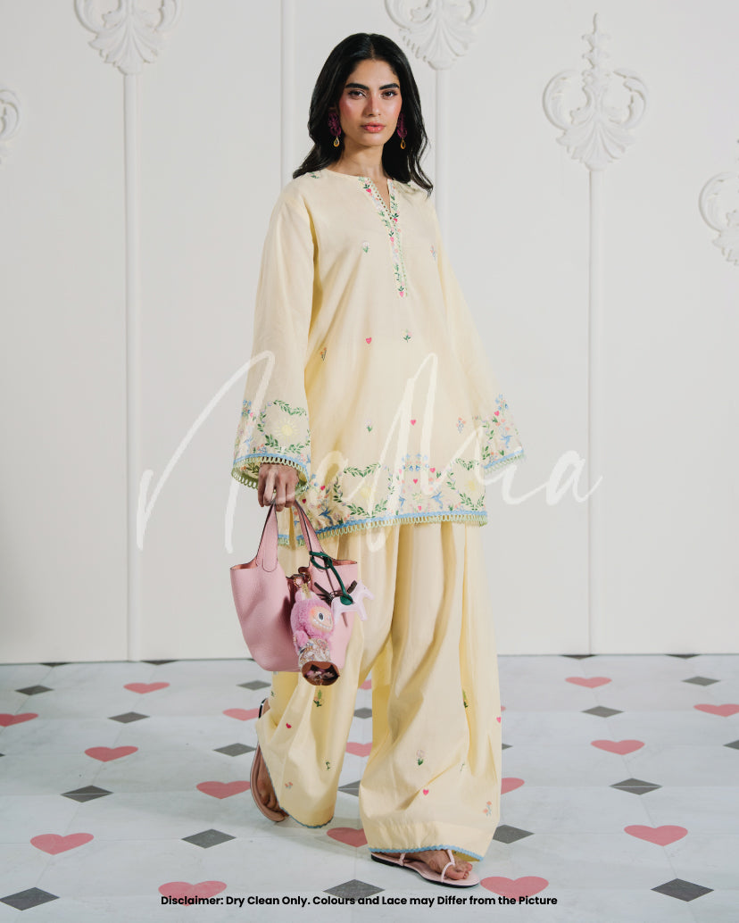 A two-piece lawn ensemble in soft butter yellow, adorned with pastel floral embroidery and tiny heart details. The shirt features a straight, easy silhouette with embroidered borders and light blue edging, paired with a farshi shalwar for a breezy daytime look that feels effortlessly fresh.