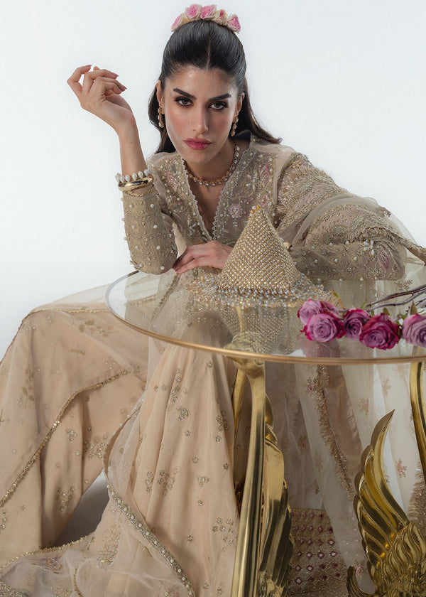 Purity and perfection come together in this floral based design that features a digitally printed organza gown with 3d crafting used to lift the base pattern . Offset with heavily crafted sleeves ,a gorgeous neckline and border all detailed with hand embellishments design whispers everything soft , feminine and romantic . Paired with a detailed dupatta and a soft silk sparkling lehnga.
