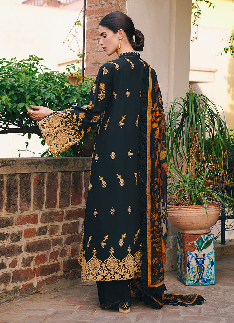 Kaisah in Black from our Summerkari '25 Collection. An embroidered cotton lawn 3-piece outfit paired with cotton cambric trousers & digital printed chiffon dupatta.