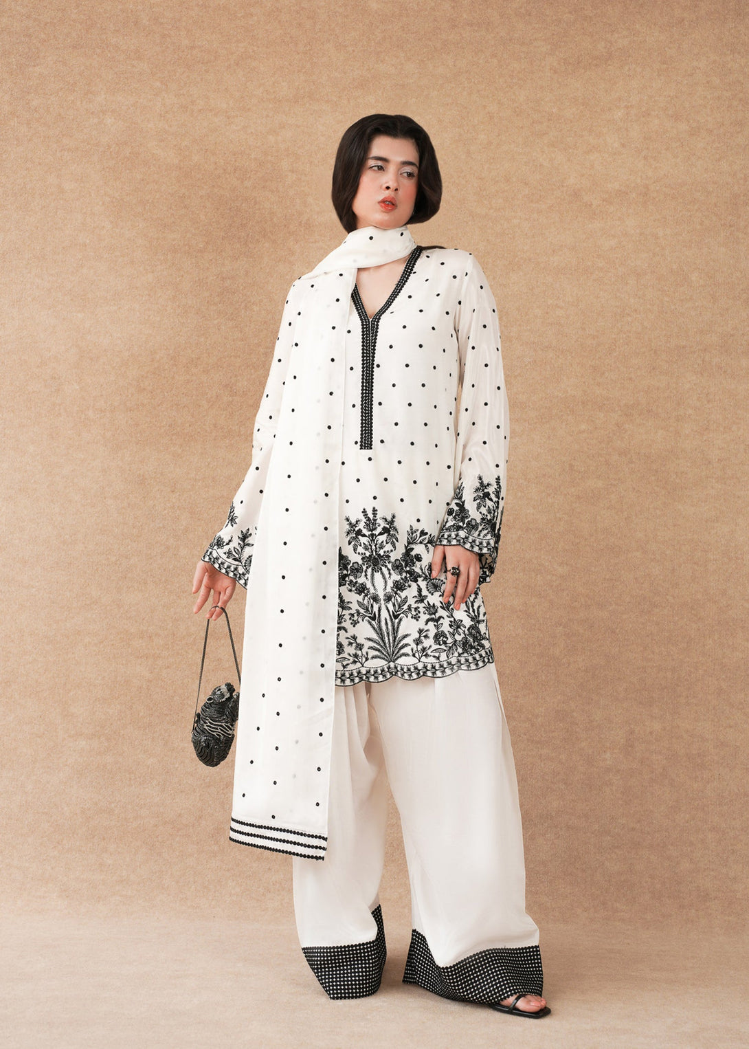 A white shirt featuring black embroidered florals rising from the hem, set against subtle black polka dots. Teamed with a white cambric shalwar finished with a thin black striped border. The ensemble is completed with a medium silk embroidered dupatta.
