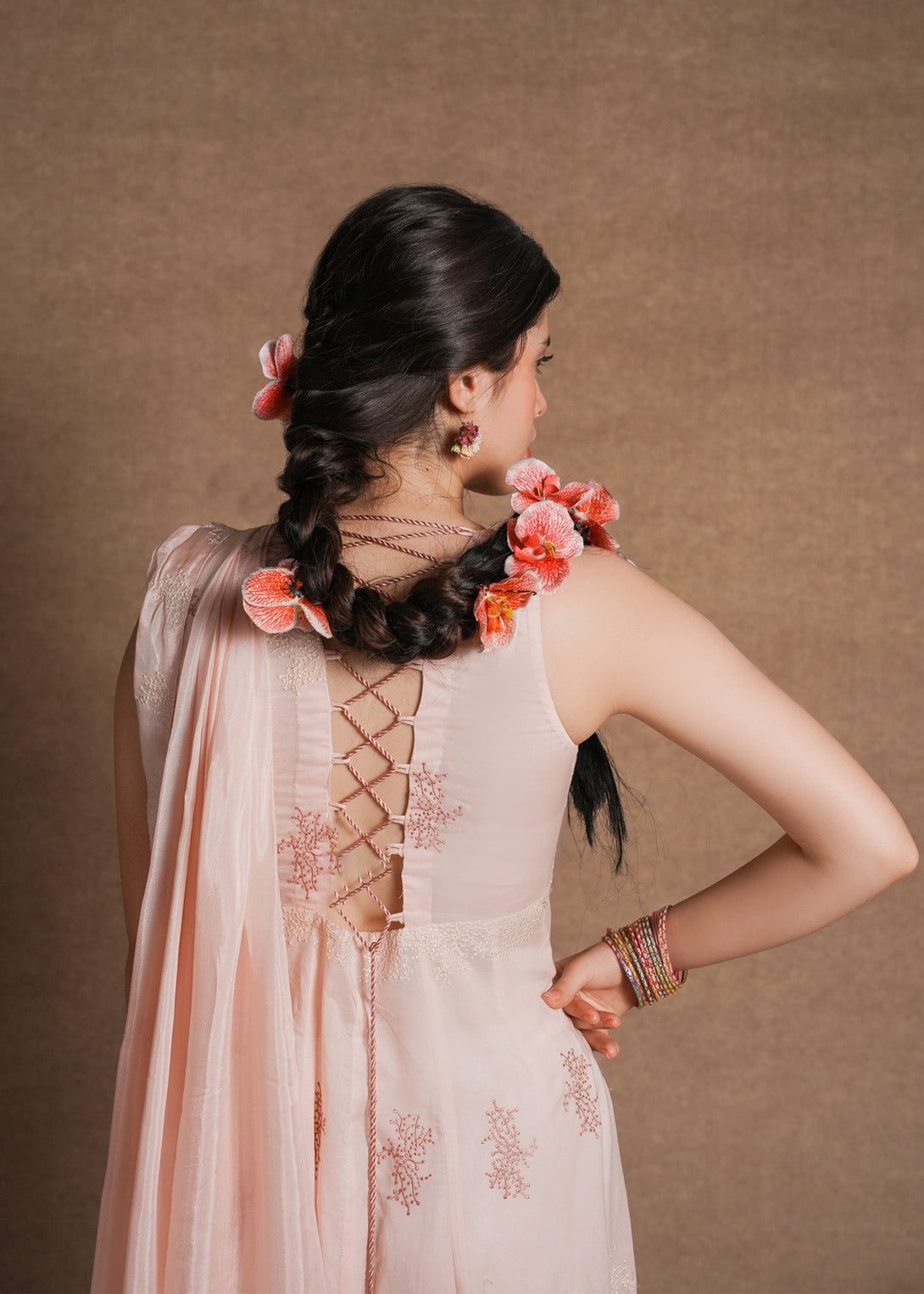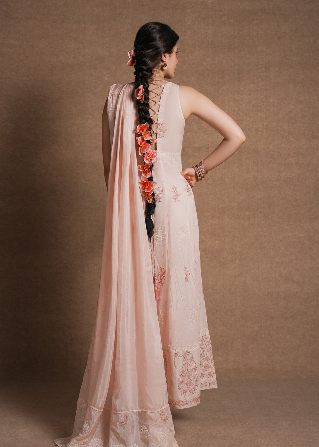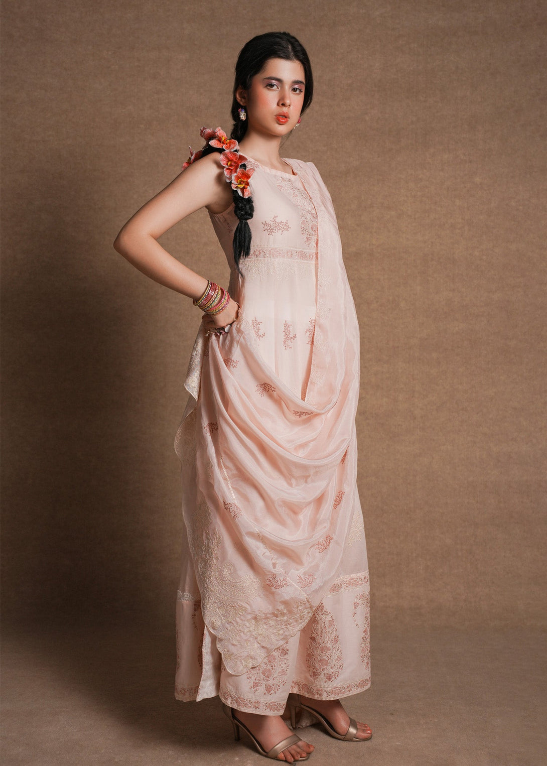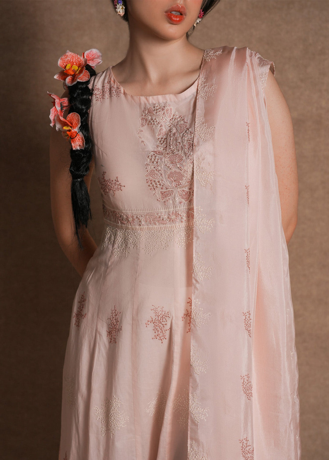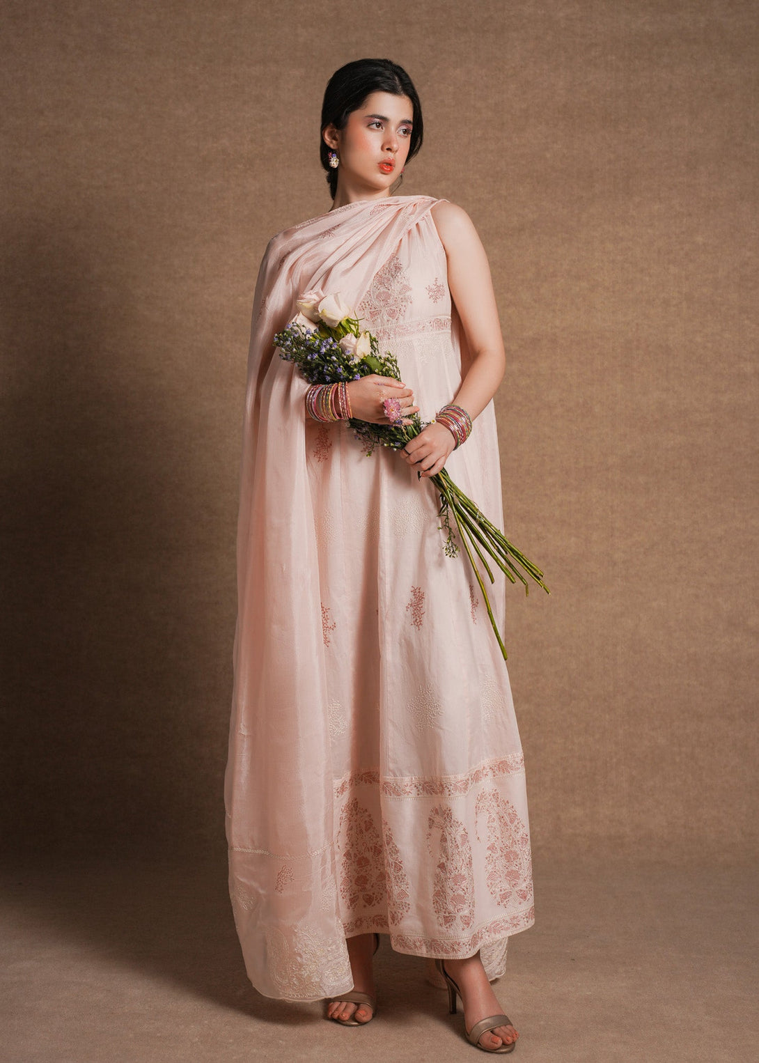 A baby pink lawn maxi shirt with tonal embroidery and side slits, offering a monochromatic aesthetic. Styled with crisp white cambric Capri pants. The medium silk dupatta adds a luxurious touch with its heavily embroidered pallu.