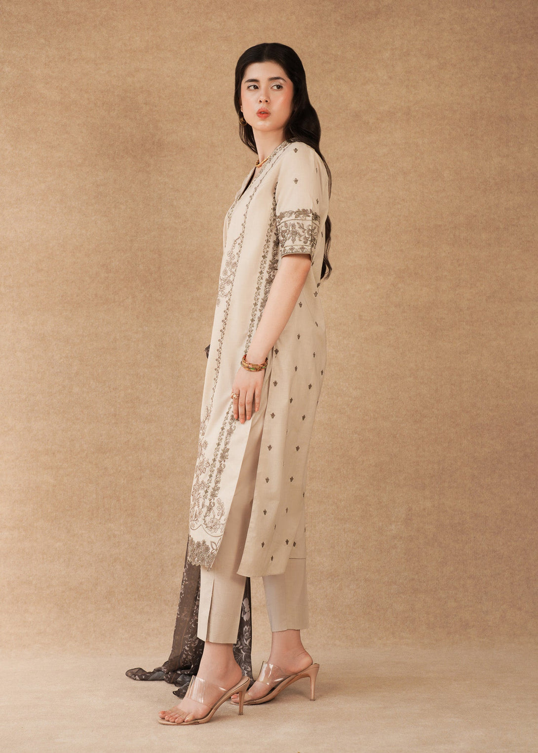 An open-style beige lawn shirt, tastefully embroidered for understated elegance. Coordinated with classic capri trousers in cambric. The Munar dupatta in dusky tones features delicate printed motifs.