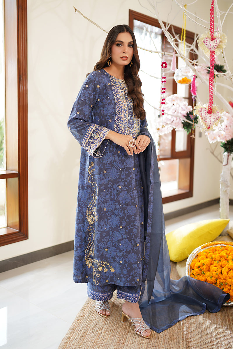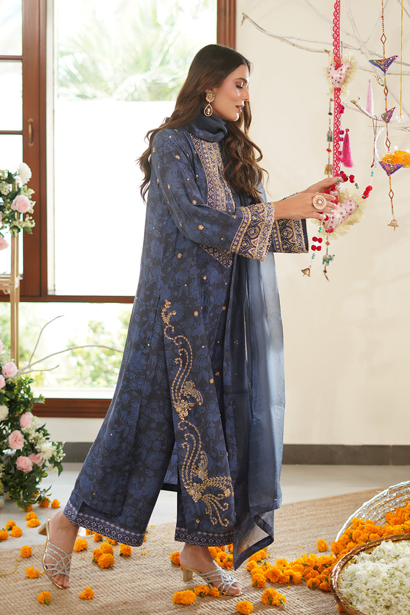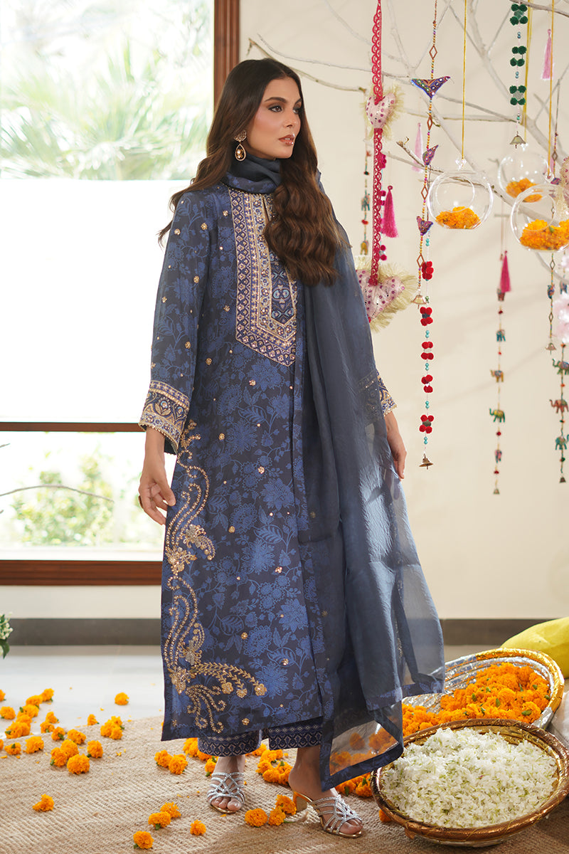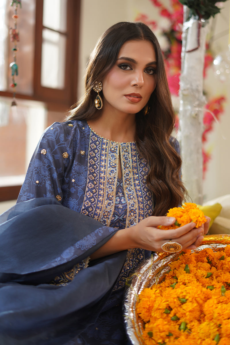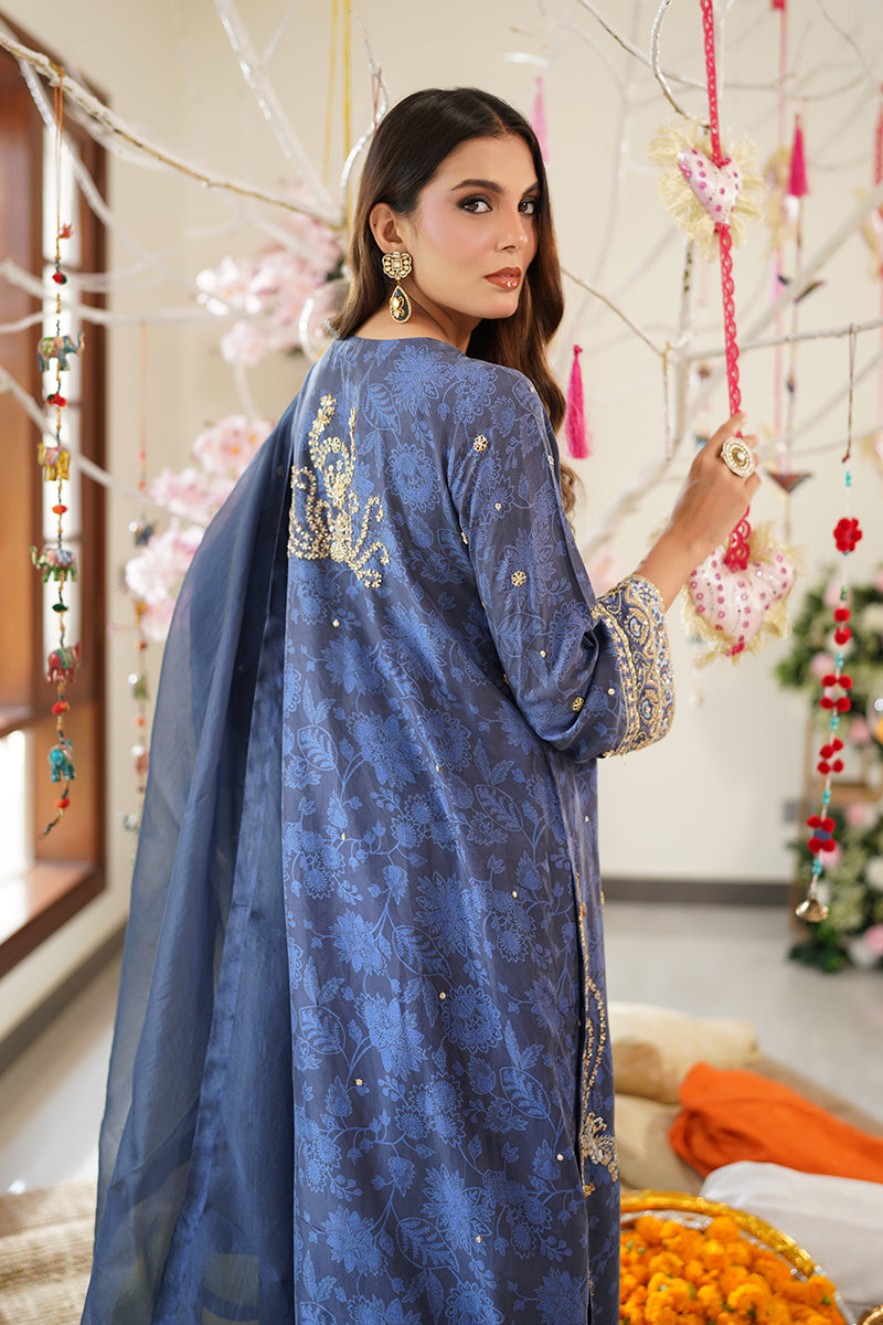 A timeless statement in shades of blue, this outfit is crafted from pure raw silk with an intricate self-print that adds depth and texture. The shirt features a beautifully detailed neckline, adorned with exquisite hand embellishments using kora, dabka, and Swarovski stones — extending gracefully along the side slits for a luxurious finish.