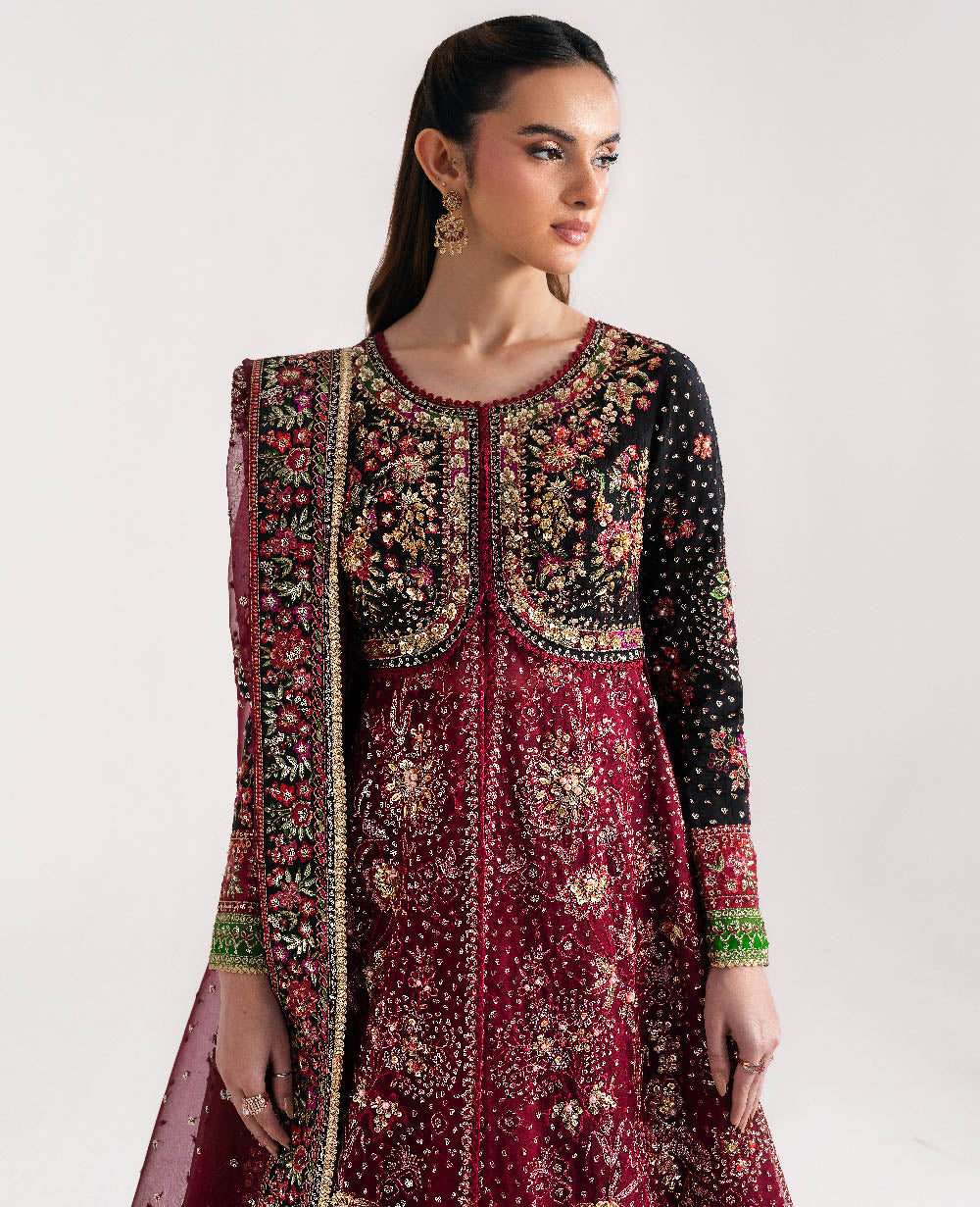 A front-open, four-paneled shirt featuring a black bodice and red panels decorated with silver motifs. The hem has lush green and hot pink borders, finished with green lace. The red organza dupatta is adorned with a sequin bust in the center, surrounded by a four-sided floral border and delicate lace on all sides. The black sleeves are embellished with floral embroidery and sequins, featuring two borders in green and hot pink, finished with lace. Paired with raw silk lehnga trimmed with golden lace at the cuffs.