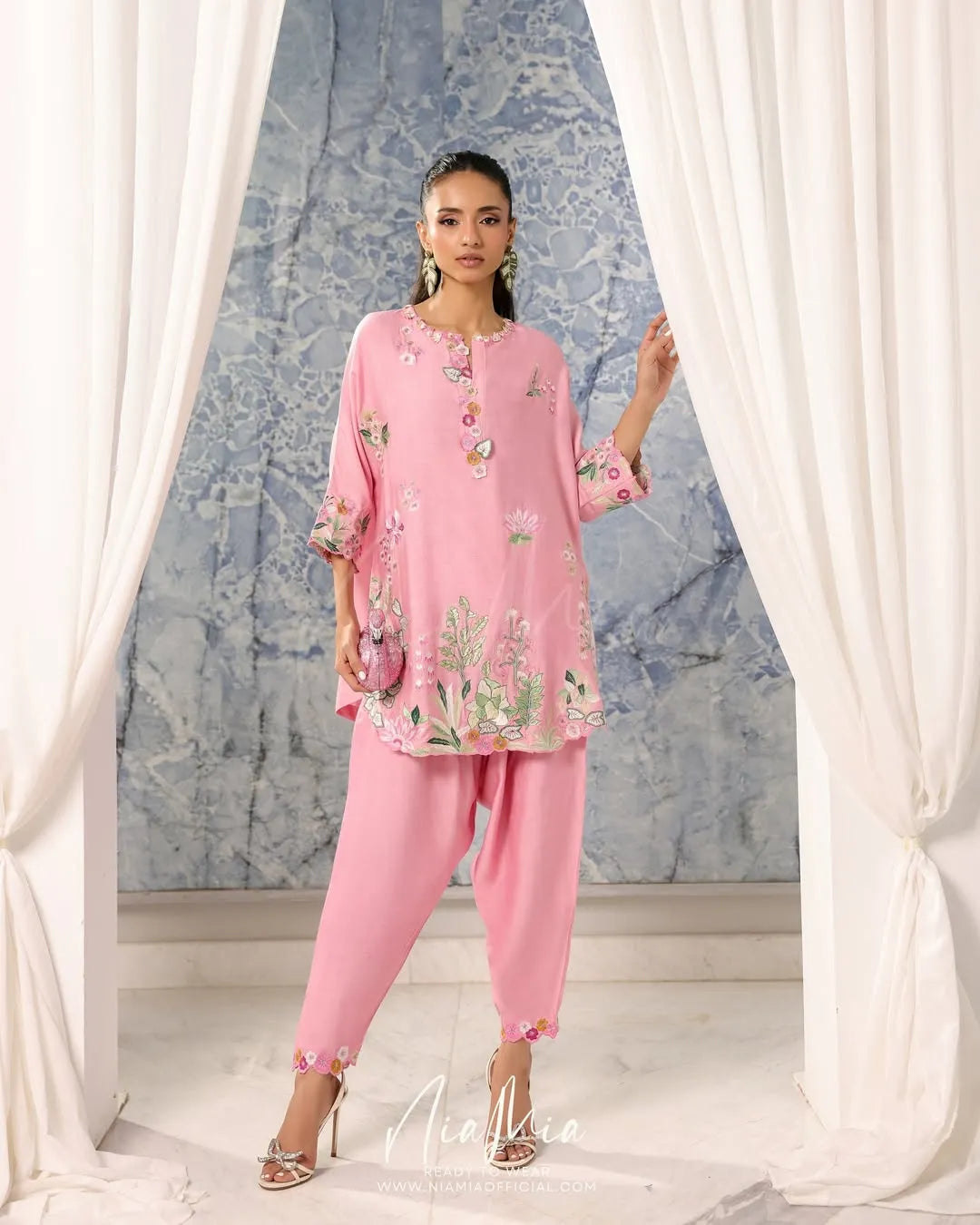 A vibrant NM cut in the brightest festive pink, adorned with delicate floral & petal