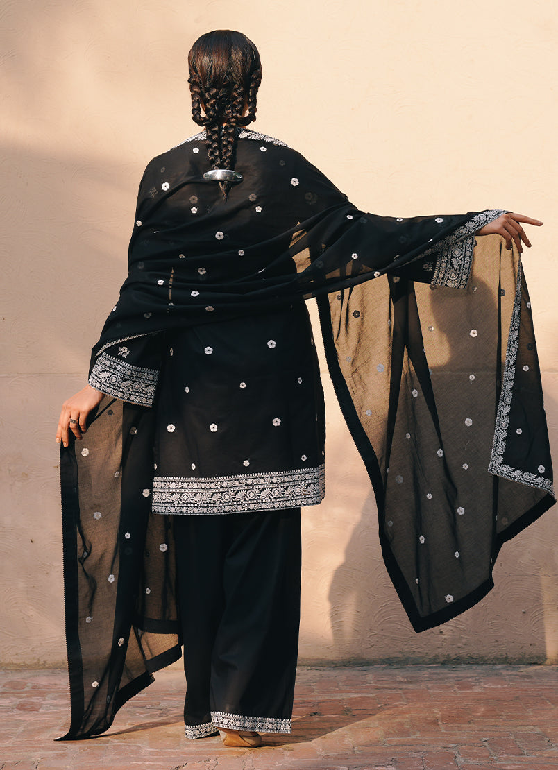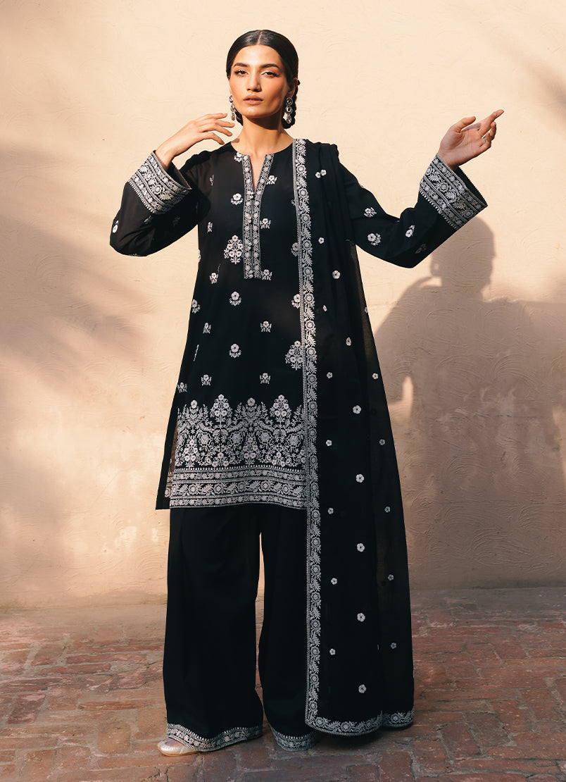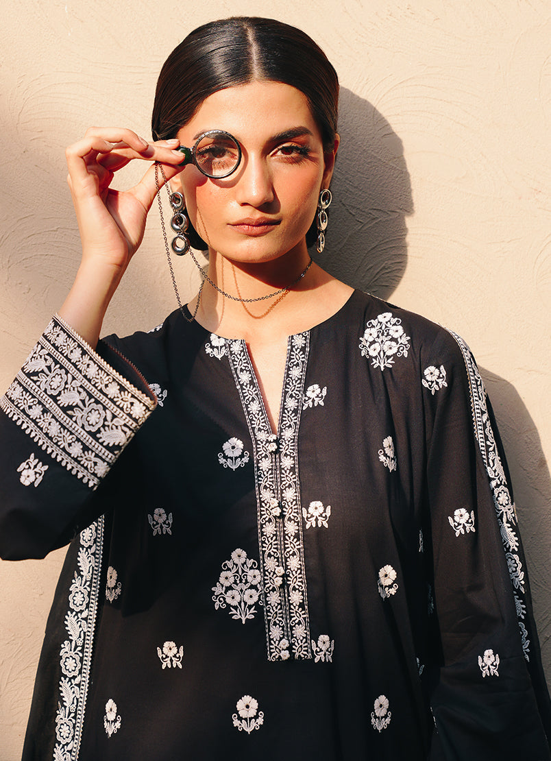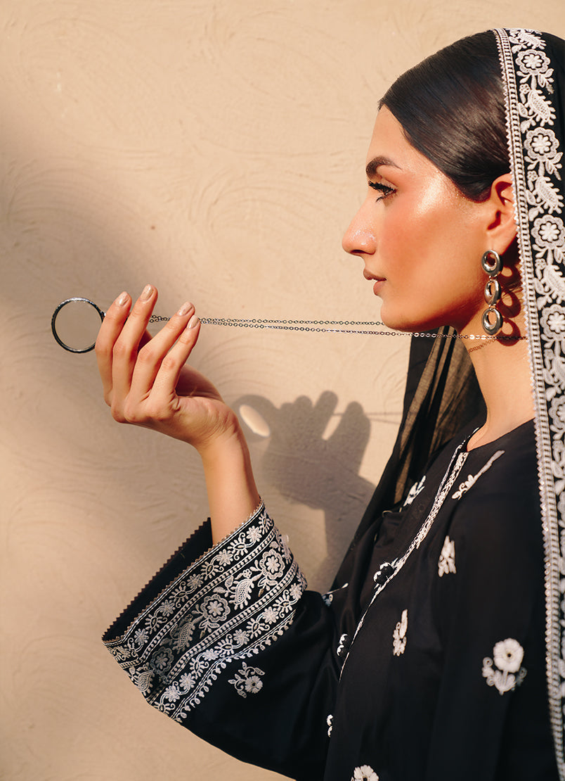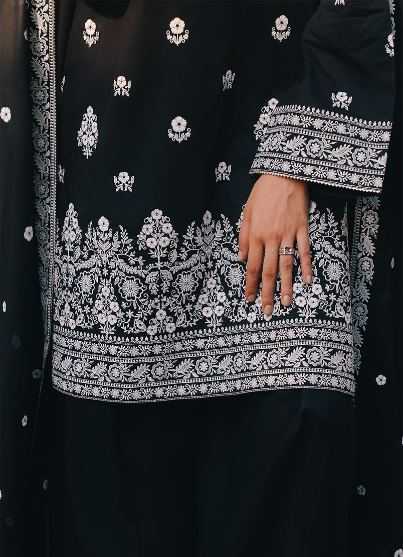 Maisha in Black from our Summerkari '25 Collection. An embroidered cotton lawn 3-piece outfit paired with embroidered trousers & voile embroidered dupatta.