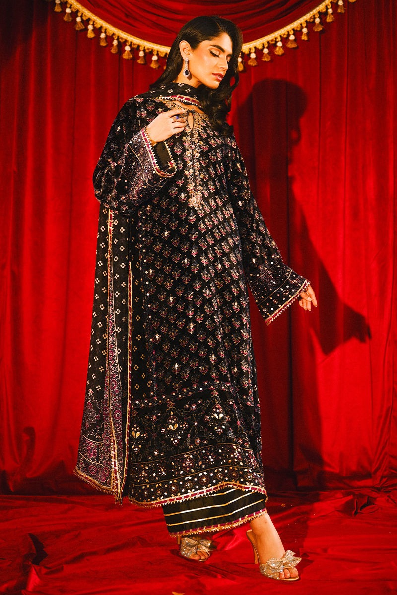 This elegant black discharge kurta set features a zardozi-embellished neckline and delicate handwork scattered throughout, enhanced with subtle gota details for a touch of shimmer. Paired with a medium silk izaar finished with gota edging and a matching discharge print dupatta, this ensemble strikes the perfect balance between timeless tradition and refined sophistication.