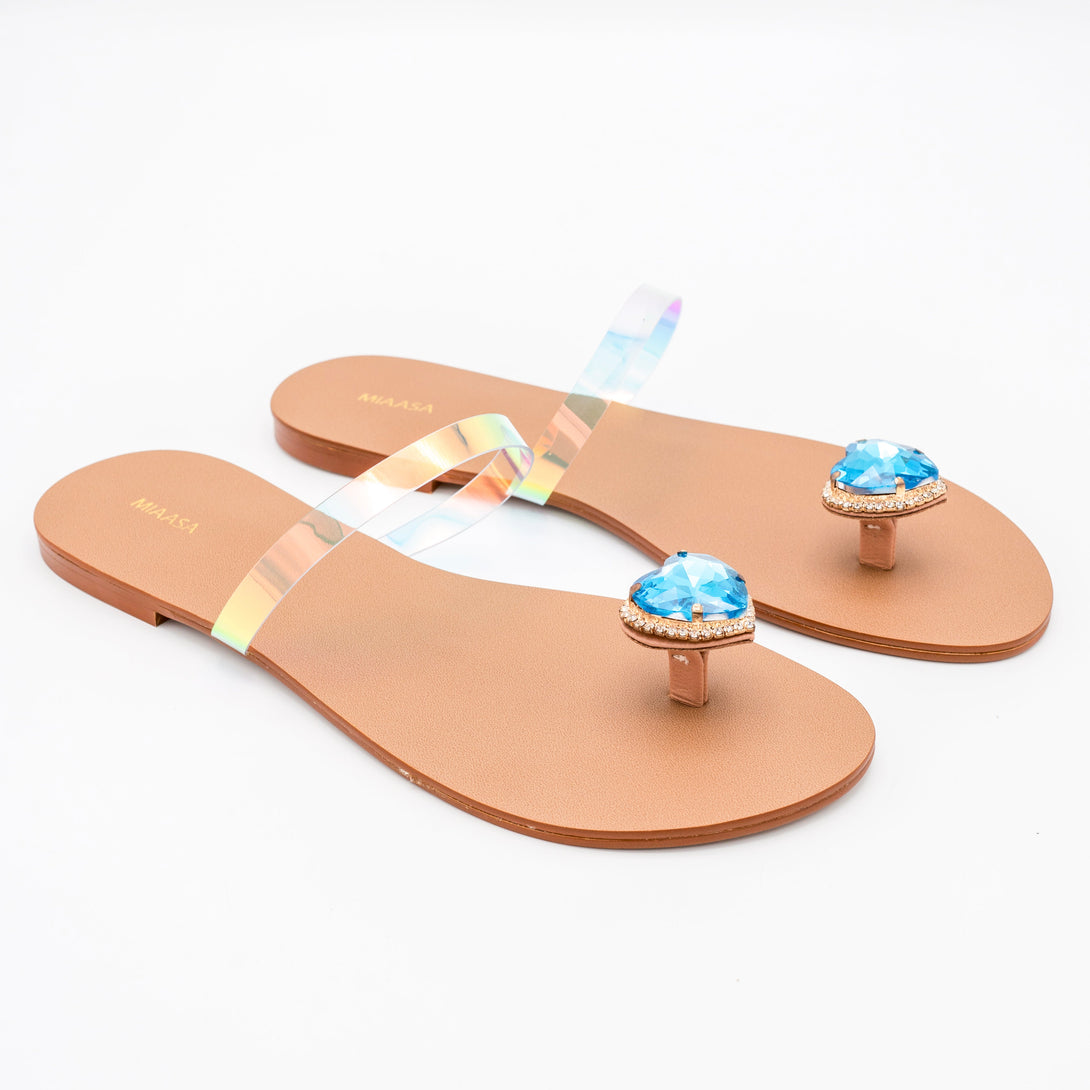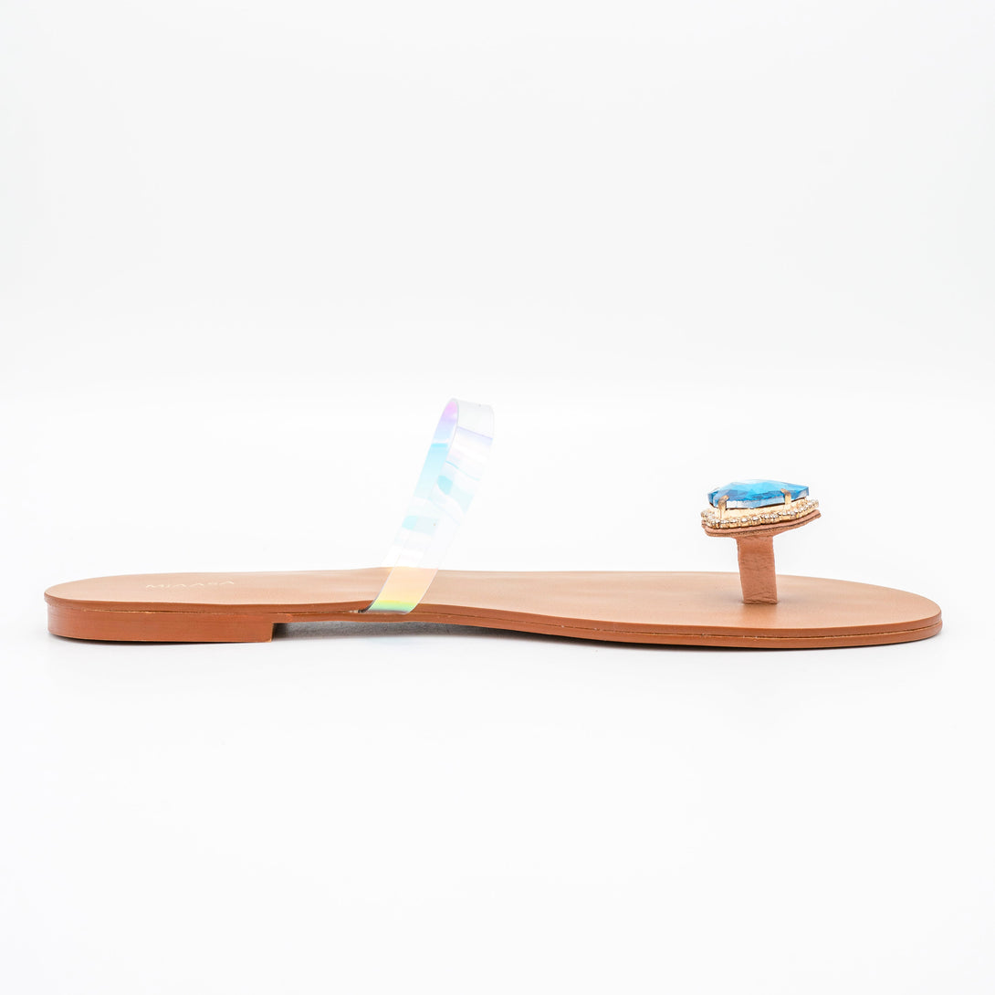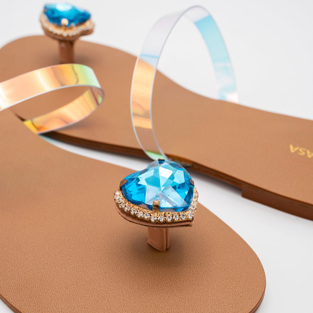 Nilay' is minimal, fresh, and full of shine. Set on a tan insole, it features a single iridescent PVC strap and a bold blue heart stone framed with micro crystals at the toe. The barely-there look keeps things clean while the pop of sparkle brings just the right amount of drama. '