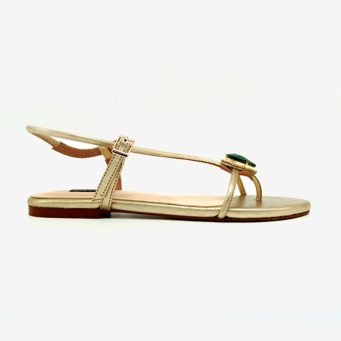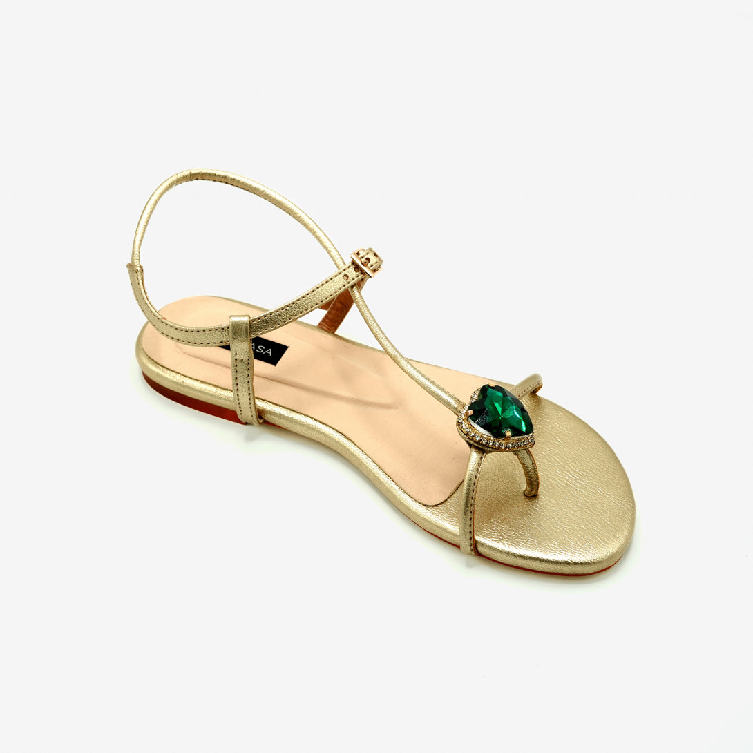 Gulbahar' brings together sleek design and bold accents - Crafted in black with a minimalist silhouette, this sandal features a striking emerald-green heart stone framed in subtle gold shimmer. The secure ankle strap adds comfort and stability to an otherwise barely-there silhouette.