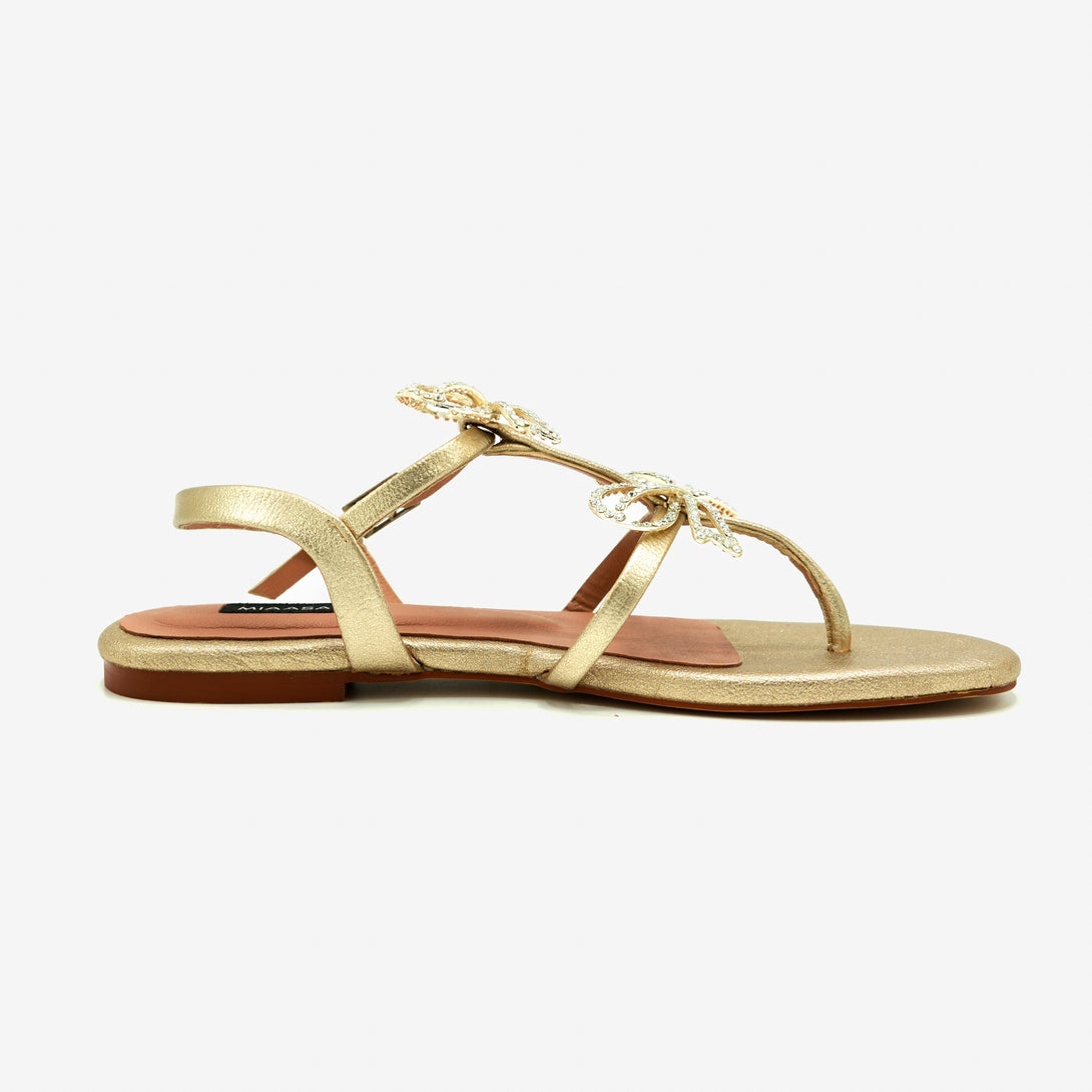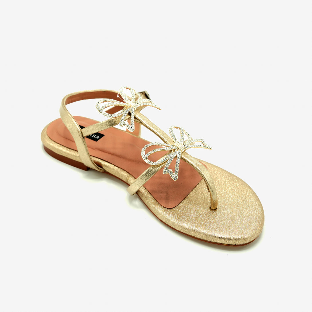 Delbar' - A gold-toned flat that features delicate bow- shaped accents studded with crystals that catch the light with every move. Designed with slim straps and a comfortable sole, it’s your perfect pick for adding a soft sparkle to daytime looks or dressing up for evening outings