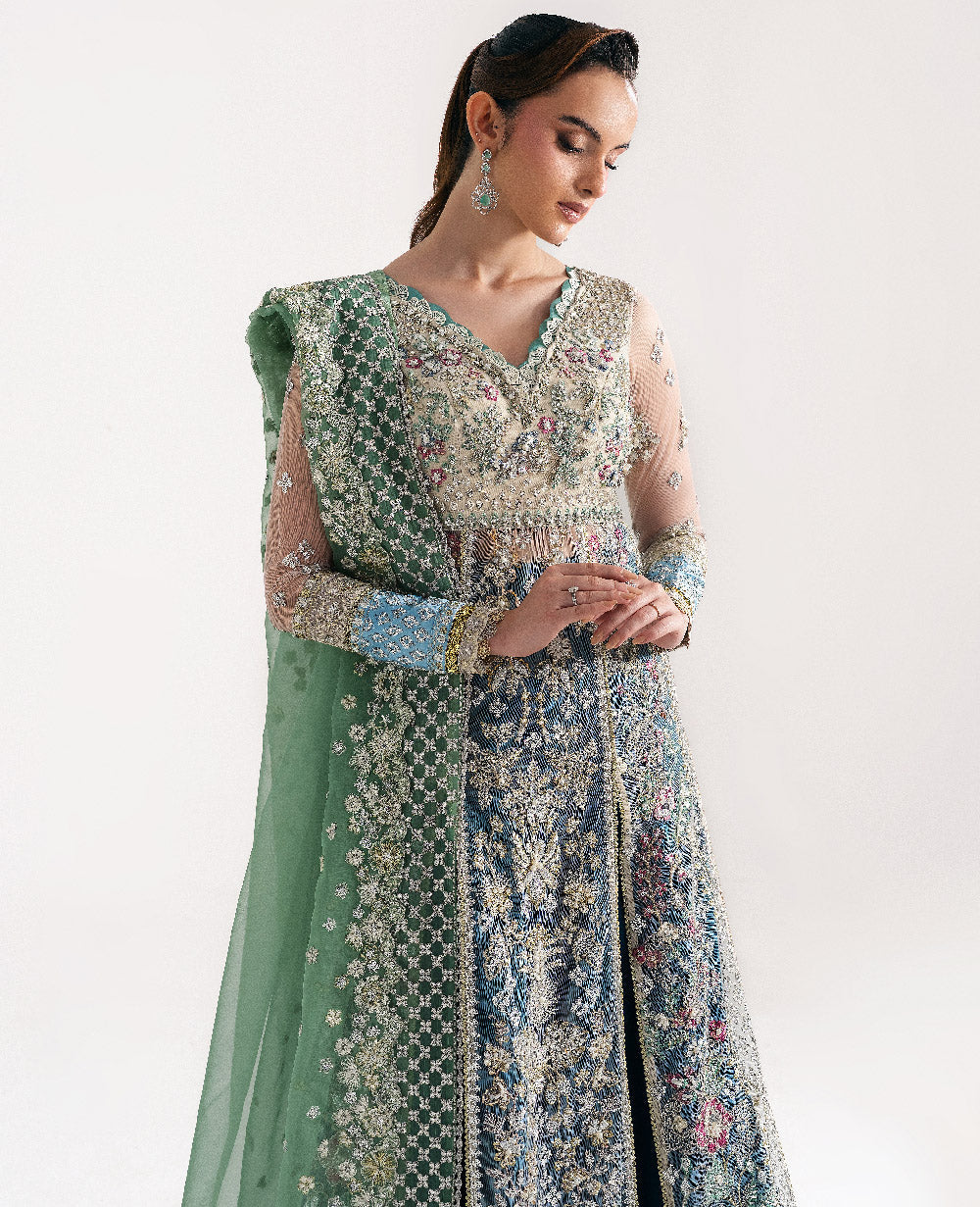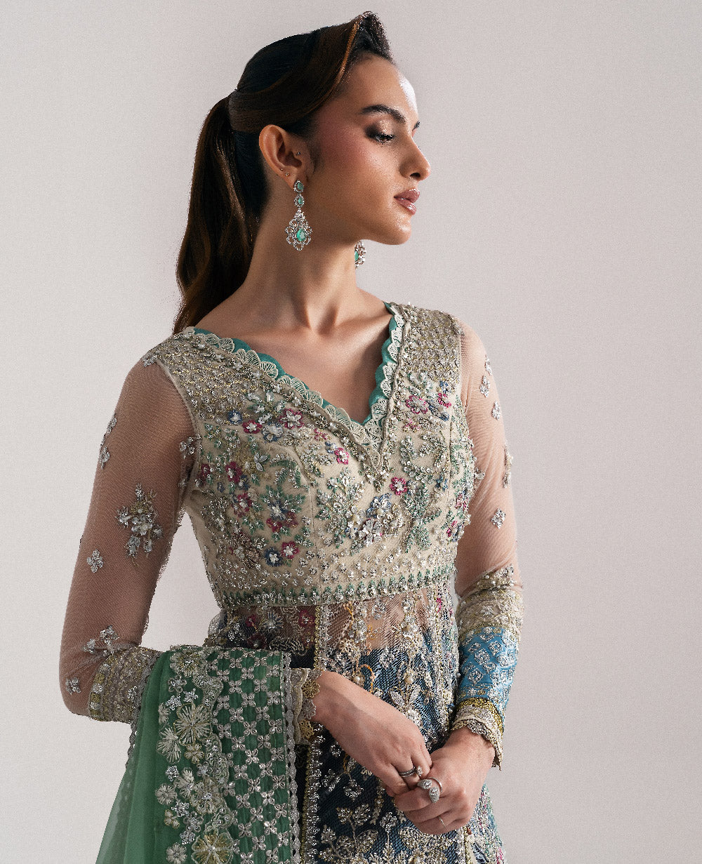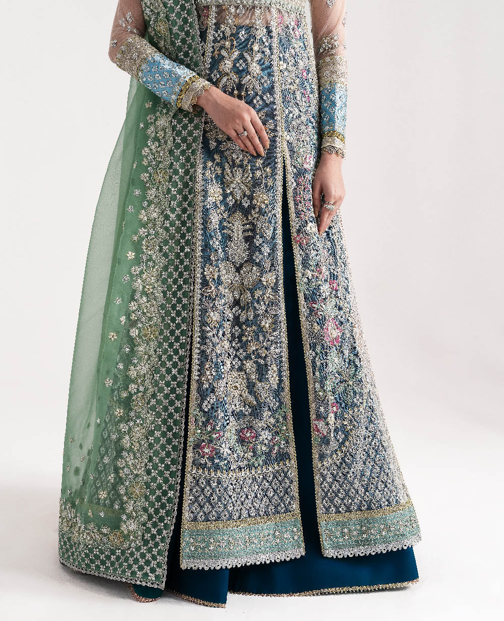 This three-paneled white net shirt is decorated with soft blush flowers, light green leaves, and ivory embroidery on the bodice and lace on the ending of the hem. It is paired with a teal green lehenga and delicate lace on the hem. The sage organza dupatta has a floral border with geometric details and 4 sided lace, adding a graceful touch. The sleeves have a blue satin patti alongwith a lace, while the front and back are finished with a mint green patti for a neat, elegant look.