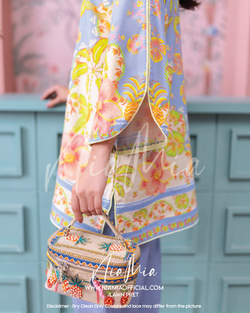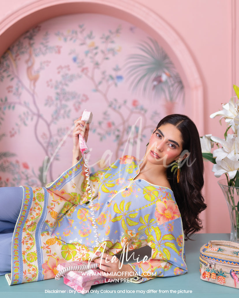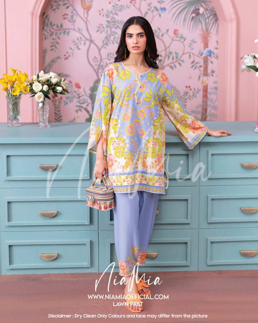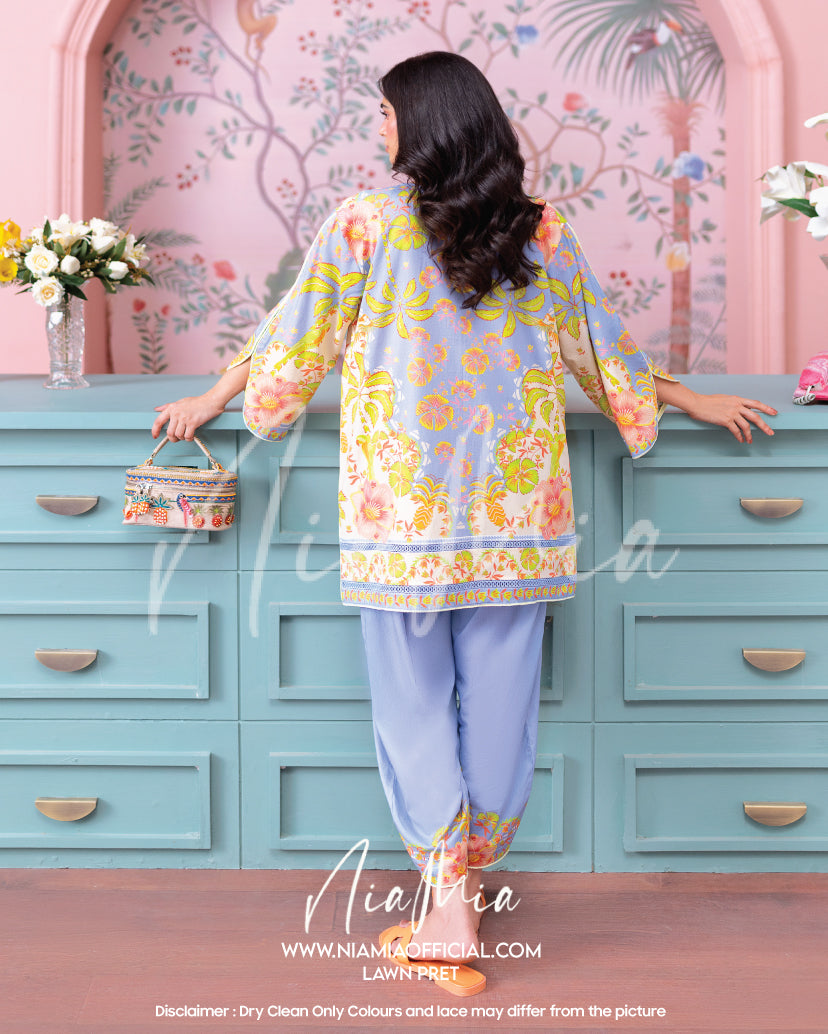 A two-piece printed set in soft periwinkle, accented with shades of green and coral. The wavy neckline is finished with dainty buttons for a touch of charm, while straight sleeves keep the look clean and polished. Paired with a printed shalwar for understated everyday elegance.