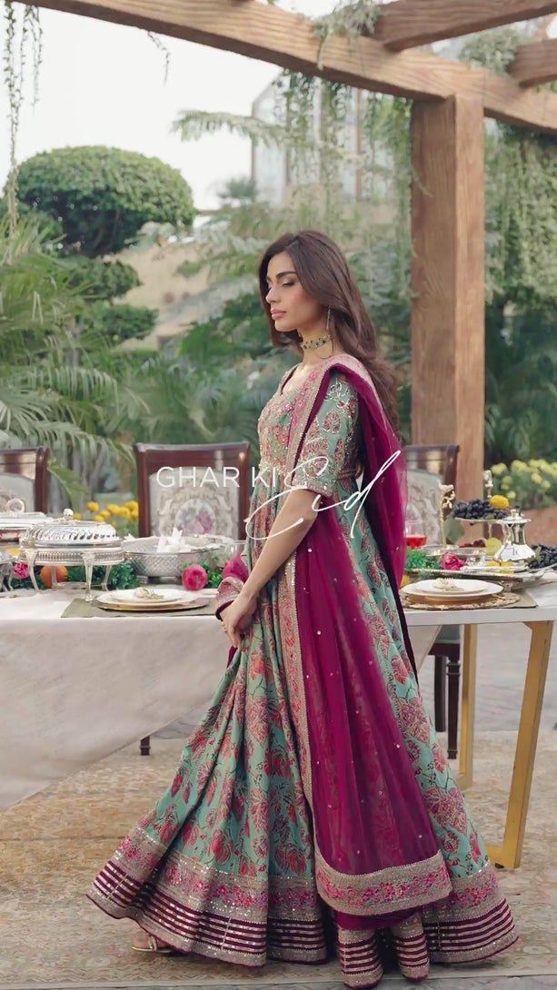 The Kalidar is crafted from premium screen printed Korean raw silk, giving the outfit a graceful flow and a rich, refined texture.The bodice is beautifully highlighted with hand embellishment.The outfit is paired with Korean raw silk churidar pants.Completing the look is a net dupatta, adorned with embroidered borders and sequin spray that add depth and elegance to the ensemble.