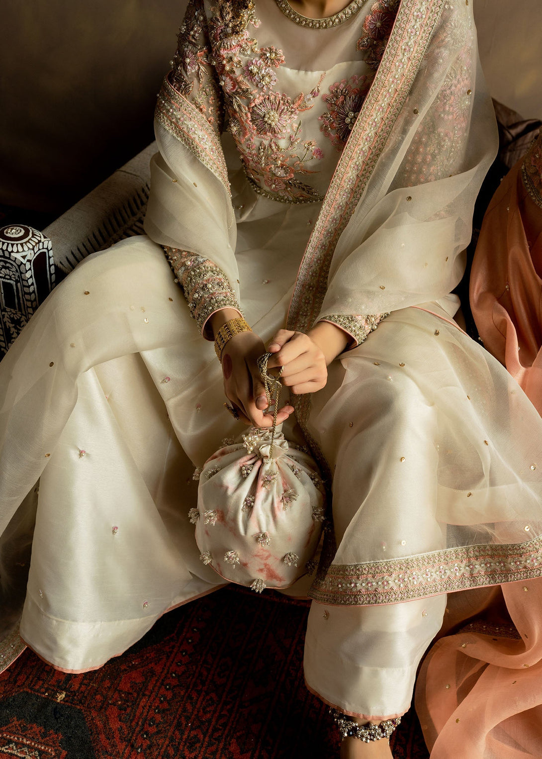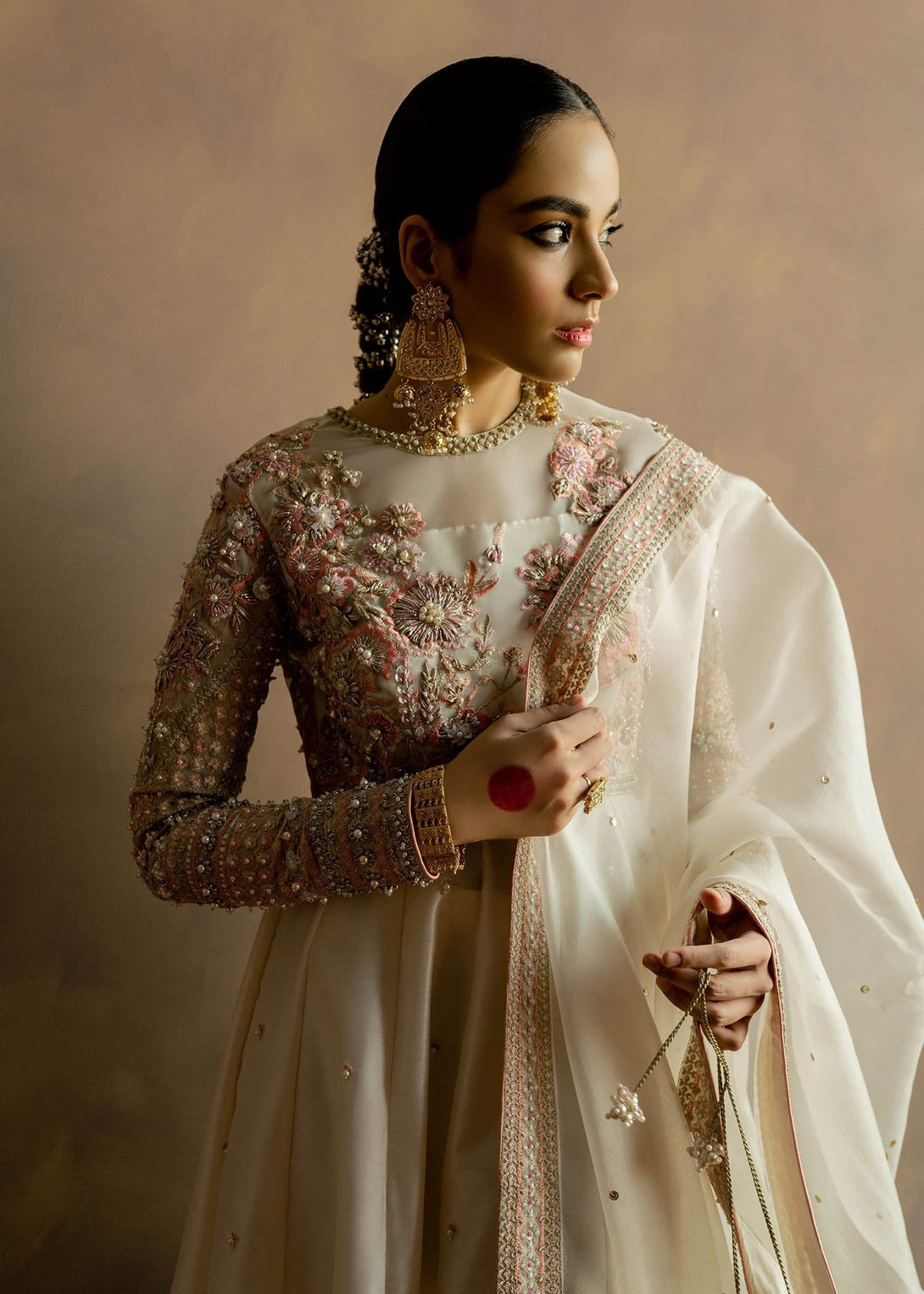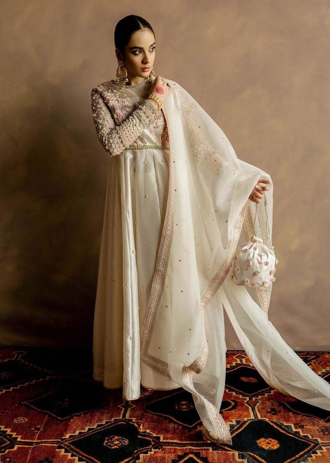 A pretty White cotton outfit, fully work embroidery and intricate hand embellishments. It is paired with a same color cigarette pants and a dupatta with border details. An all over spray is done to serve the elegance in the right manner.