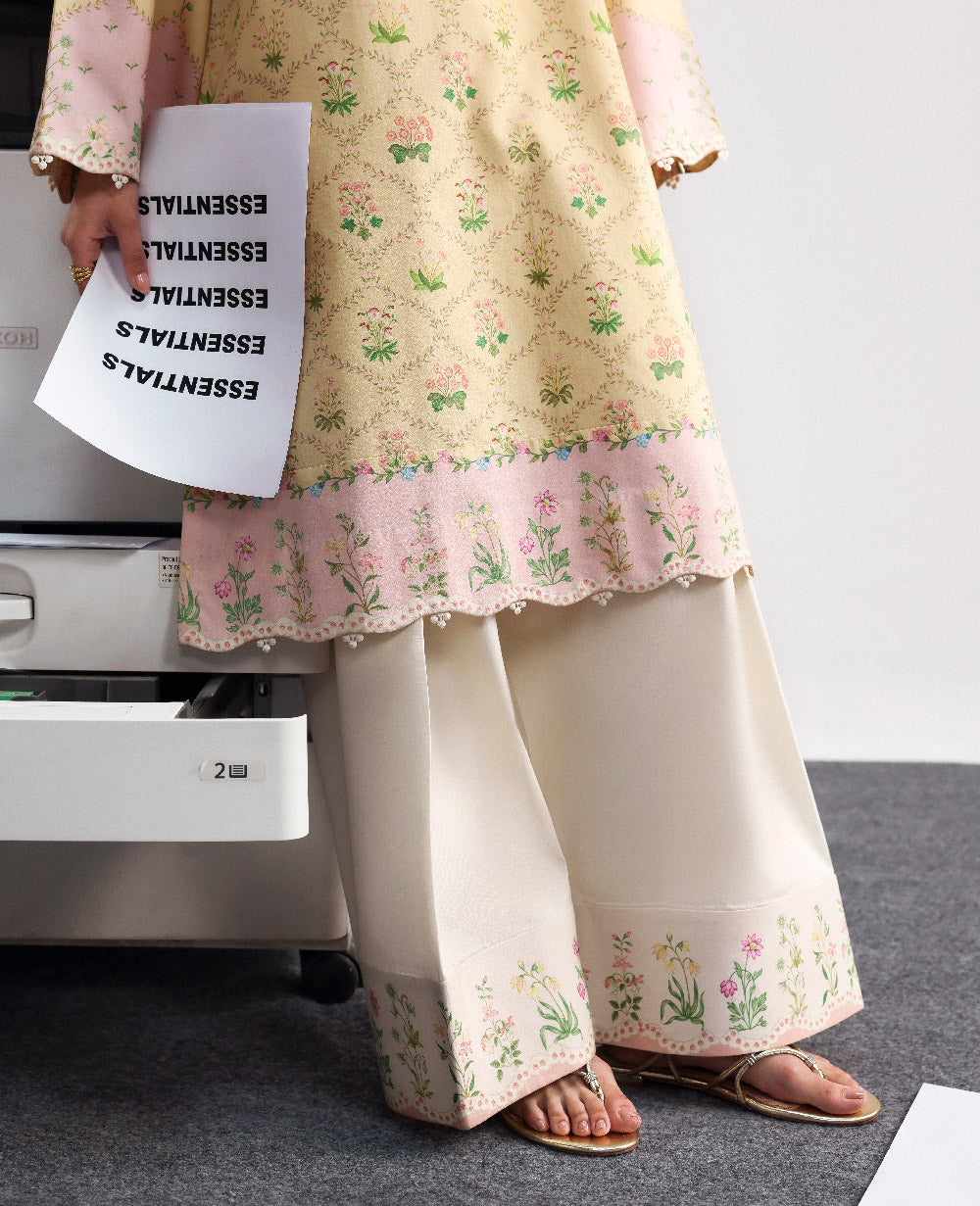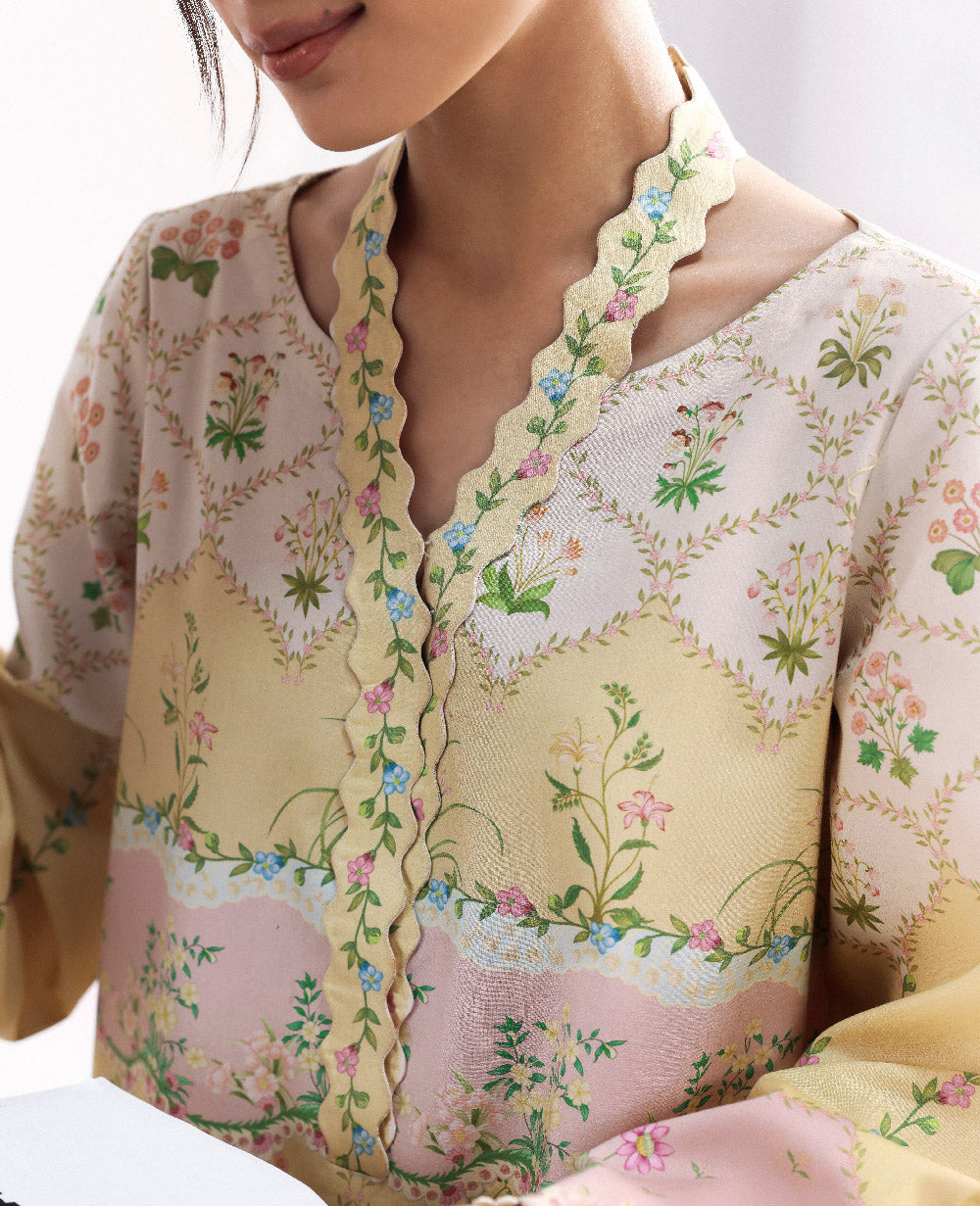 This refined design presents a harmonious fusion of vintage aesthetics and elegance, incorporating floral motifs on a pastel backdrop complemented by laced inspired borders with romantic and graceful vibe in a lemon yellow shirt with cream trouser printed hem detail.