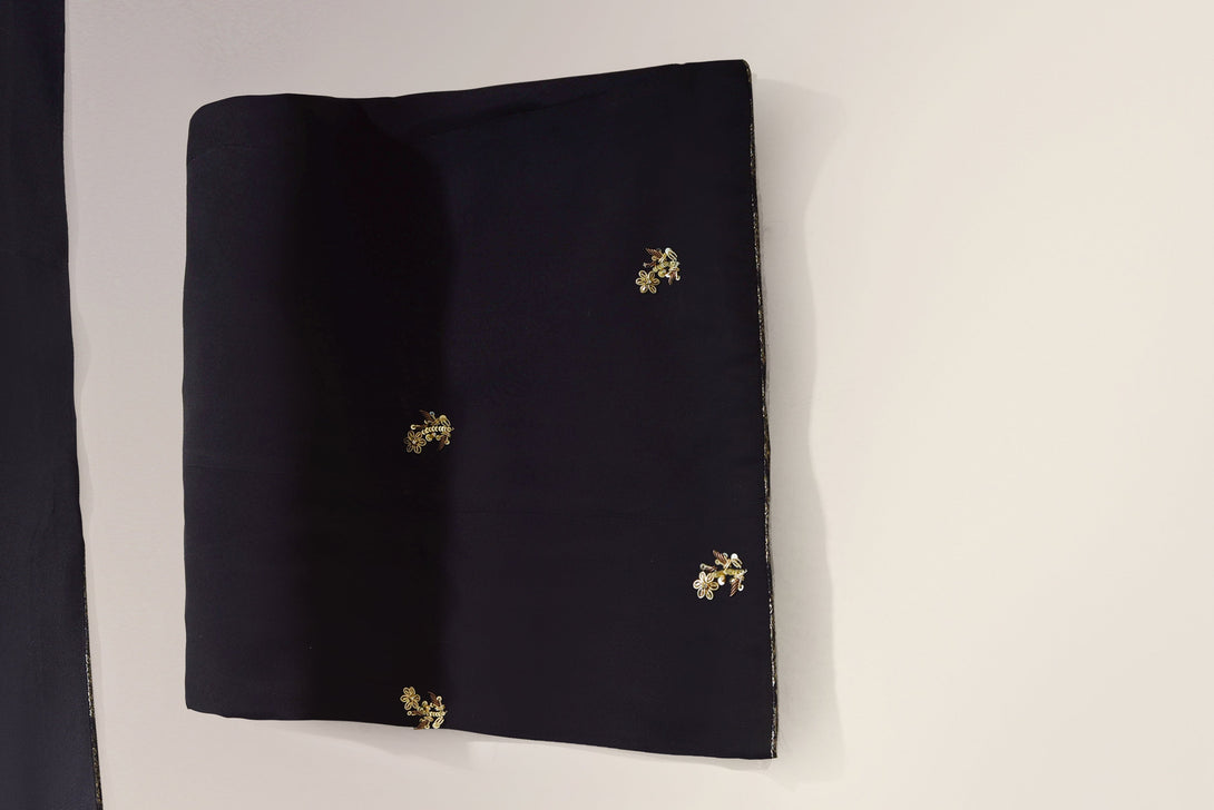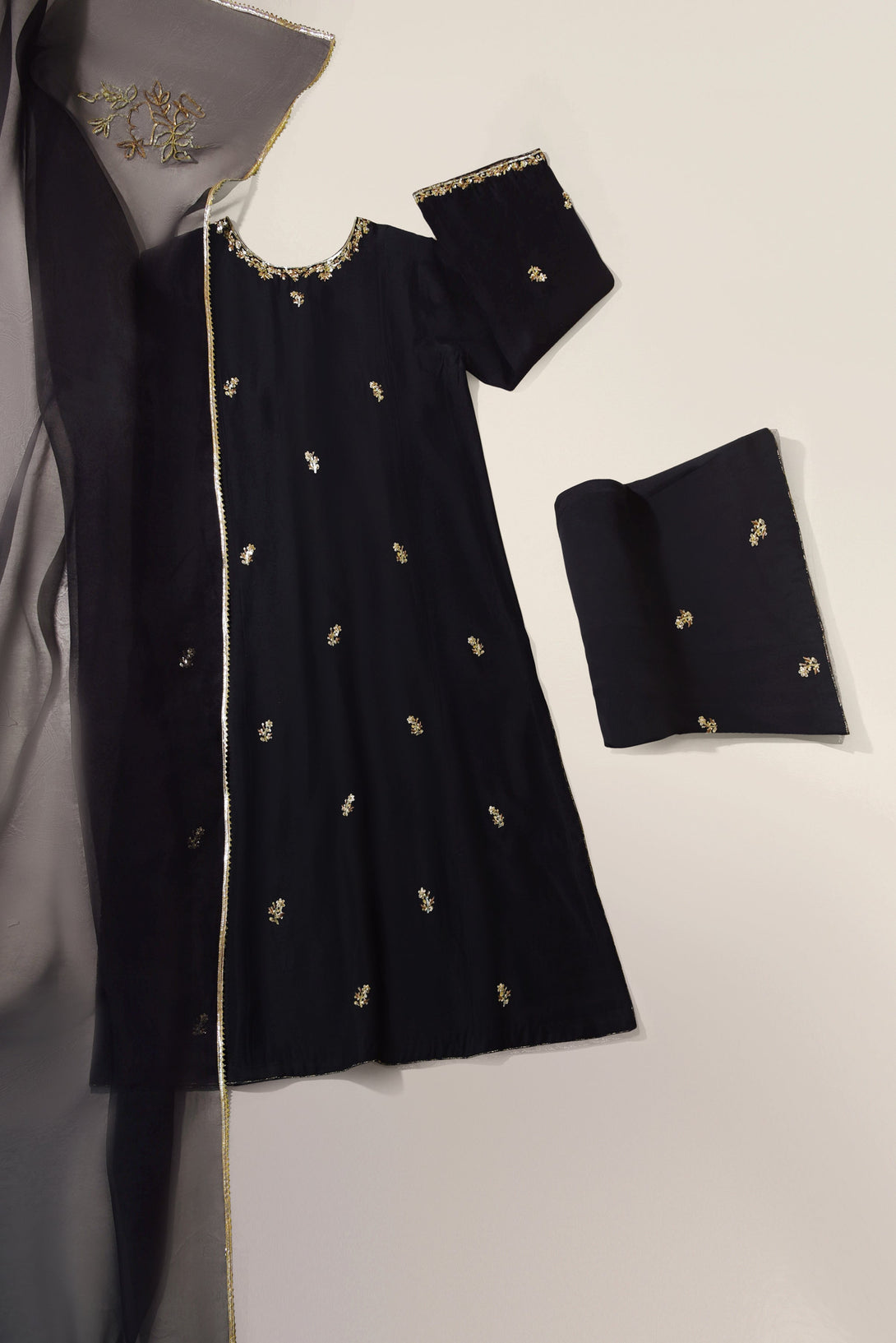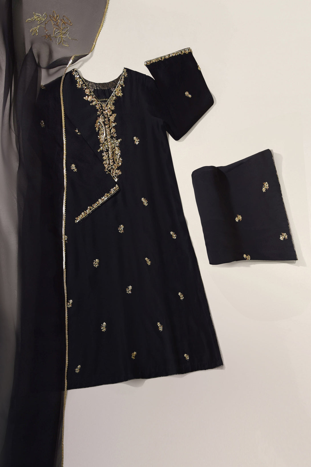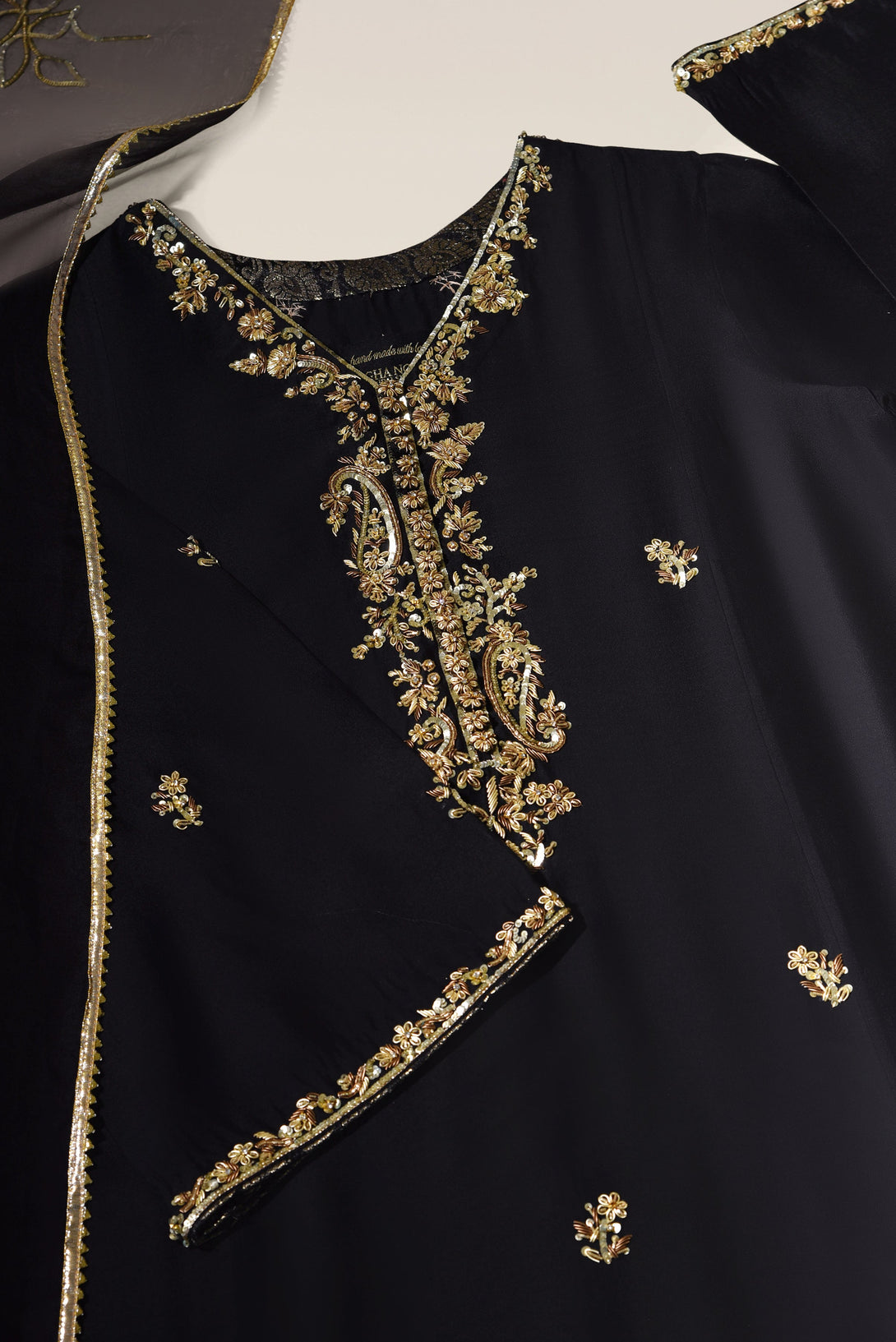 Presenting festive must haves. All masterfully tailored to be dressed up or down according to the occasion. Agha Noor's feminine ensembles will be your go to looks for your celebratory events. This design is meticulaously crafted on a black canvas ( handloom cotton net ) a mirage of pure fabrics and pristine details. Adorned with elaborate hand/Ada work on the neckline, sleeves and daaman, making this one of our most sought after designs, The pure organza dupatta with sequins motifs alongside embellished Izaars, create a lasting impact.