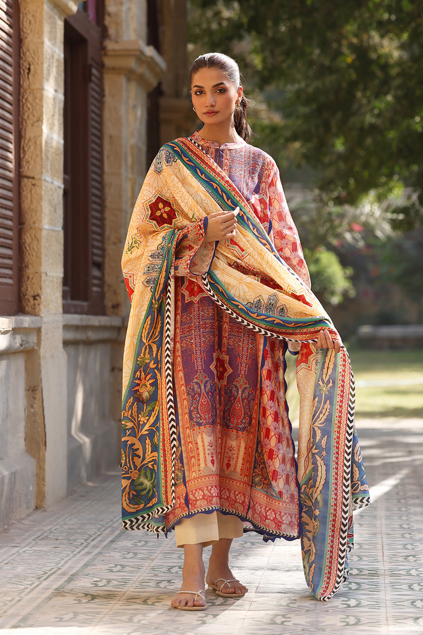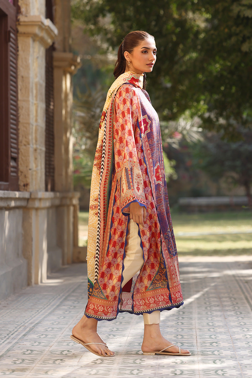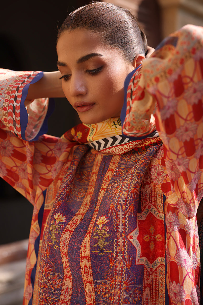 A vibrant ensemble inspired by the rich heritage of East Asia, this crimson and sapphire hued shirt is crafted from cotton net. The relaxed silhouette, adorned with exotic geometric trellises and a chinoiserie print has hand embroidered accents. Paired with a saffron toned medium silk dupatta, showcasing intricate floral patterns framed by a monochrome chevron border, and matching cream pure rawsilk trousers.