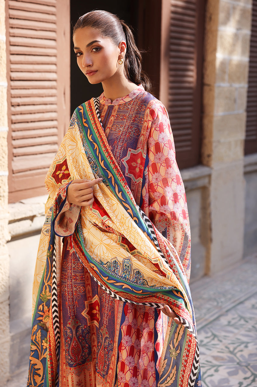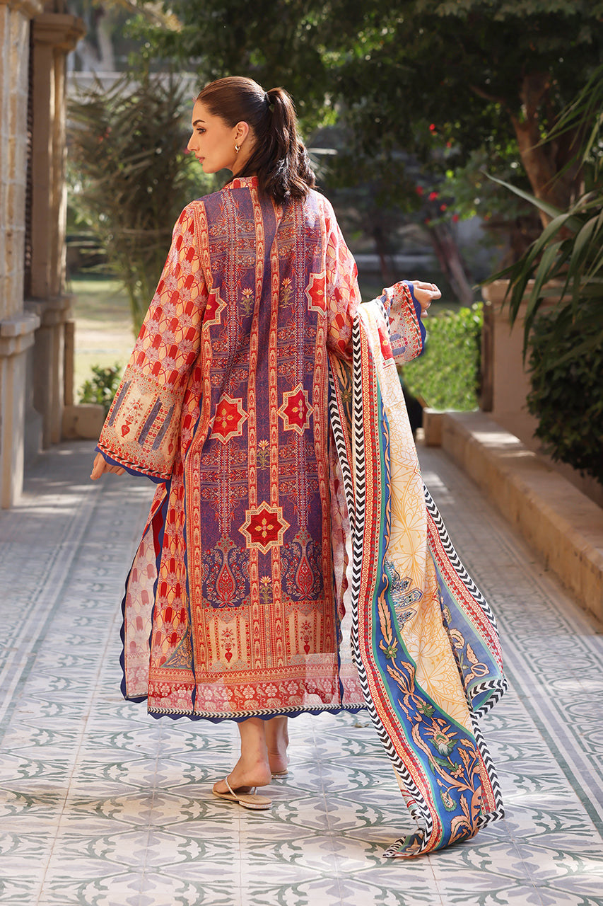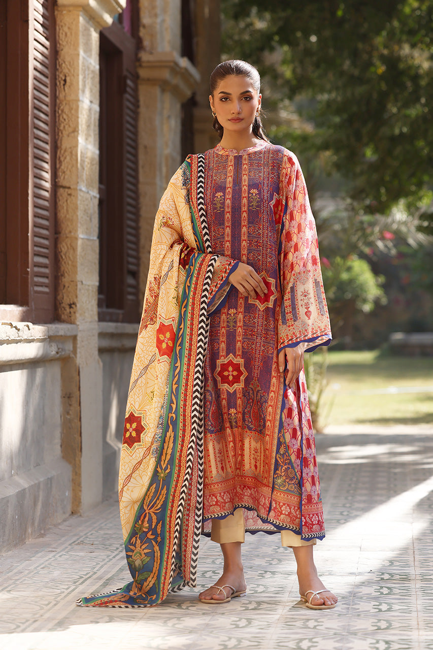 A vibrant ensemble inspired by the rich heritage of East Asia, this crimson and sapphire hued shirt is crafted from cotton net. The relaxed silhouette, adorned with exotic geometric trellises and a chinoiserie print has hand embroidered accents. Paired with a saffron toned medium silk dupatta, showcasing intricate floral patterns framed by a monochrome chevron border, and matching cream pure rawsilk trousers.
