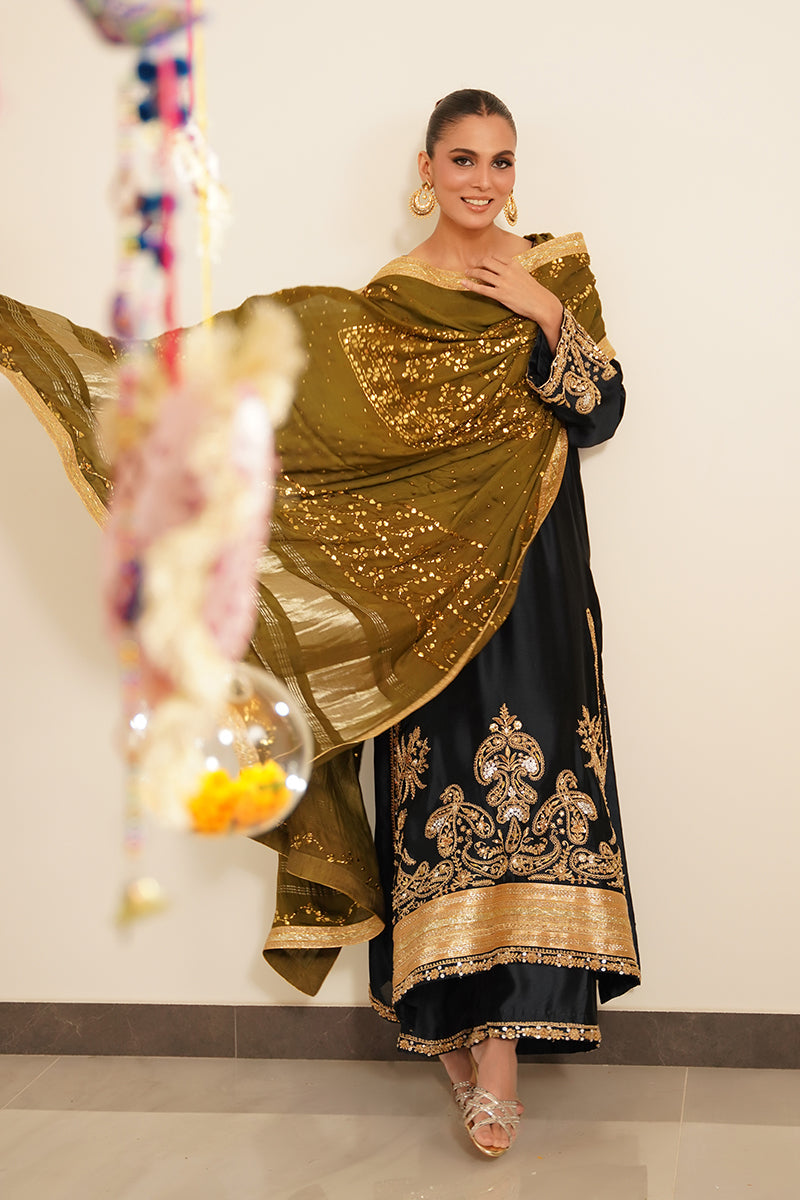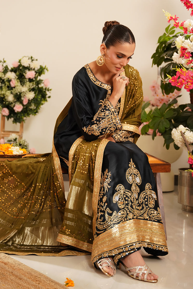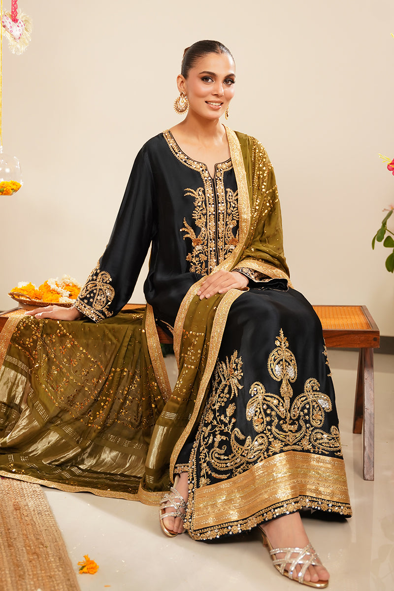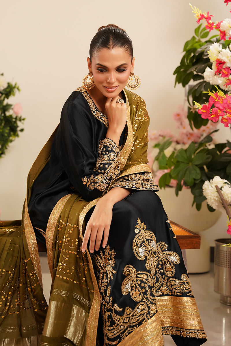 Paired with matching sheesha silk straight pants, the silhouette remains classic yet refined, making it ideal for formal and festive occasions.