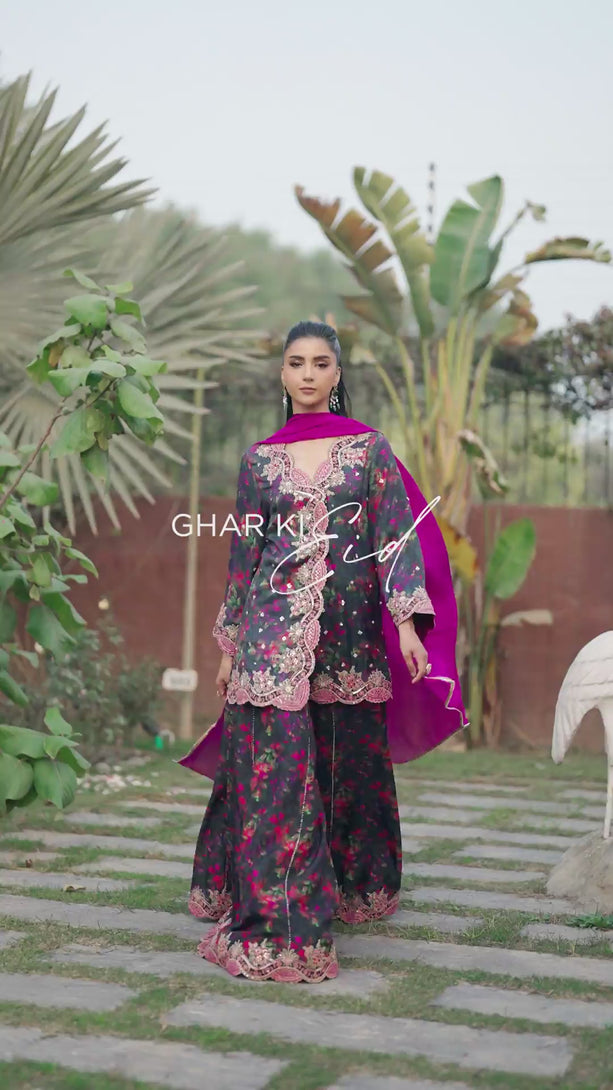 The digitally printed pure raw silk jacket is elevated with intricate hand embellishments and finely detailed embroidered borders along the neckline, sleeves, and hem, adding depth, texture, and a luxurious finish to the silhouette. Paired with the jacket are flowing digitally printed sharara pants in Korean raw silk, finished with embroidered borders that enhance their graceful movement. Completing the look is a rich KP silk dupatta, draped effortlessly to add a bold contrast and a refined touch of elegance.