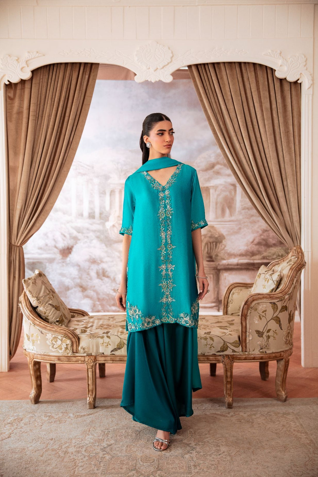 3pc set with shirt in sheesha silk base embellished with sequins, dabka, kora and pearls, paired with dhaka pant. This look is completed with a medium silk dupatta.