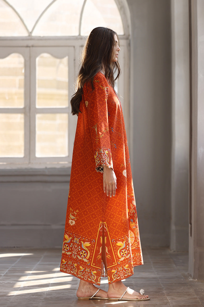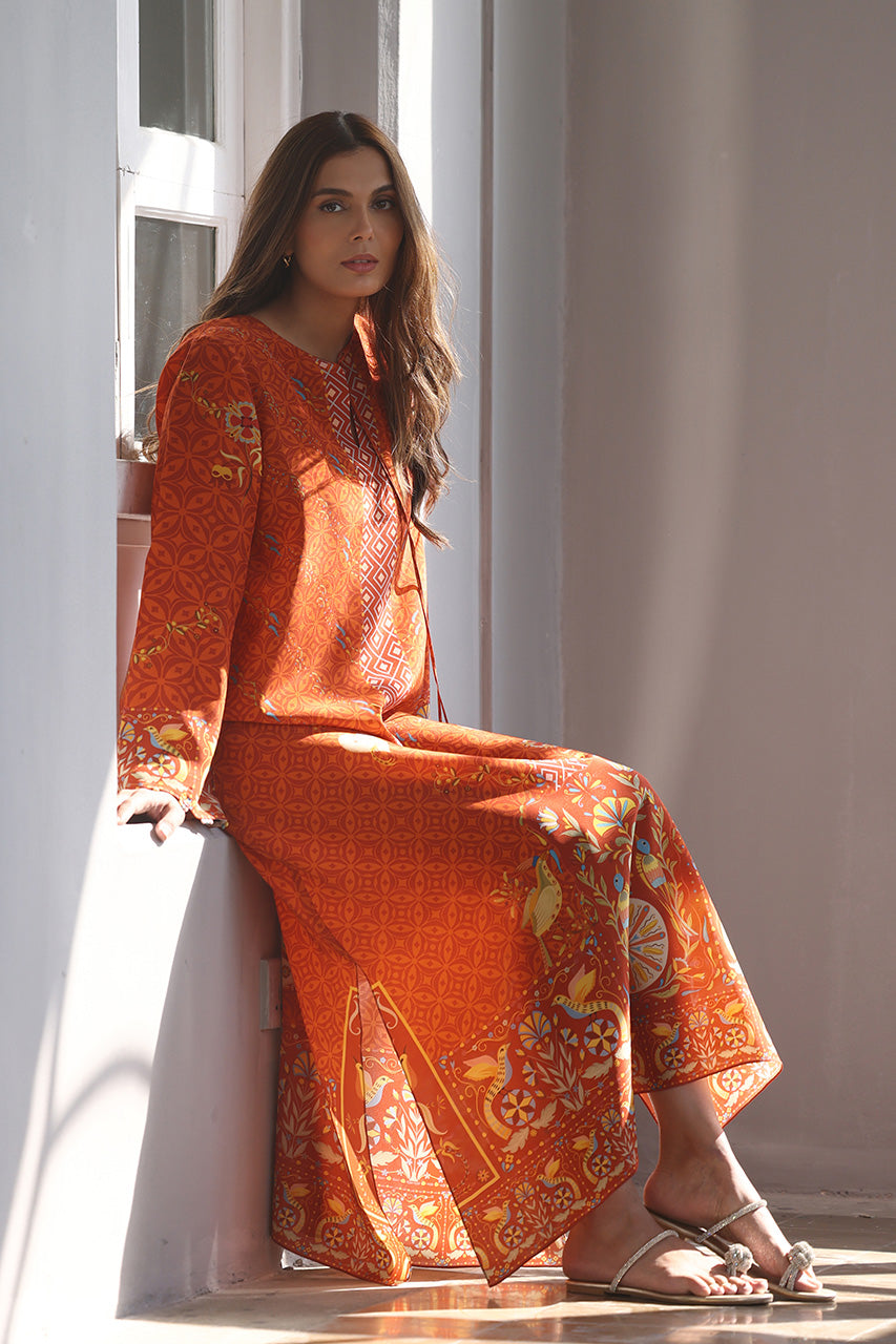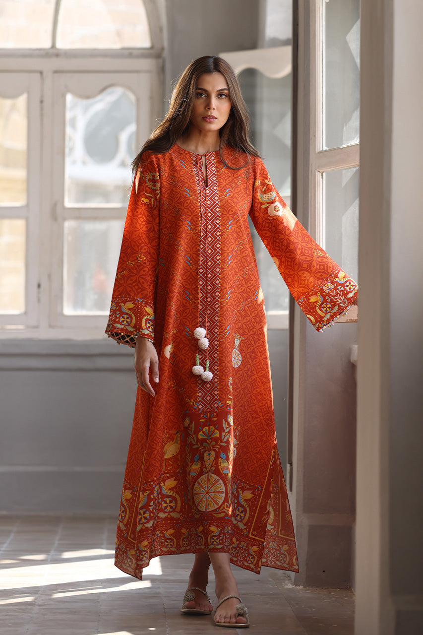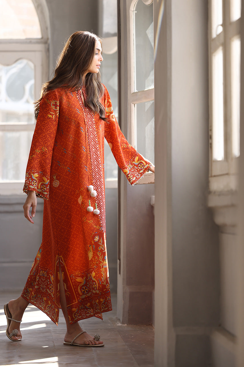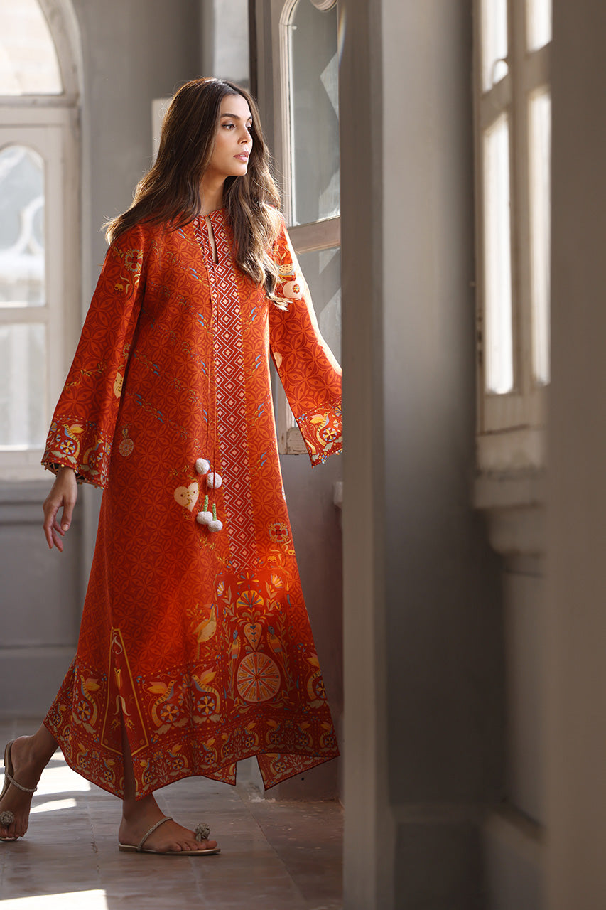 An enchanting relaxed kaftan in a fiery, terracotta inspired hue features intricate geometric and floral patterns, highlighted by playful pompom accents. Crafted from crepe, the silhouette exudes effortless elegance, perfect for making a refined statement this season.