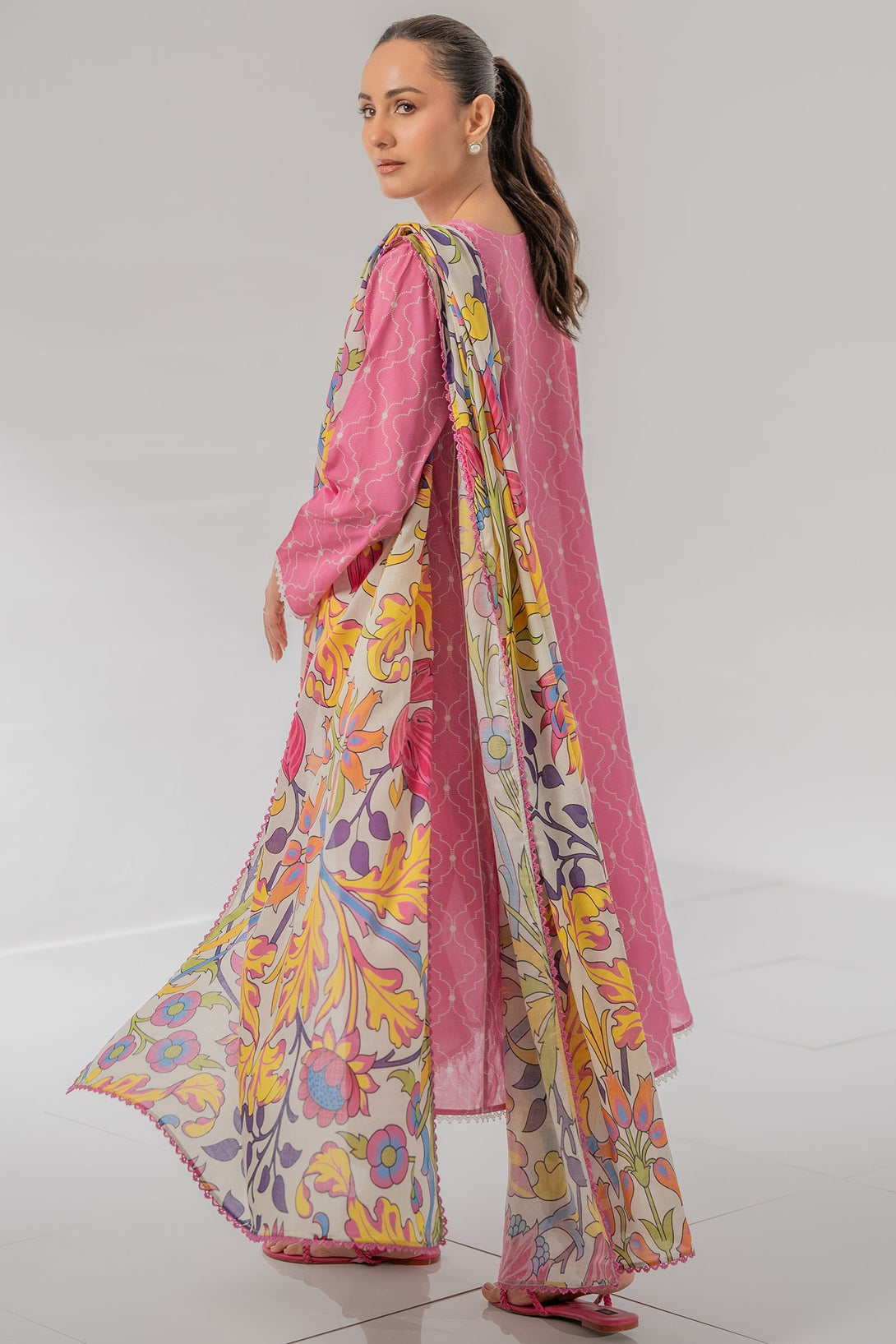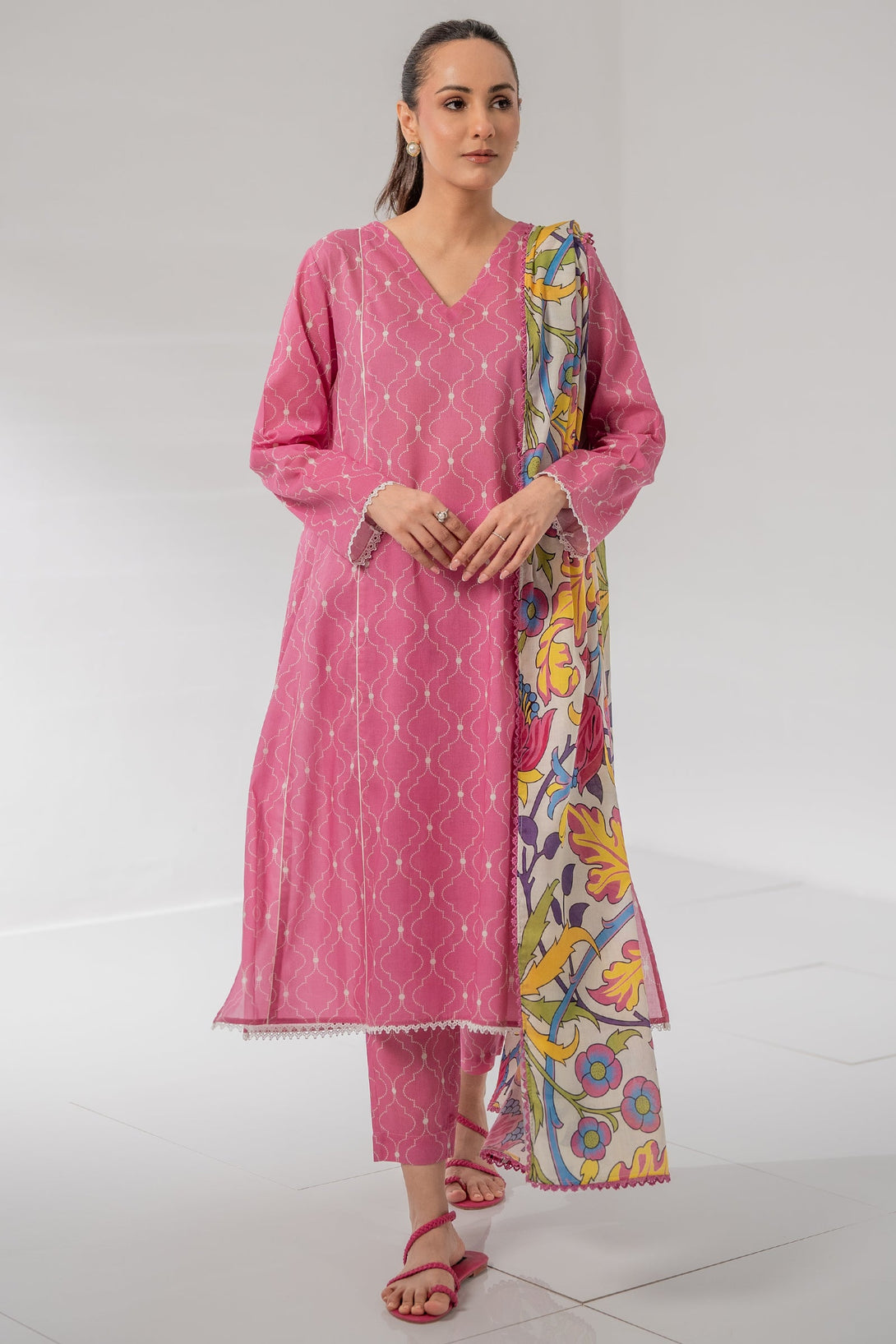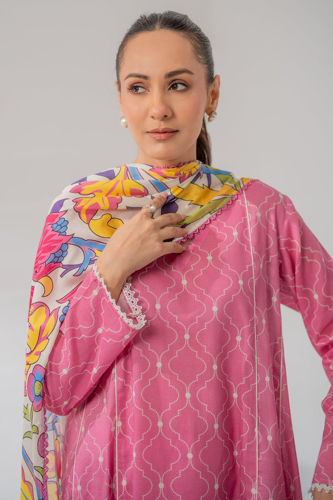 This pink colored lawn three-piece unstitched with beautiful digital print is perfect to have this season.