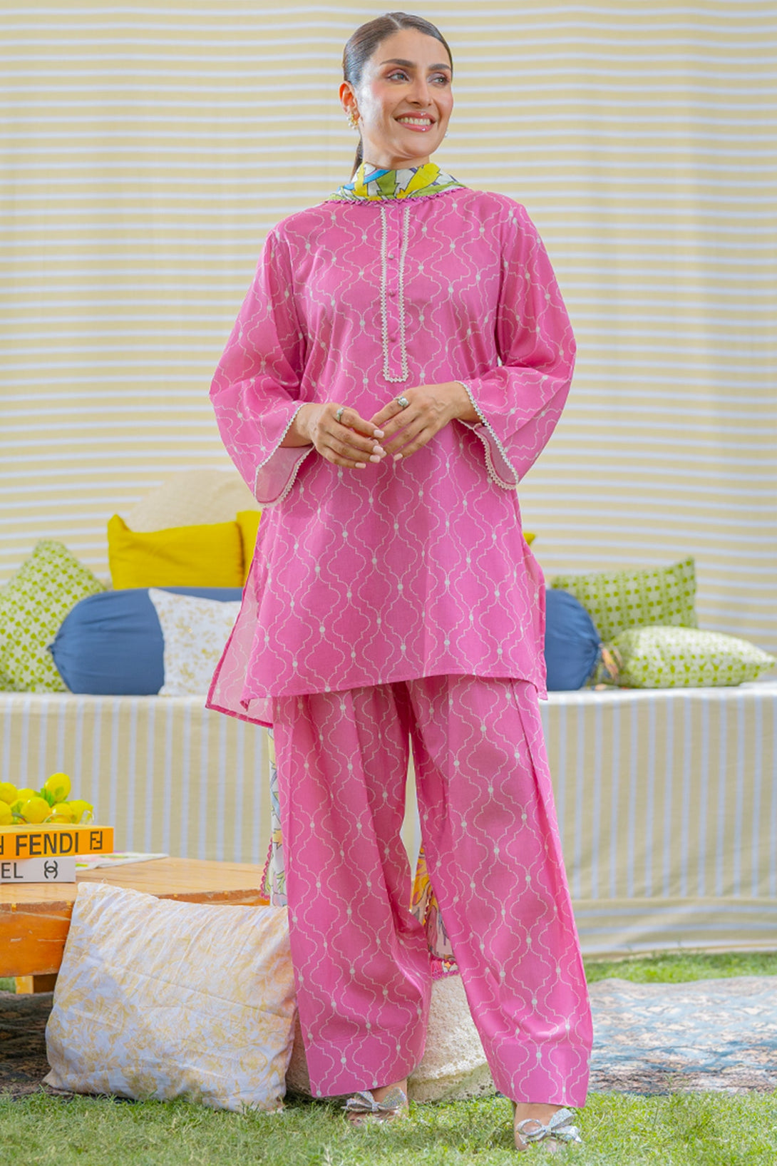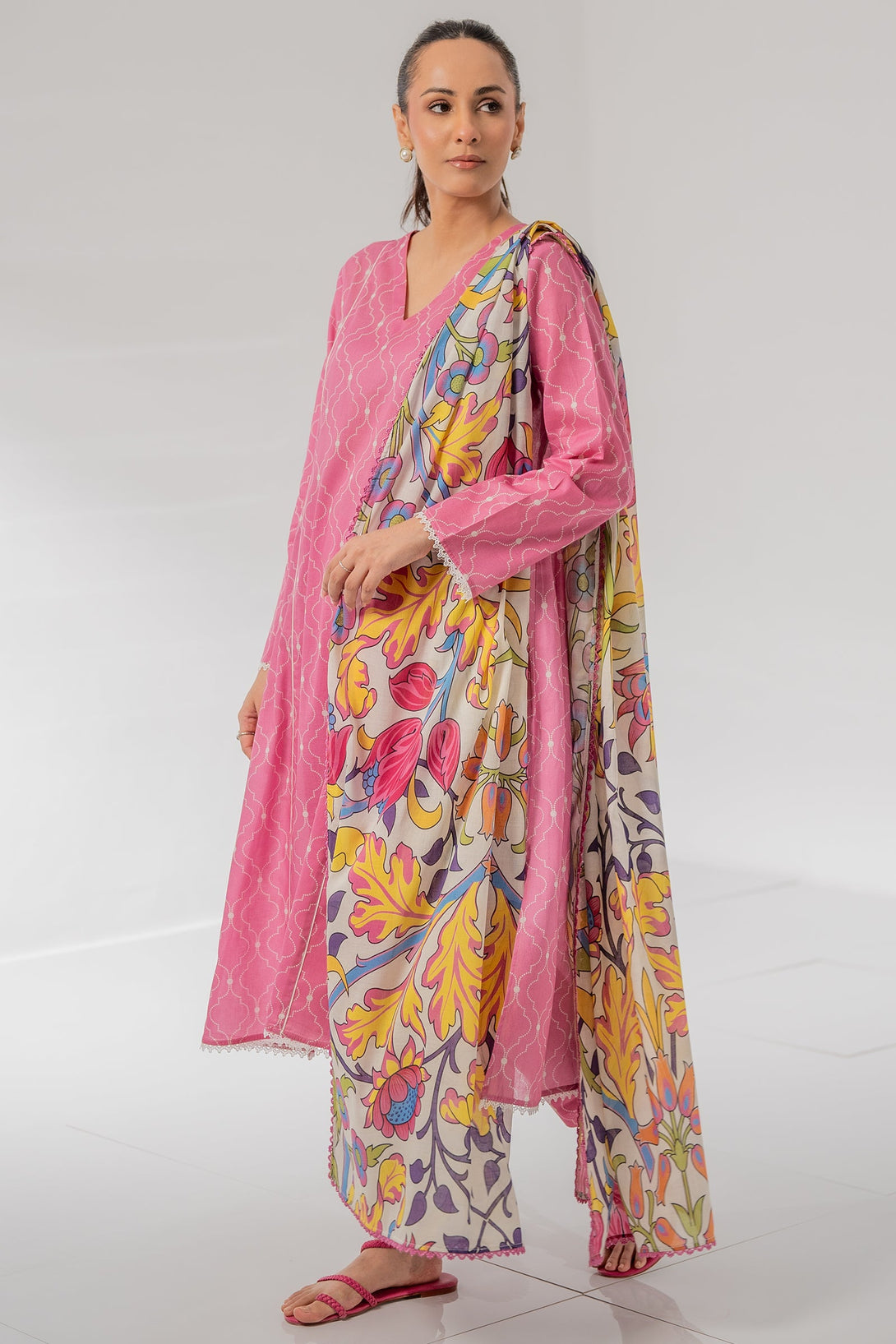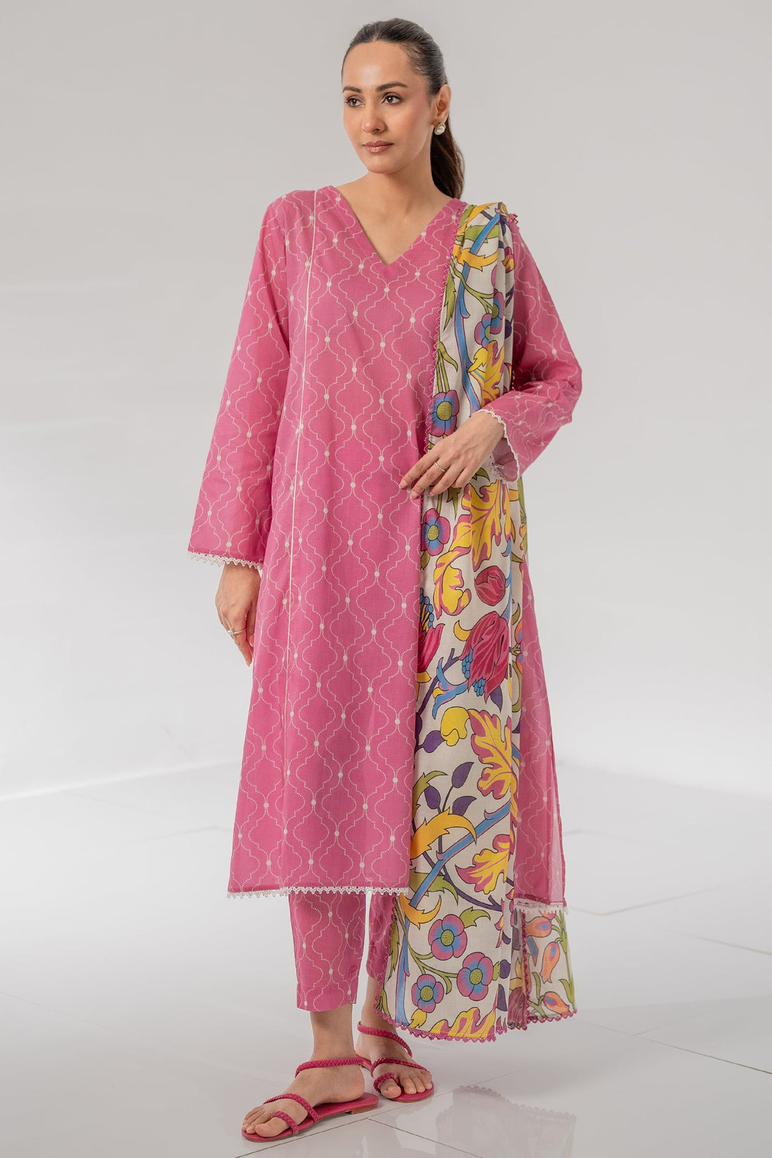 This pink colored lawn three-piece unstitched with beautiful digital print is perfect to have this season.