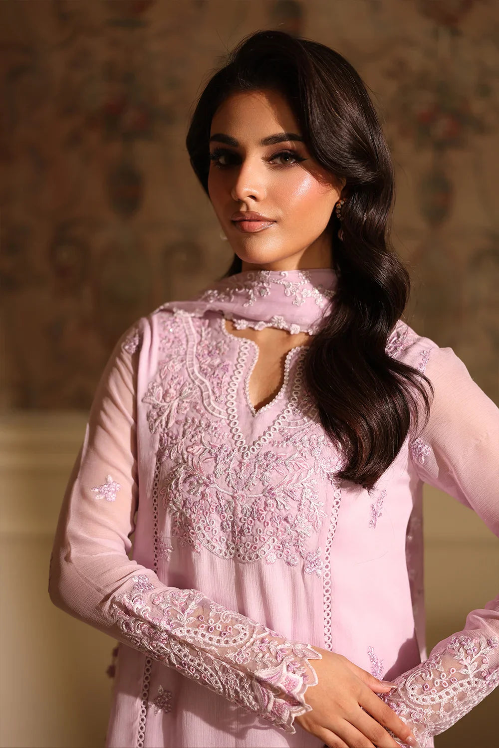 Orchid Whisper – A refined lilac chiffon ensemble that speaks of timeless elegance. Paired with a delicate sequin embroidered chiffon dupatta, it adds a touch of shimmer and sophistication. The look is completed with sleek straight pants, creating a poised and versatile silhouette that transitions effortlessly from festive gatherings to evening occasions.