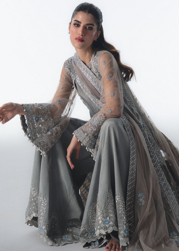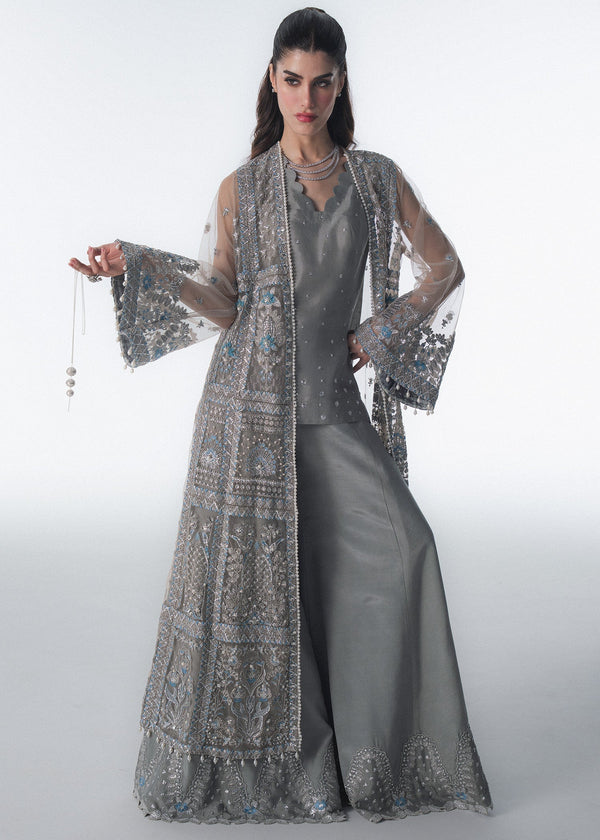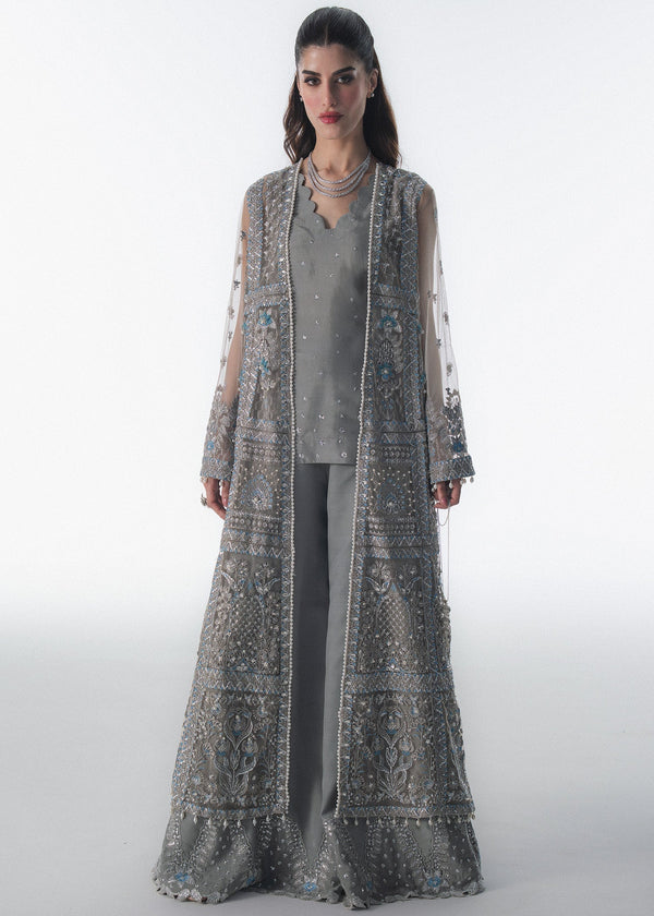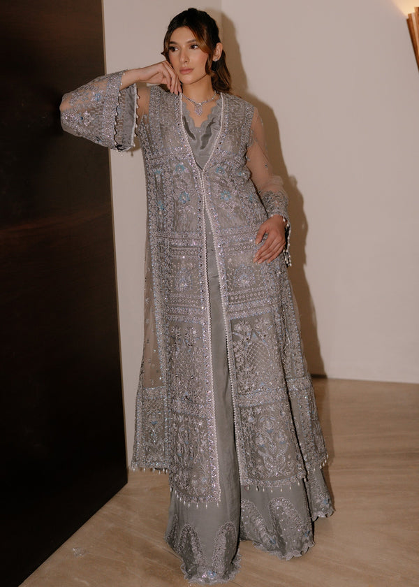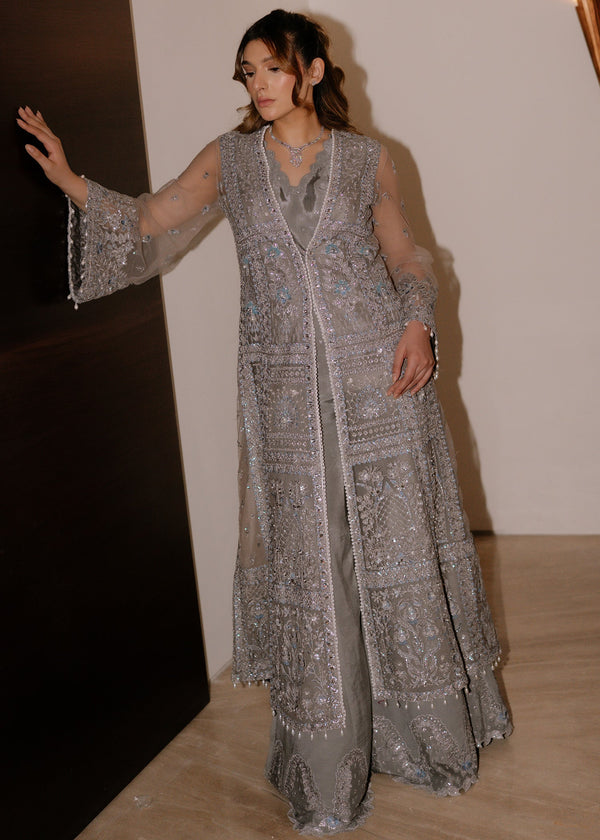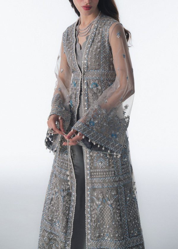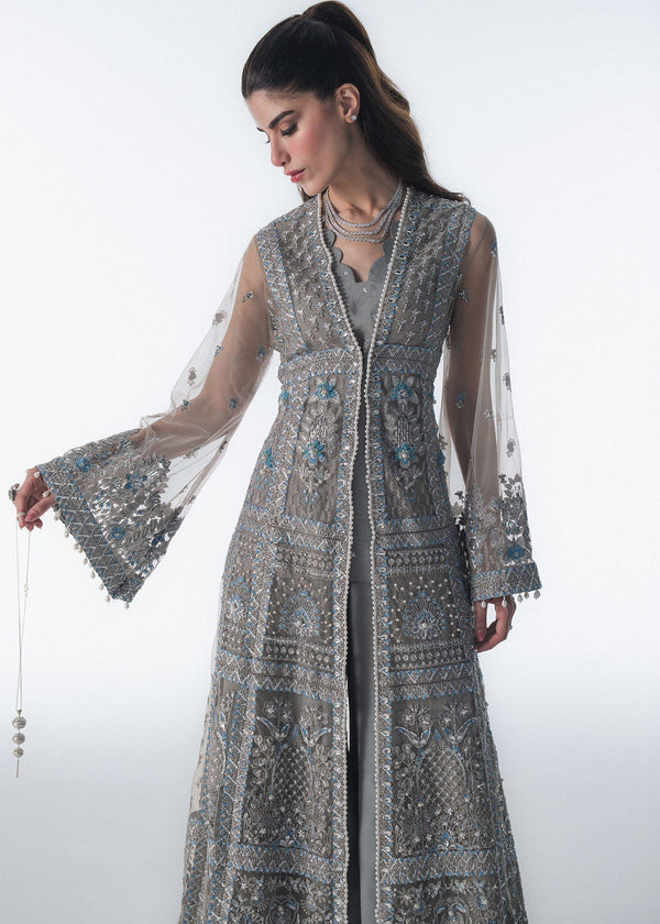 A floor length net jacket composed in a brickwork of beautiful motifs composed in a mix of floral and abstract patterns. Detailed by hand with soft steel blue petals and a generous dose of crystals, pearls and silver work. Paired with a silk slip that sparkles with clusters of sequin based florets . The set is completed with a framed net dupatta and a silk sharara accented with an embroidered floral border.