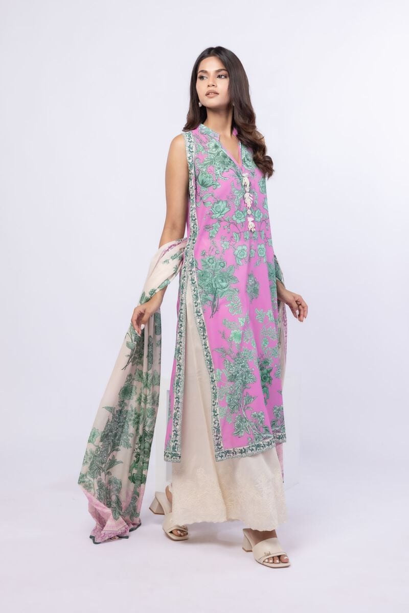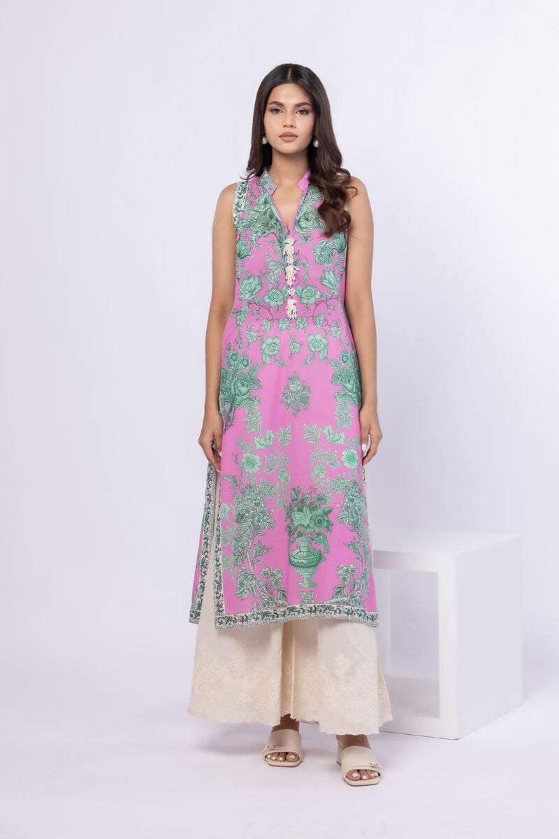 - Description: A long floral printed kurta featuring a sleeveless design, a band collar with a V-cut and embellishments on the front.