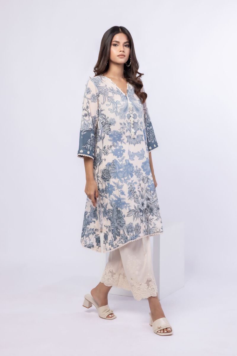 - Description: A long floral printed kurta featuring full sleeves with lace detailing, a neckline with a V-cut and embellishments on the front.