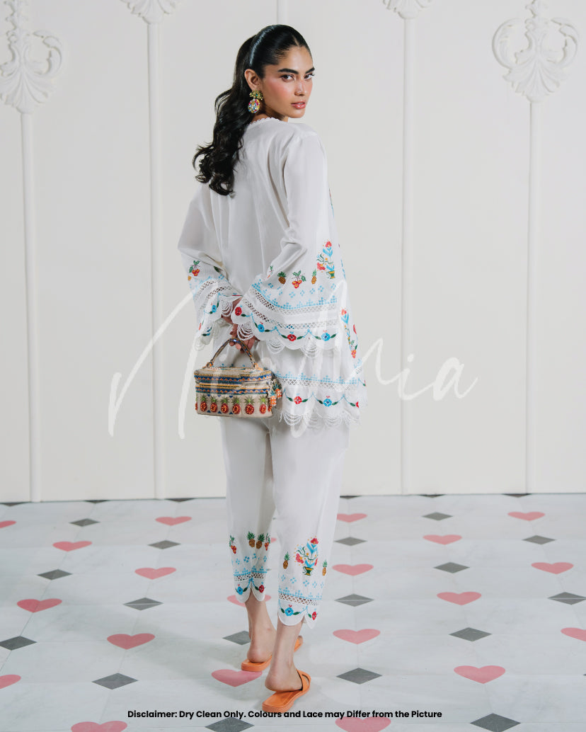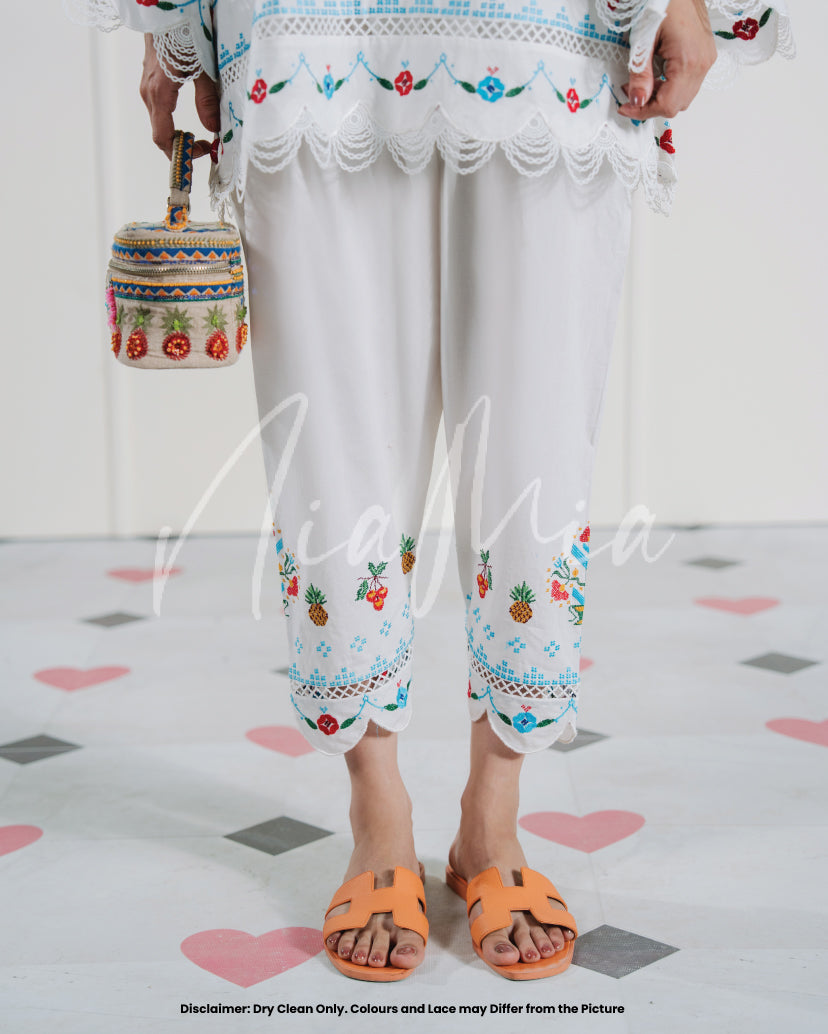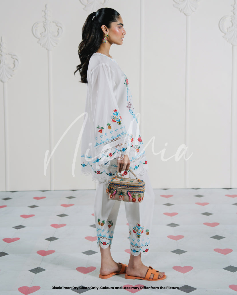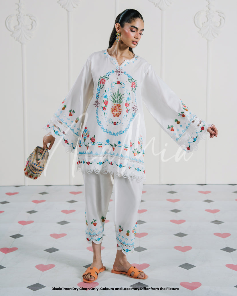 A breezy white lawn ensemble adorned with vibrant cross stitch embroidery, showcasing delicate florals and a bold pineapple motif at the center. The look is completed with a coordinating skinny shalwar featuring matching embroidered accents.