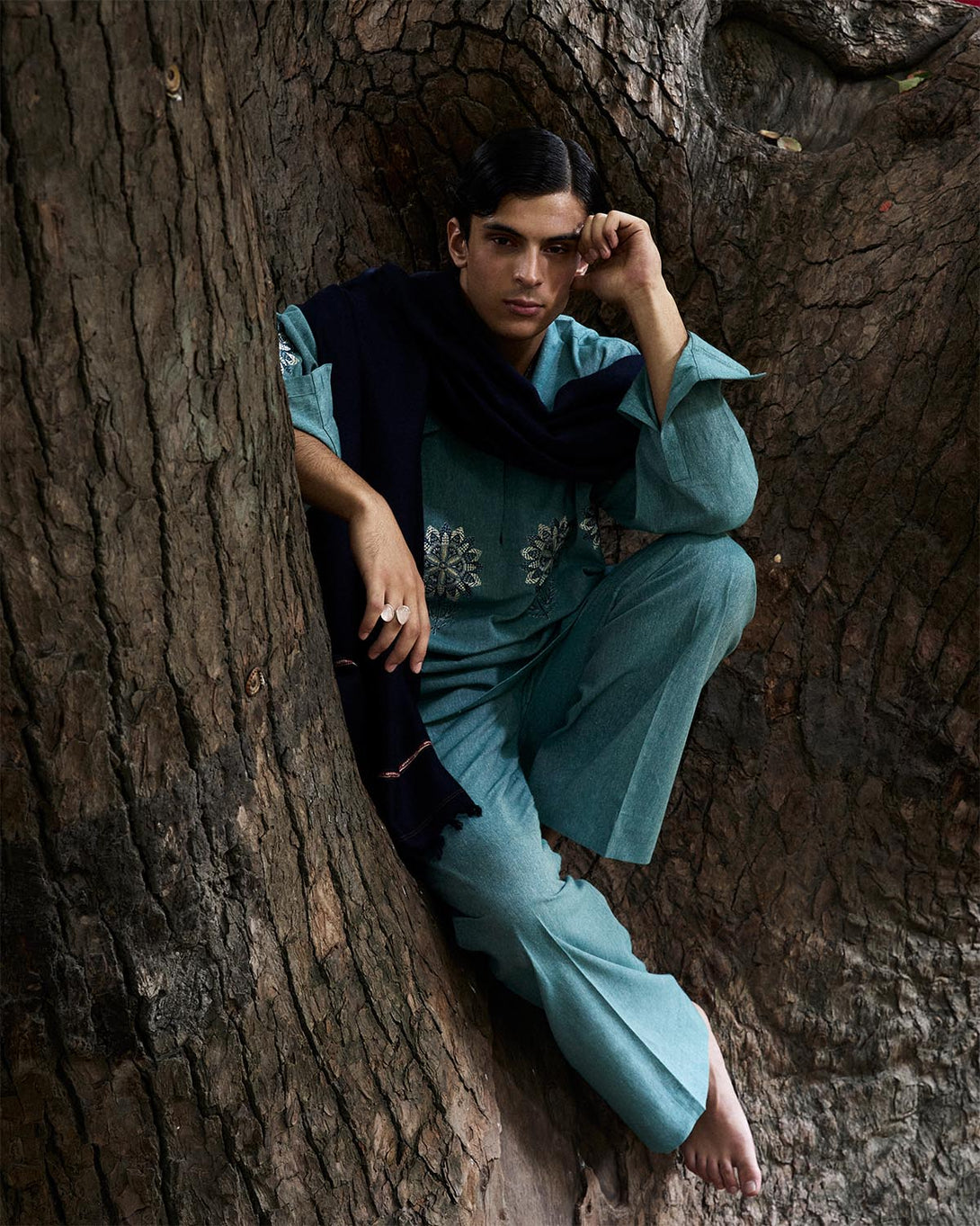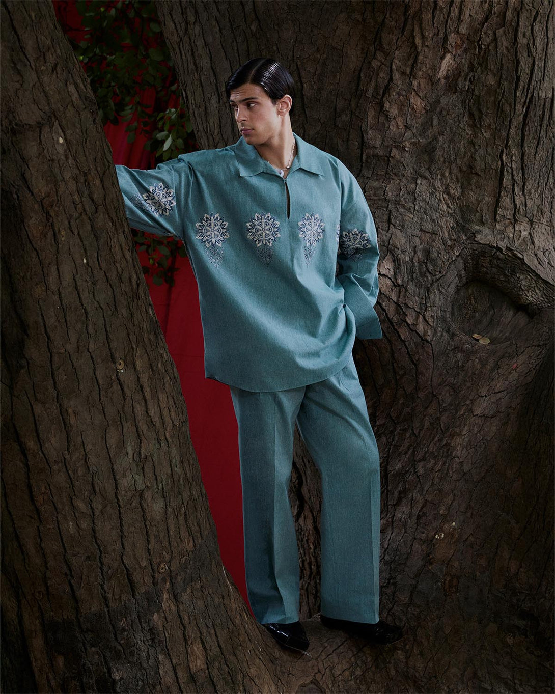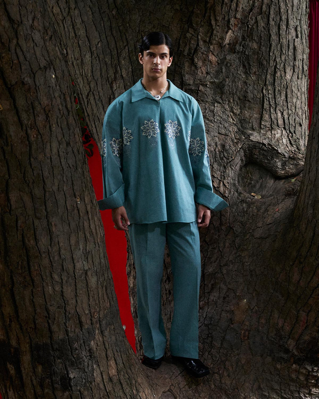 Description: A shirt and pants set elevated with monochrome floral embroidery. Understated yet striking, it celebrates clean lines, timeless femininity, and the quiet poetry of detail.