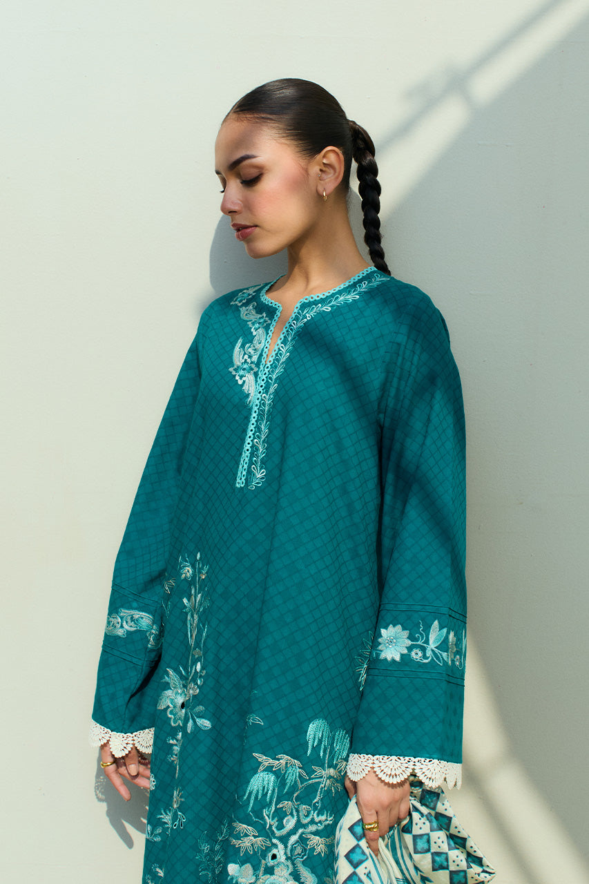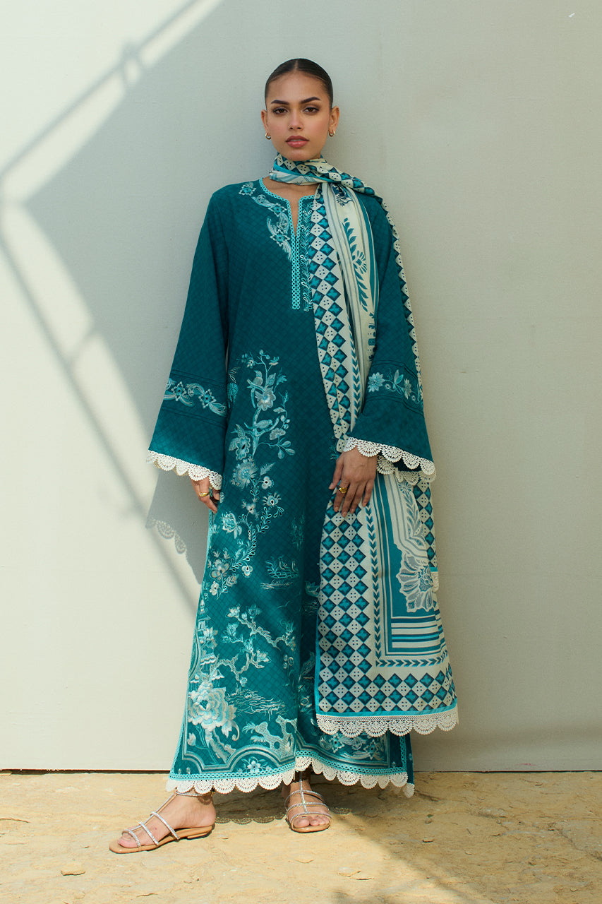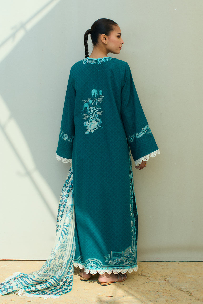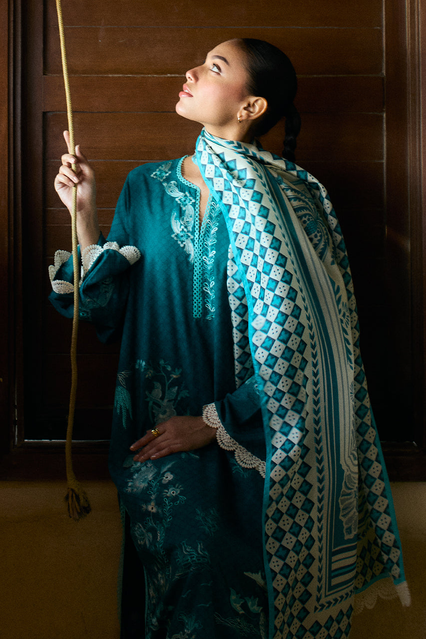 A deep teal toned jacquard lawn kurta showcases a beautifully embroidered botanical landscape on the front panel, accented with subtle eyelet details for a touch of elegance. Complementing the kurta is a pure medium silk dupatta in ivory and teal hues, adorned with a signature geometric border and an artistic painterly print at its center. Paired with matching embroidered jacquard lawn trousers for a polished look.