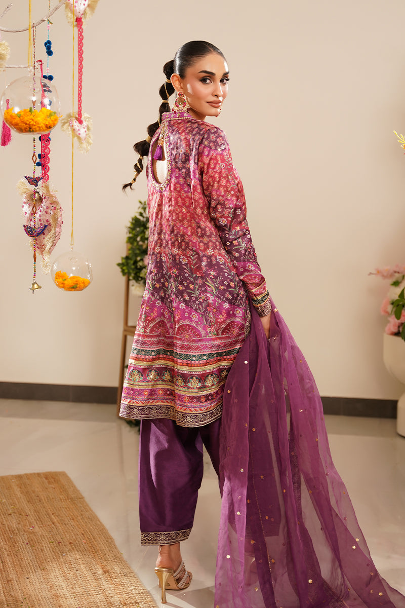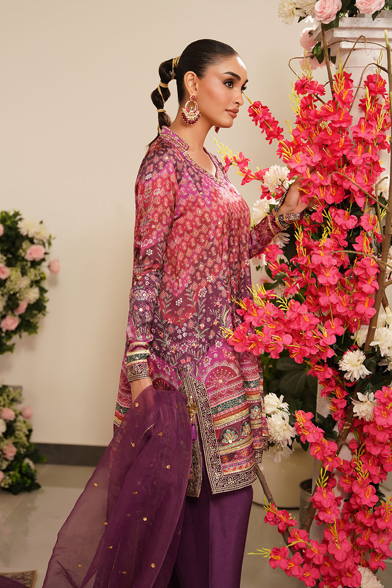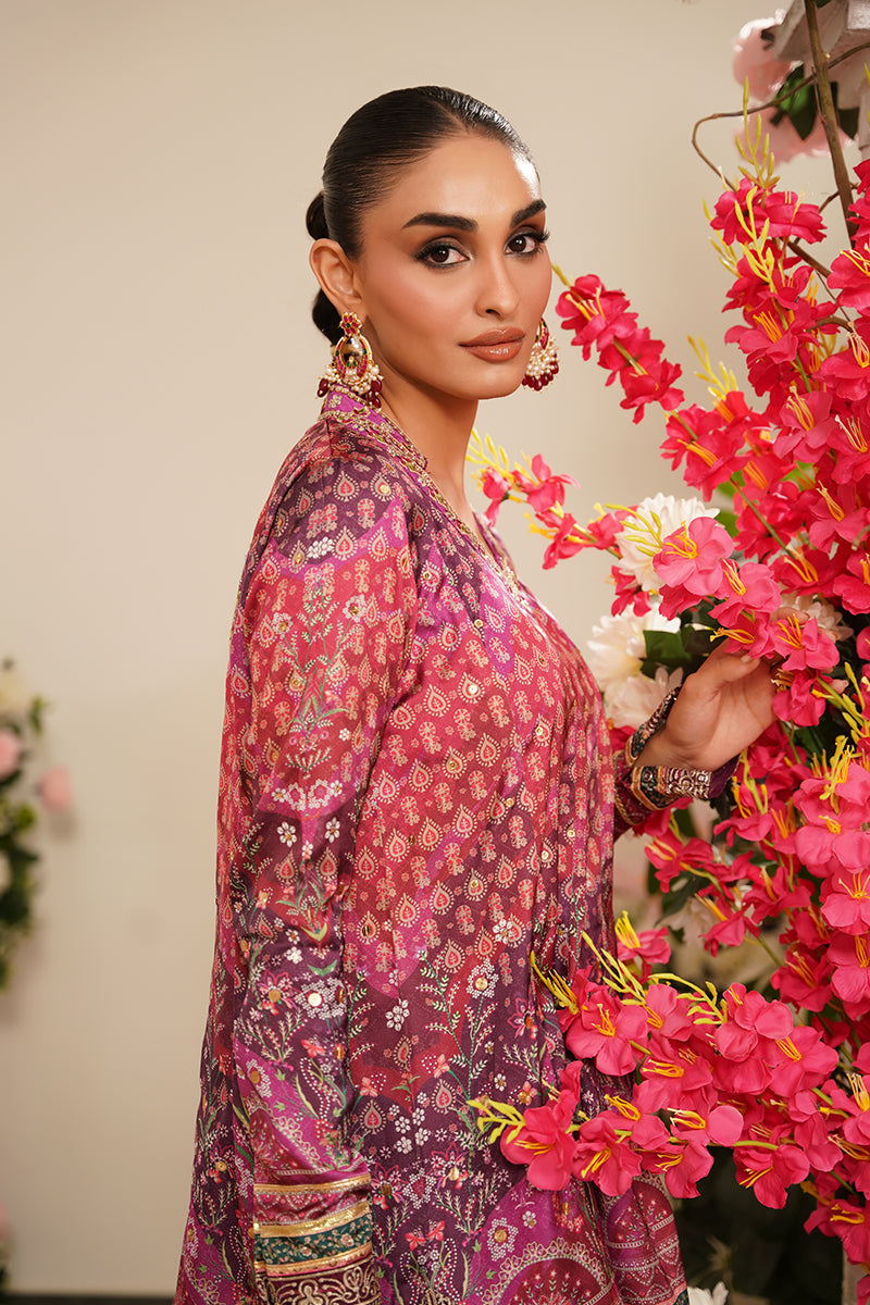 Grace meets glamour in this stunning plum-printed kalidar, crafted from luxurious charmeuse silk. The rich plum base is brought to life with intricate all-over embellishments, adding subtle sparkle and depth to the flowing silhouette of this short kalidar. The fabric’s natural sheen enhances the print, making it perfect for festive and semi-formal occasions. Paired with a tailored pure raw silk shalwar, the look is completed with zari border detailing, adding a touch of traditional elegance and structure. For an elevated ensemble, an organza chan dupatta with delicate zari borders is available as an add-on, offering a soft, ethereal finish to this beautifully curated outfit.