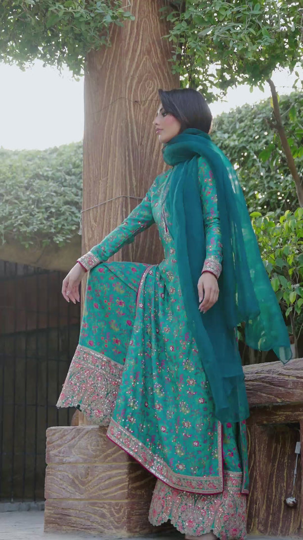 Digitally printed teal shirt crafted from pure raw silk, giving the ensemble a rich texture and luxurious finish. The shirt is enhanced with delicate hand embellishments, adding subtle sparkle and intricate detailing that elevate its overall appeal. Paired with the shirt is a matching digitally printed pant made from premium PK raw silk fabric, featuring tasteful prints that complement the shirt perfectly while maintaining a graceful silhouette.Completing the look is a lightweight organza dupatta that adds sophistication and movement.