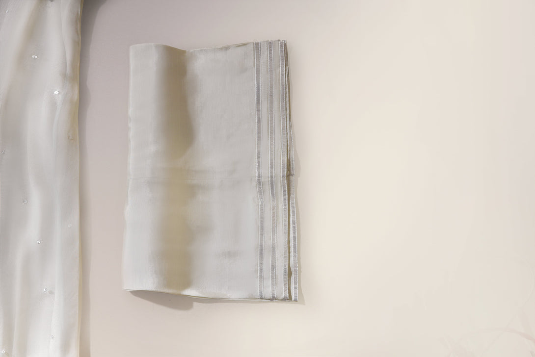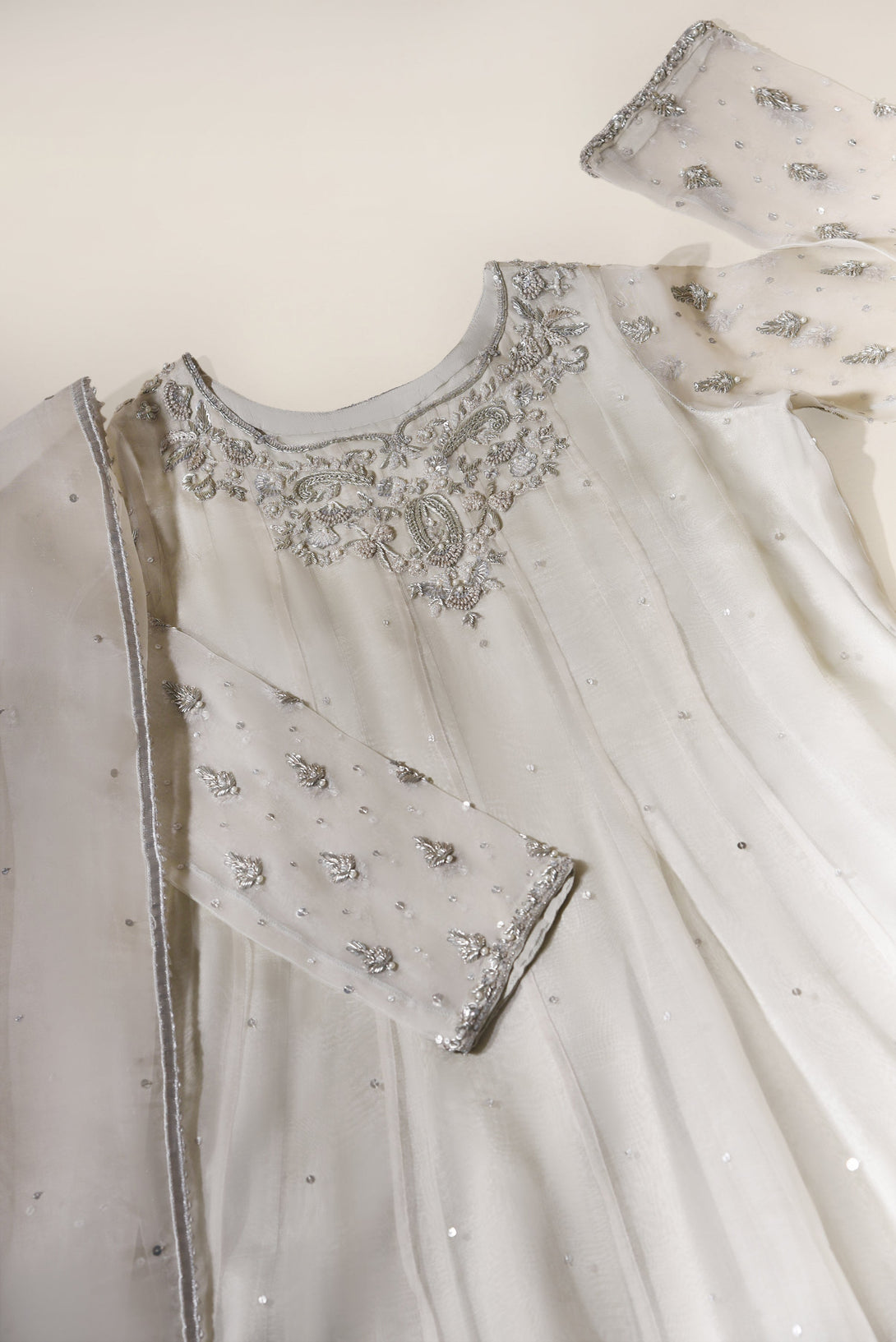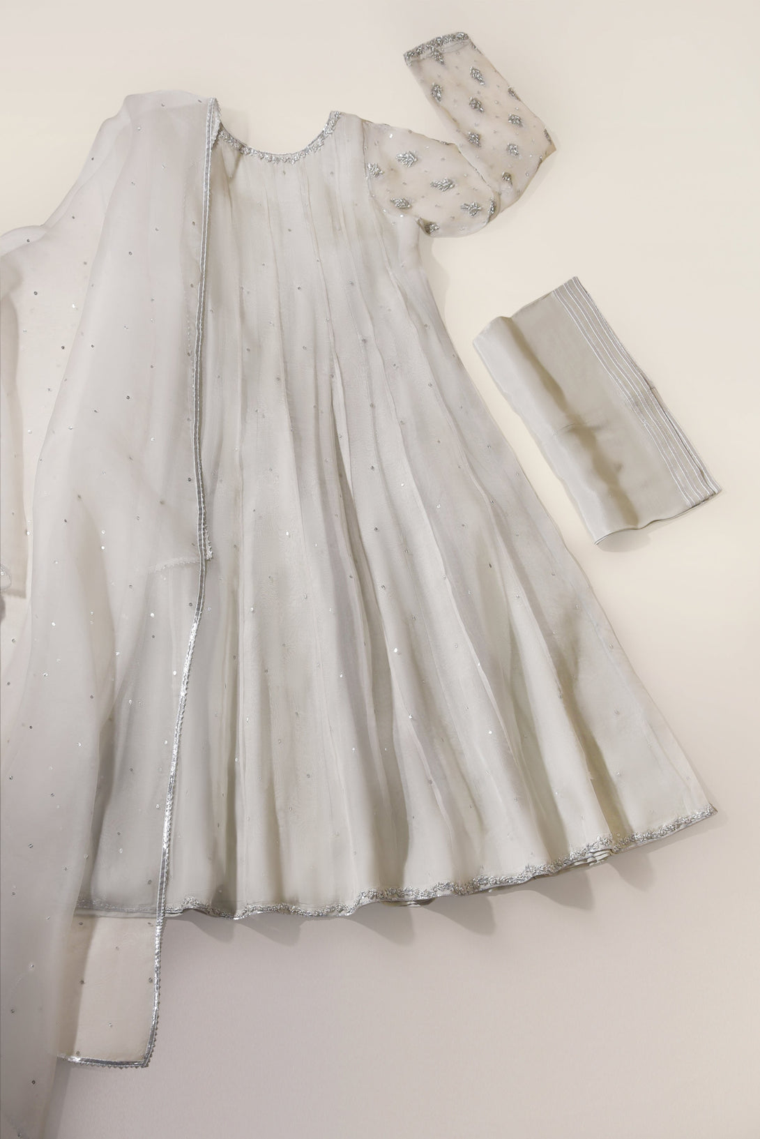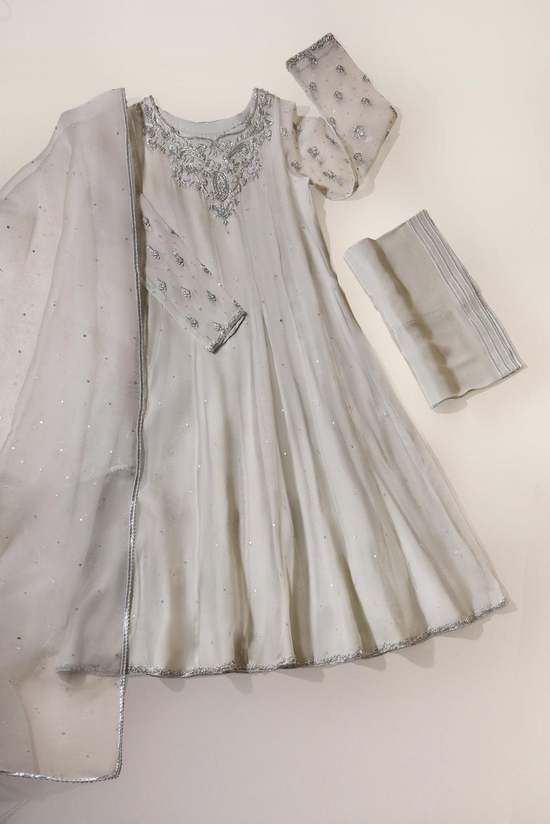 Curated on pure soft organza in a pretty feminine pastel grey hue, this absolutely gorgeous three piece features silver hand/ada work done by our expert artisans on the neckline on a long panelled kalidaar silhoutte. A meticulous design for your festive events. The length of the long kalidaar is 48 inches.