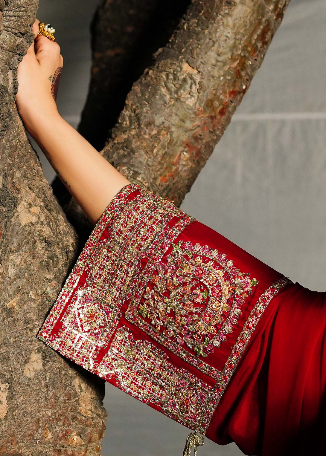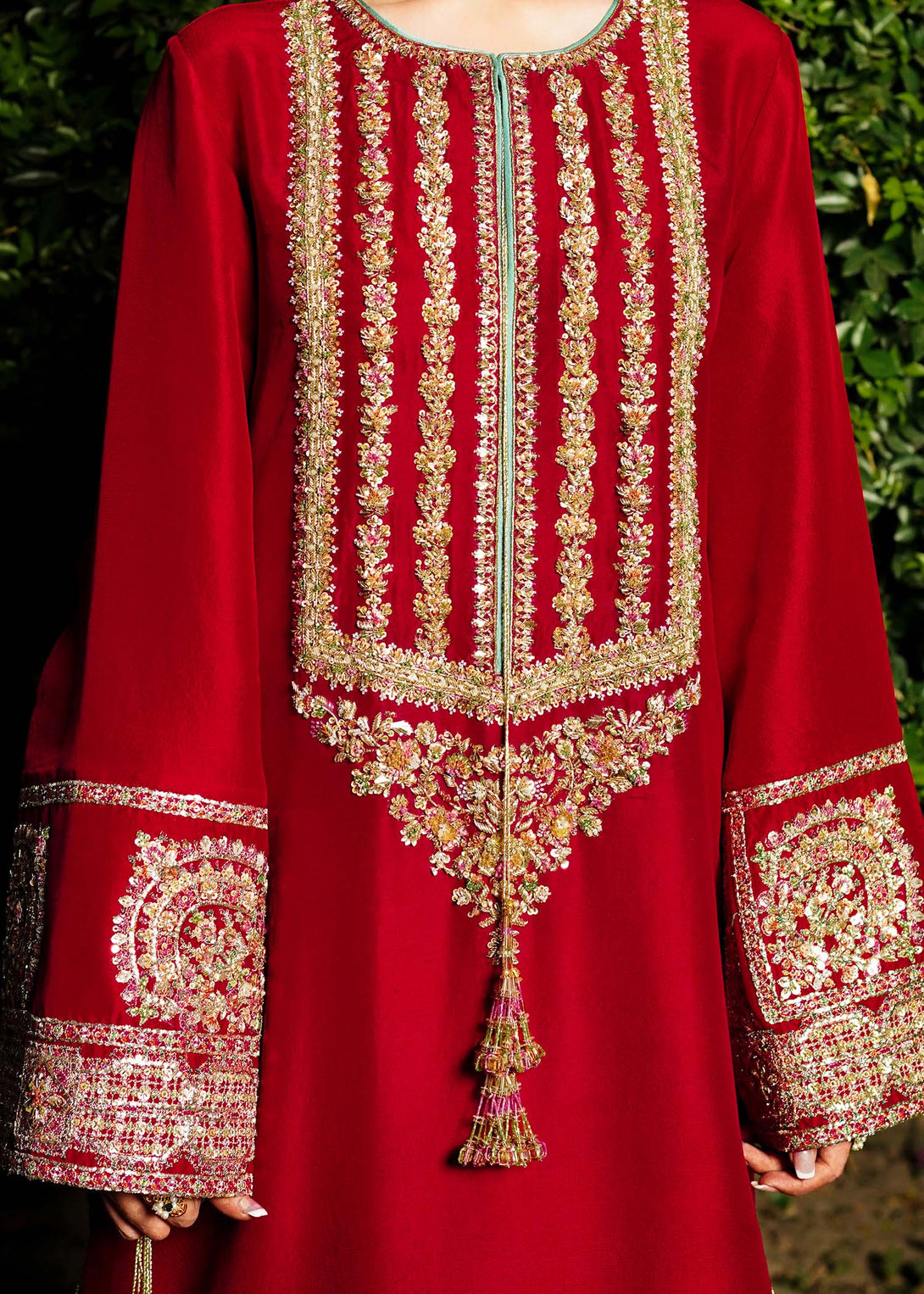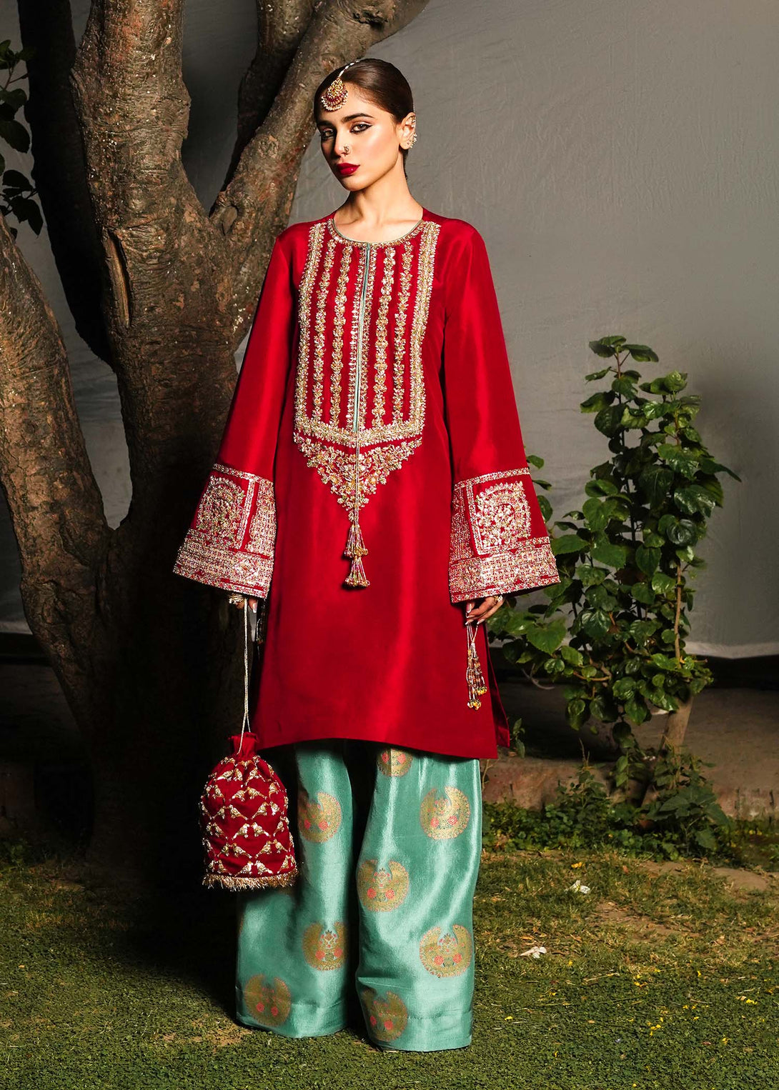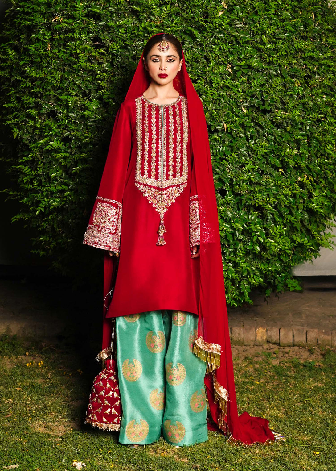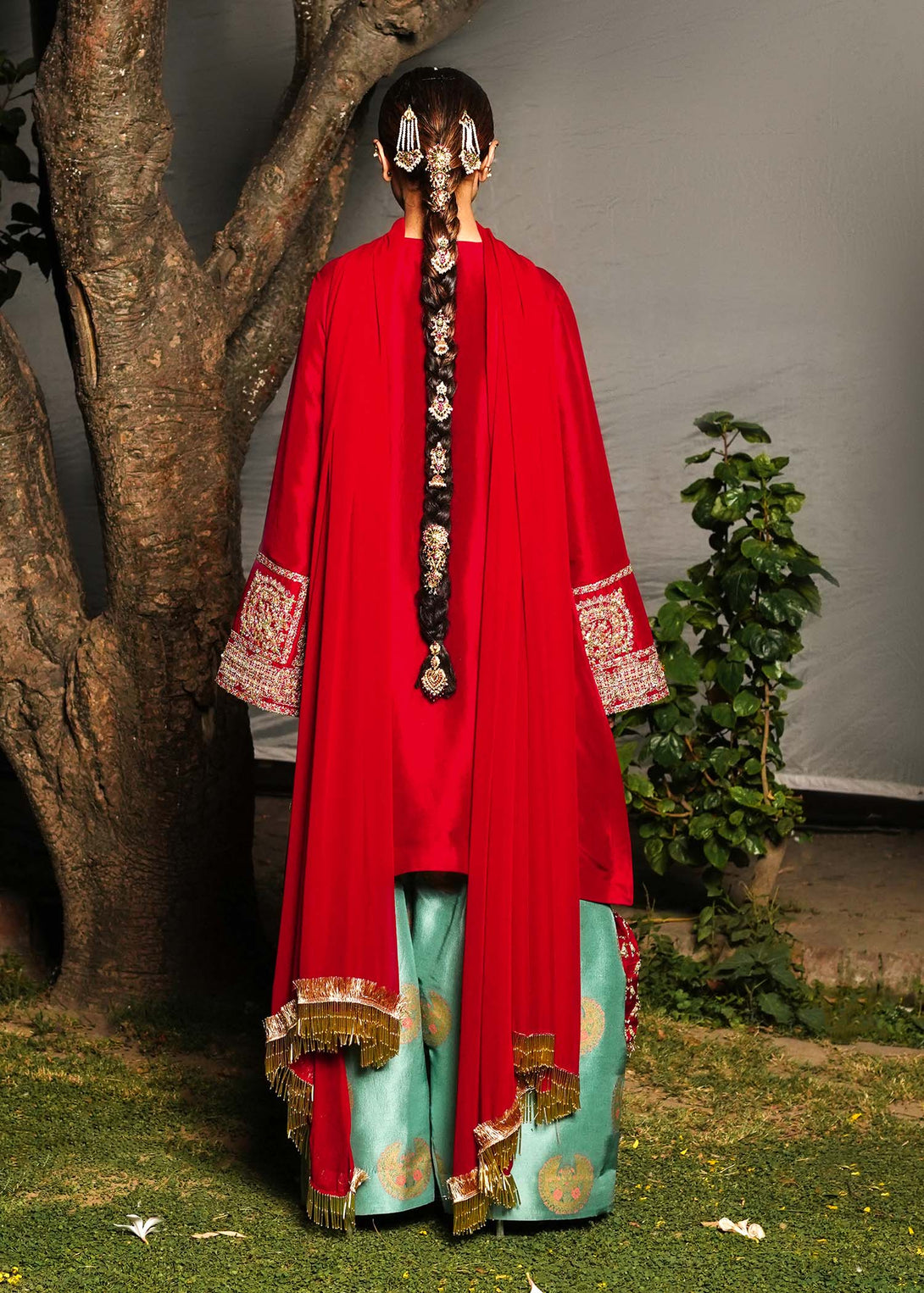 An exquisite red raw silk shirt with intricate embellishments of golden, Mint, green, orange and pink buggle beads, golden nakshi, golden dabka and gold sequins on neckline with embroidered and embellished sleeves with pita work detailing and tassels to make it more appealing. It is paired with ice blue screen printed motifs all over. The outfit contains 3 yards chiffon dupatta with kiran and golden pipe hangings on both ends.