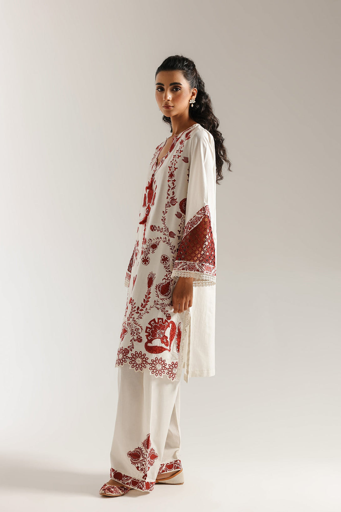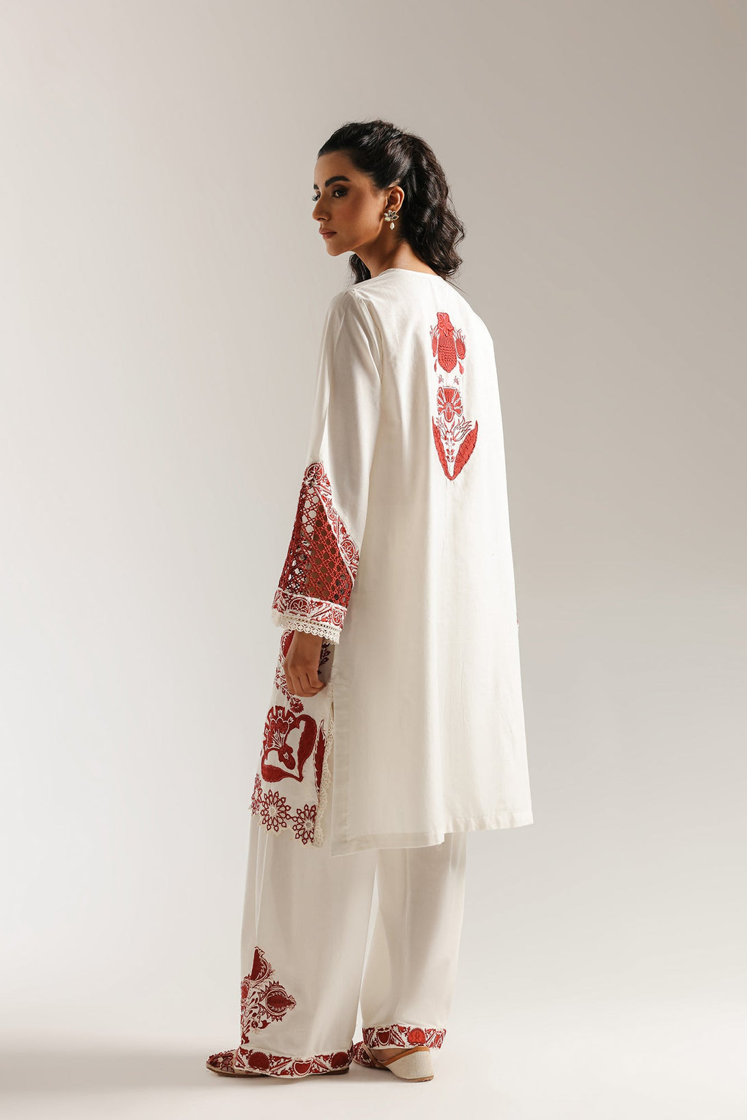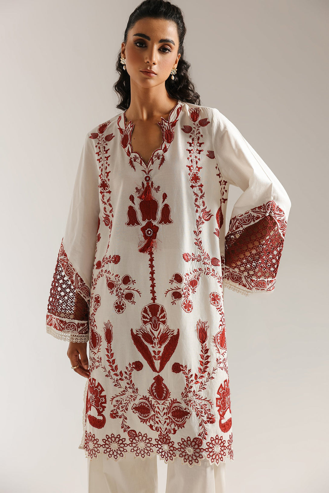 Immerse yourself in a tapestry of exquisite craftsmanship. This elegant suit is a masterpiece of traditional artistry, featuring a rich, deep red embroidery on a crisp off-white canvas. The shirt boasts intricate floral and folkloric motifs, while the striking bell sleeves and wide-leg shalwar are adorned with matching detail. Finished with delicate tassels at the neckline, this ensemble is a celebration of timeless design and refined sophistication.