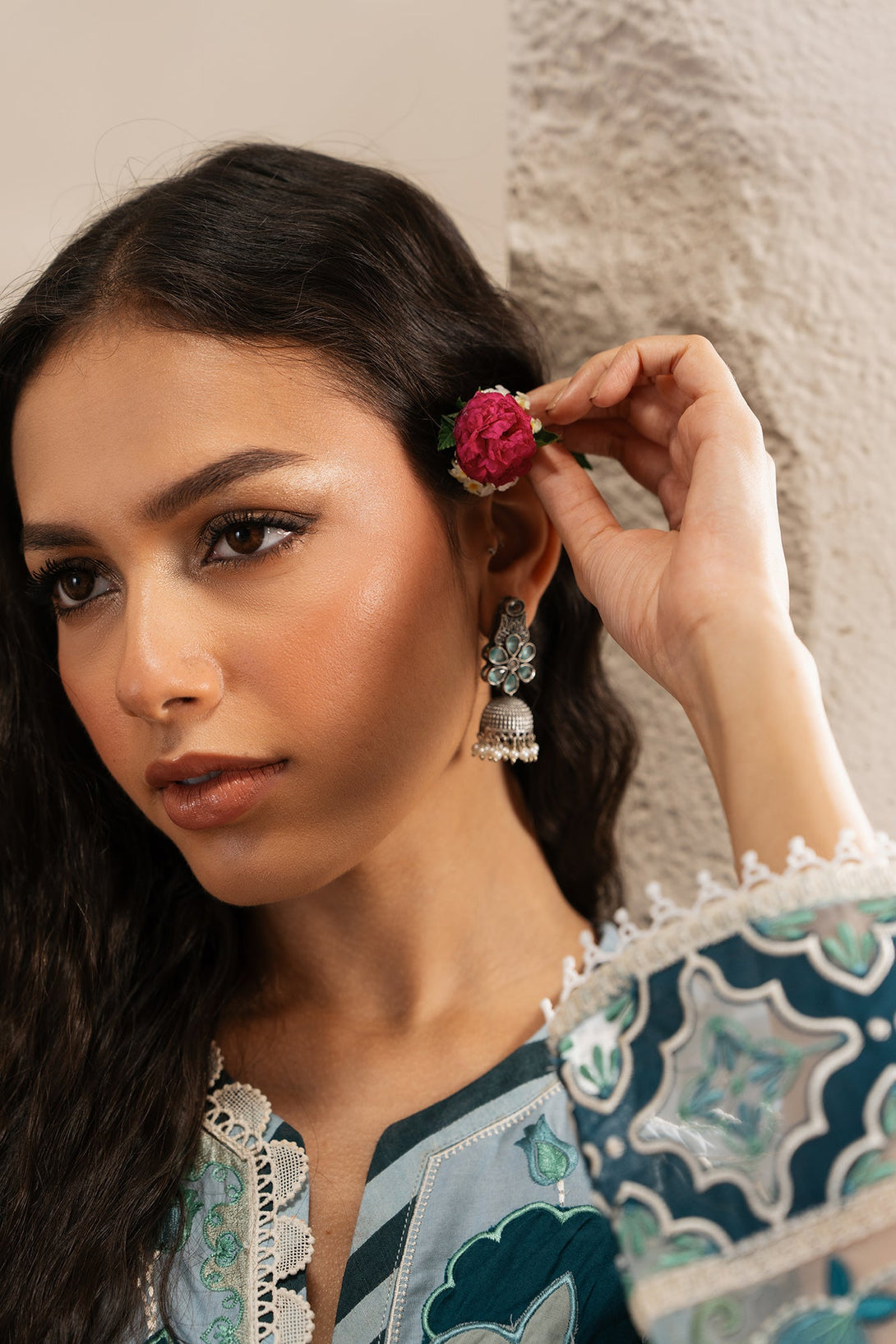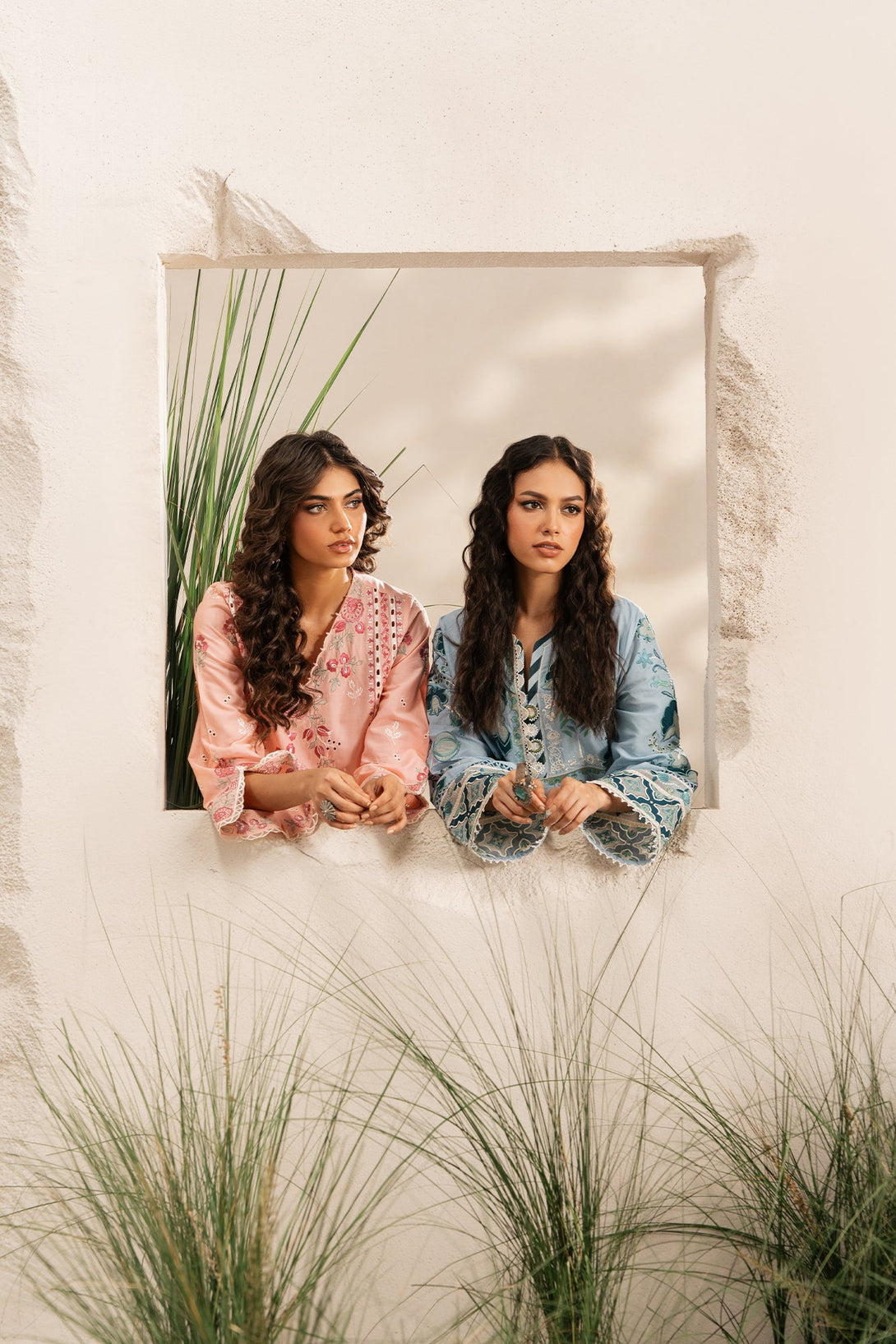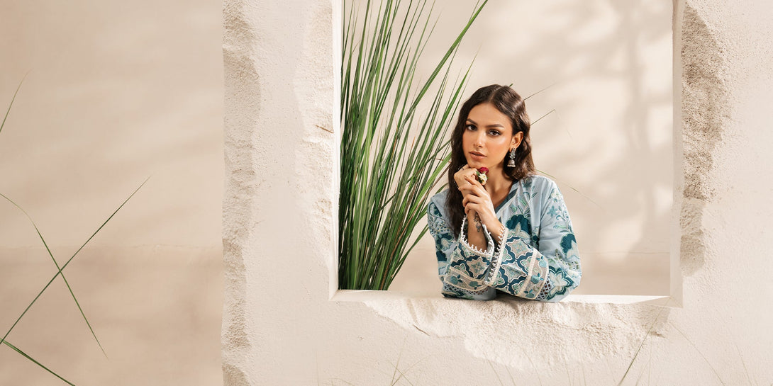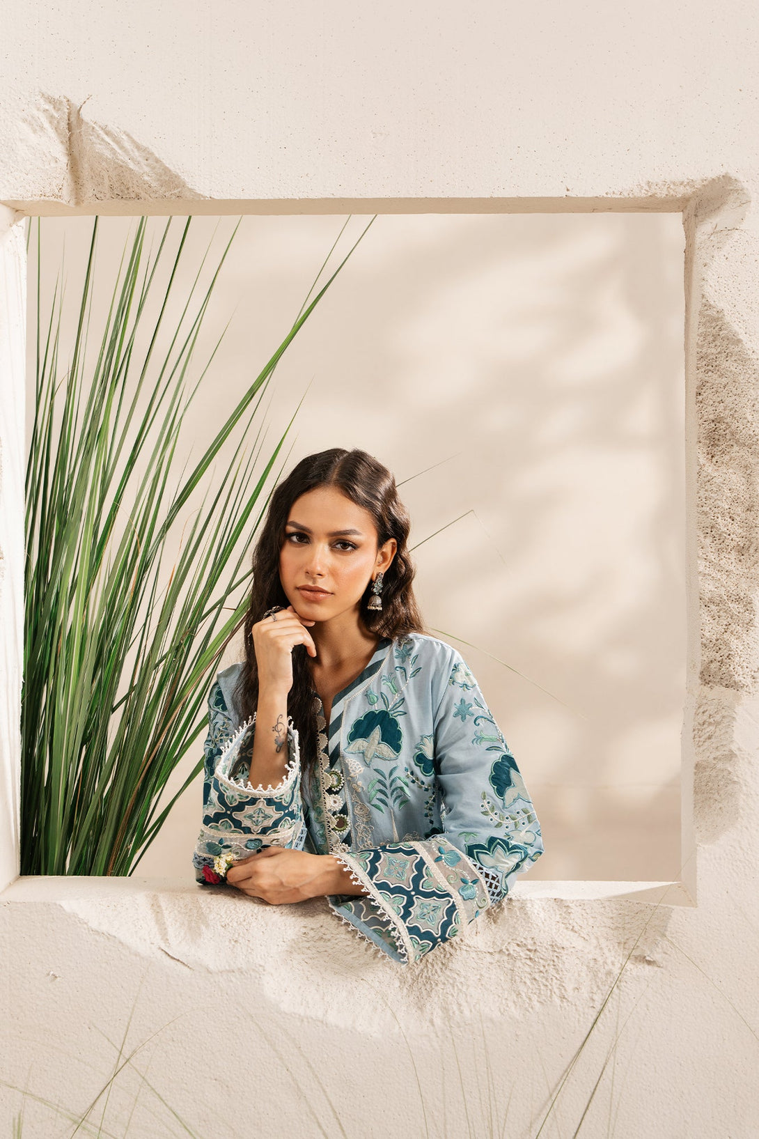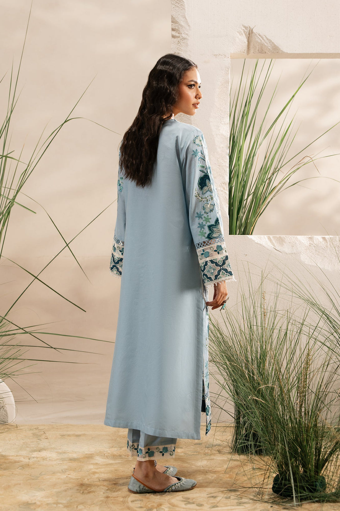 Unleash a serene and artistic spirit with this captivating embroidered suit. The light blue fabric is a delicate canvas for a beautiful mix of floral, geometric, and landscape-inspired prints and intricate embroidery. The classic silhouette of the long-sleeved kurta is perfectly complemented by the detailed patterns on the trousers, creating a modern and elegant ensemble that is a celebration of texture and design.