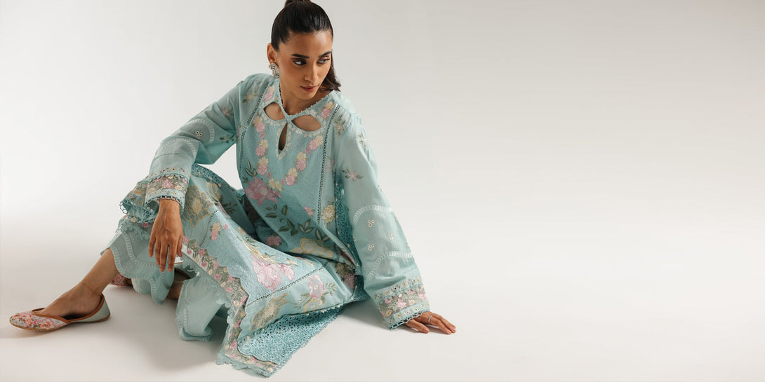 Float into a realm of serene sophistication with this stunning embroidered suit. The light, airy blue fabric is a delicate canvas for intricate floral embroidery in shades of pale pink, yellow, and green that gracefully adorn the front and sleeves. Elegant lace trim and scalloped cutouts on the neckline and hem add a touch of refined artistry, while the coordinating trousers complete this beautiful and ethereal ensemble. This suit is the perfect blend of traditional craftsmanship and modern elegance.