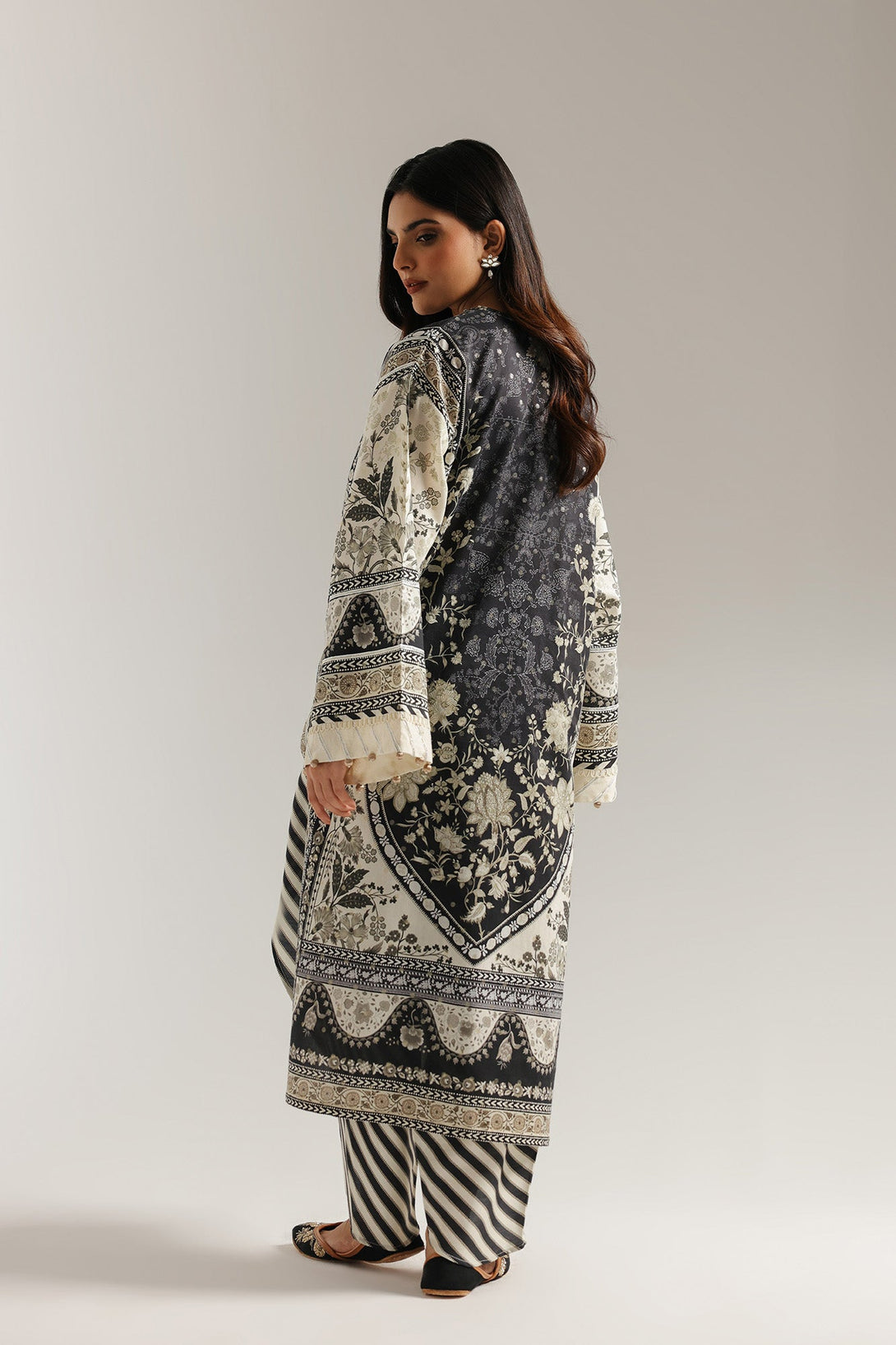 This breathtaking suit is a masterpiece of black and off-white, a testament to timeless elegance. Crafted from luxurious fabric interwoven with shimmering zari, it catches the light with every movement. The long, flowing shirt features a striking floral and ornamental print, with a beautifully detailed neckline and a densely patterned placket. The wide sleeves and hem are finished with intricate borders that echo the design. It is perfectly paired with striped tulip trousers, creating a cohesive and sophisticated ensemble.
