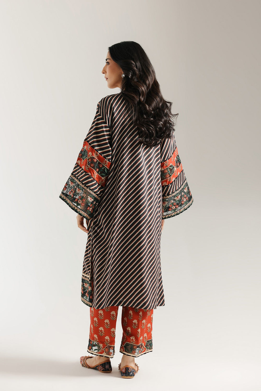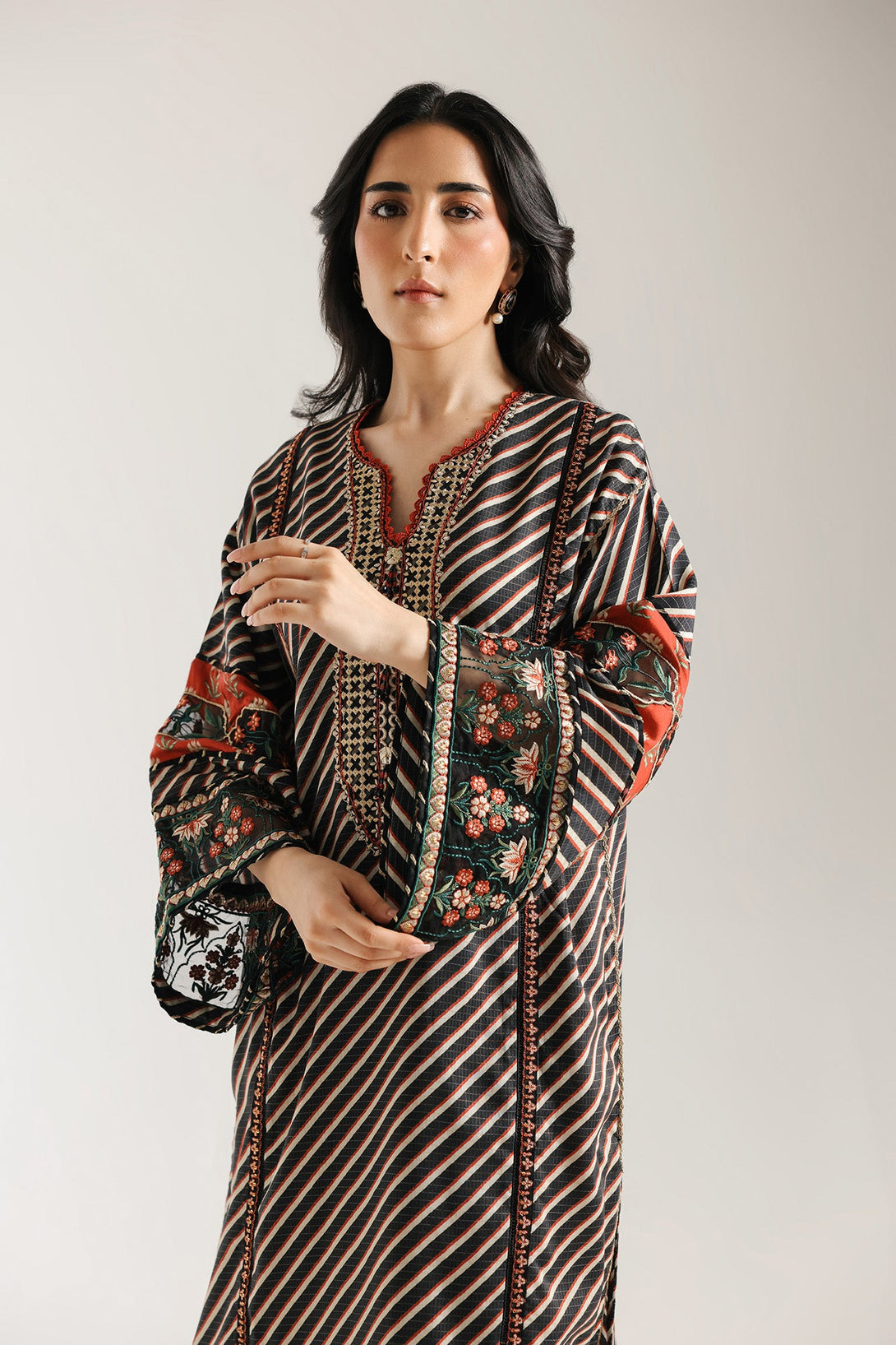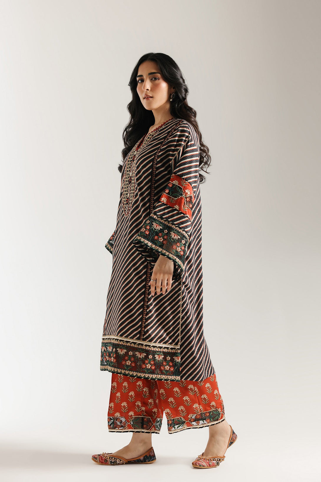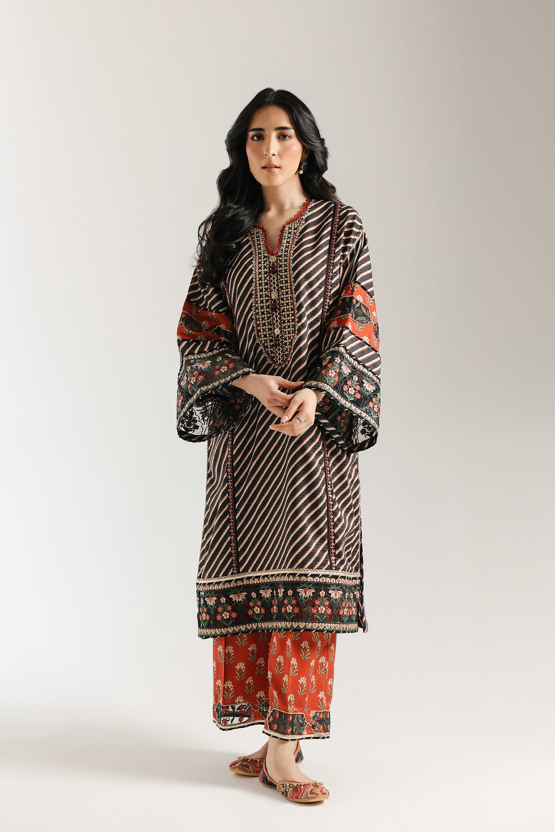 Embrace the rich tapestry of tradition. This striking embroidered suit features a captivating blend of patterns, with bold red stripes forming the base of the shirt. Intricate floral embroidery in vibrant reds, greens, and blacks adorns the borders, adding a touch of timeless elegance. This ensemble is a celebration of detailed craftsmanship and vibrant design, perfect for making a sophisticated statement.